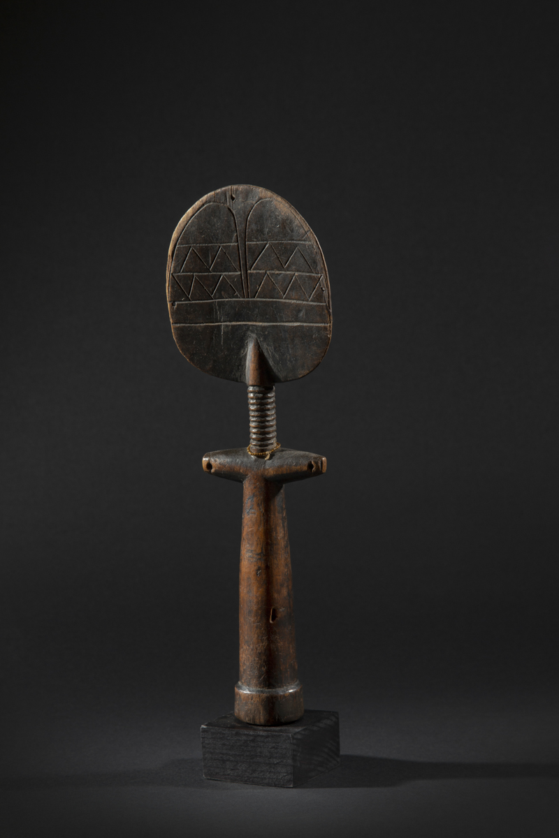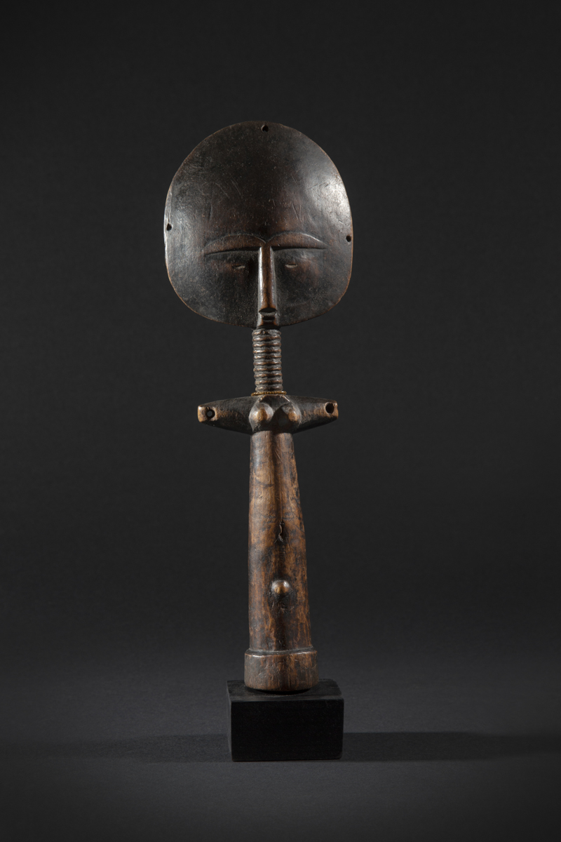 This type of Ashanti figure is called akuaba. It represents youth and fertility. Such carved figures were said to facilitate the conception of a child and ensure safe delivery at birth. Ashanti (Akan) women carried the dolls with them at all times. They treated them as if they were living babies, cuddling them, dressing them up, etc.