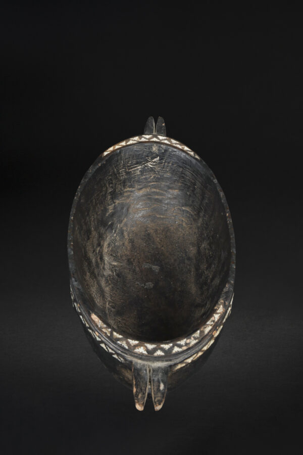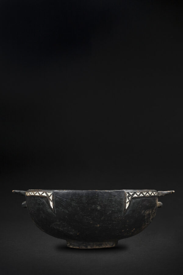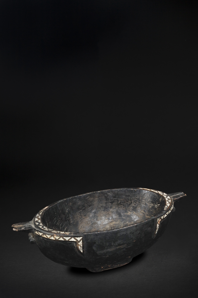 Wooden bowls from the Solomon Islands are made from a light wood, stained black with plant juice mixed with charcoal. As noted by the Museum of New Zealand Te Papa Tongarewa, they come in a great range of sizes and shapes, from small plain bowls which might hold only a few yams, to very large bowls used at feasts, often to serve the portions set aside for chiefs or visitors. Nautilus shells were usually used for the inlay on smaller bowls. One of the criteria by which a master carver was recognised was his skill in cutting and placing the shell pieces on the bowl.