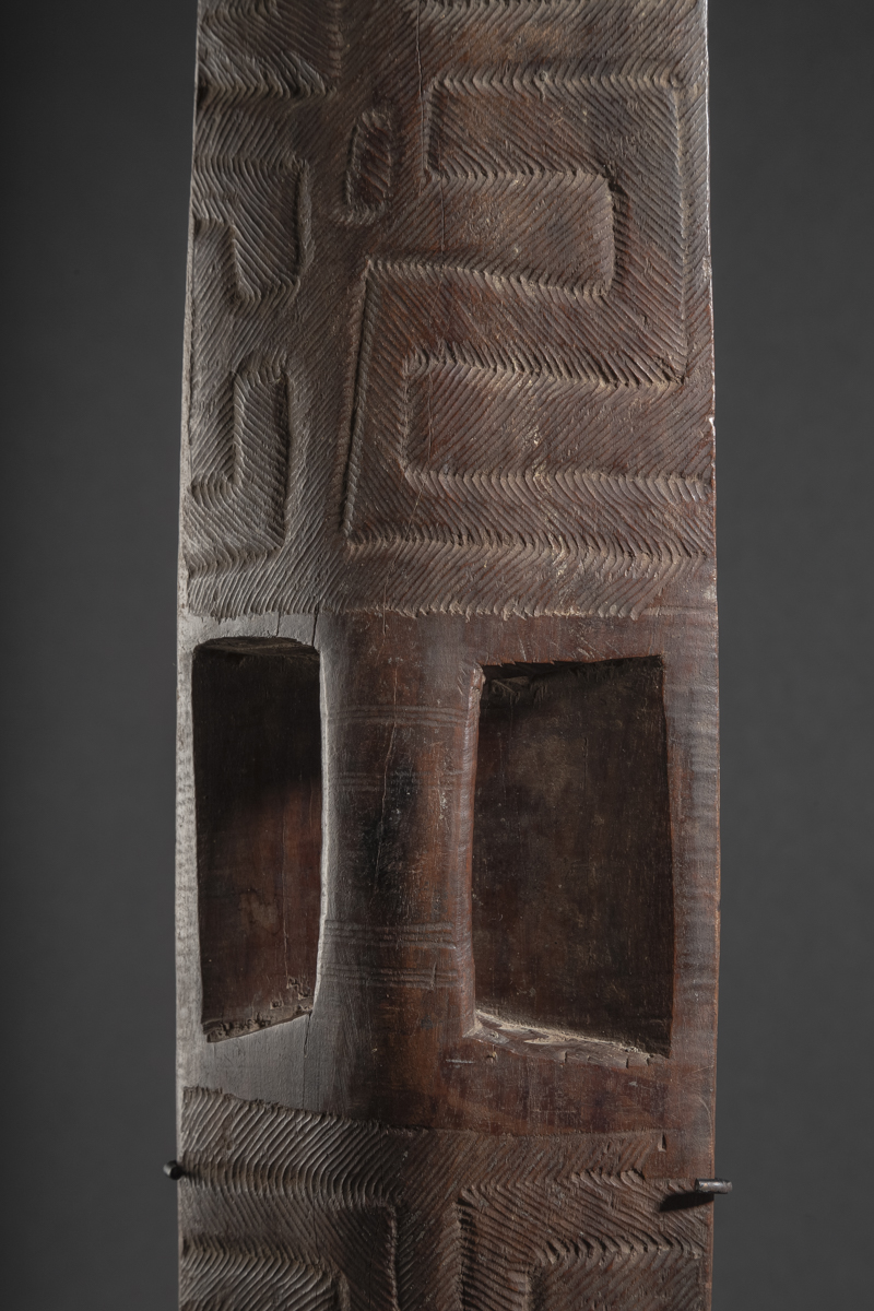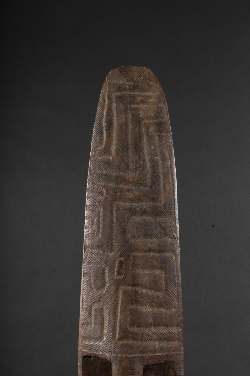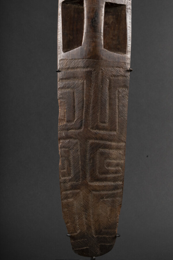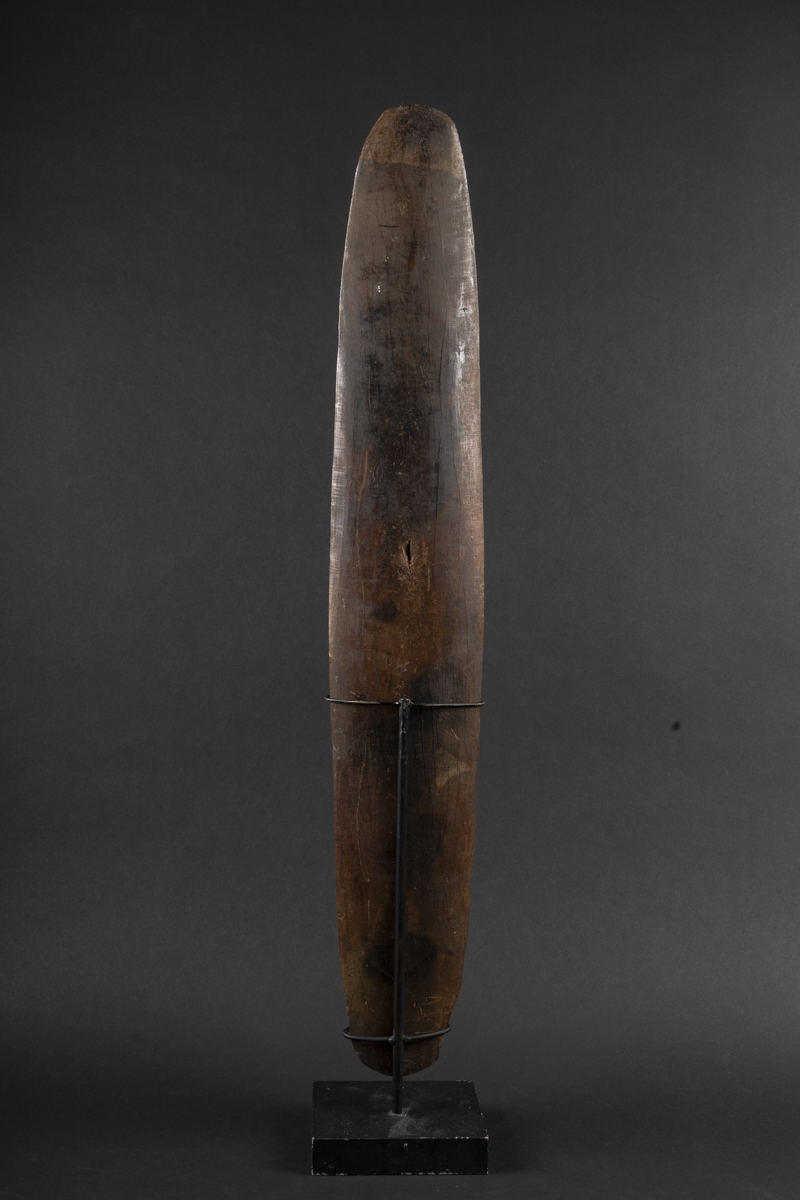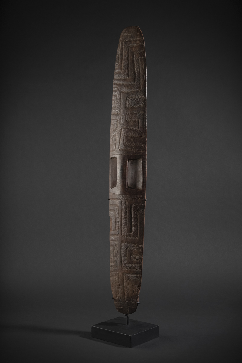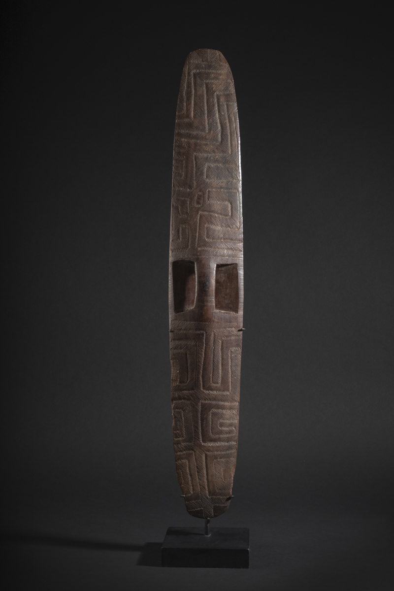 As stated in the publication "Boucliers"/"Shields" by the Musée Barbier-Mueller in Geneva (pp. 99-100), the Karajarri, who occupy the area along the Eighty-Mile Beach between the De Grey River and Broome call these shields karrbinna and carved them out of a type of eucalyptus. D. S. Davidson, then Associate Professor of Anthropology at the University of Washington, noted in 1949 that the Karajarri were responsible for most, if not all, examples of traditional shields incised with well-proportioned interlocking key patterns.