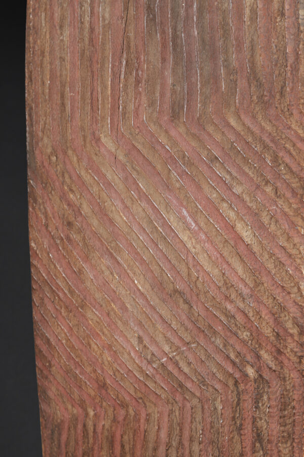 Le bouclier, sur sa face antérieure, présente trois ensembles de rainures parallèles peintes en rouge ocre et de sillons sculptés. Ce type de décoration appelée « pandal » se compose de deux zones de rainures verticales sculptées dans la partie supérieure et dans la partie inférieure du bouclier, tandis que la partie médiane présente des rainures obliques. La signification de ces motifs est liée au totémisme et aux « songlines » caractéristiques des croyances aborigènes.