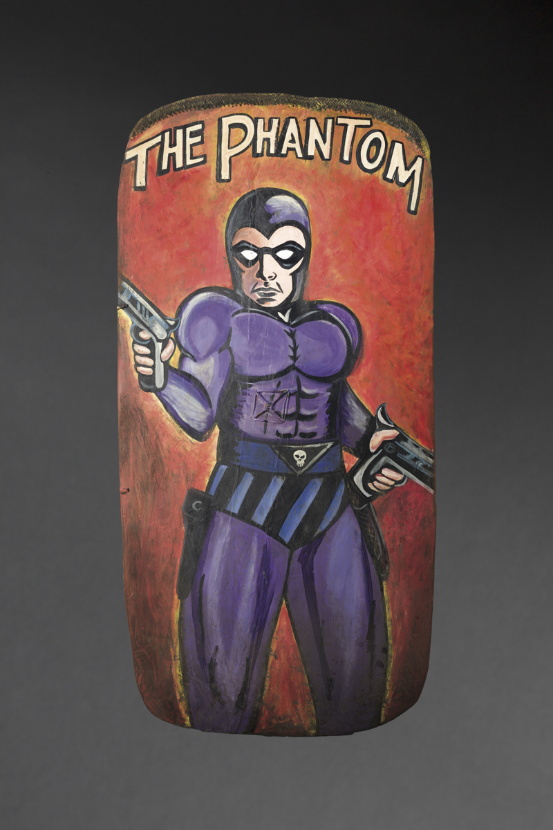 Ce bouclier des Hautes Terres figure le personnage de super-héros, the Phantom (le ‘Fantôme du Bengale’ en Français). Le télescopage des figurations (motifs abstraits représentatifs de l’art de la région et icône occidentale importée et replacée sur un objet lié aux conflits locaux) est une superbe illustration de l’évolution des cultures papoues dans la seconde moitié du XXème siècle. L’ornementation peinte avec le Phantom date vraisemblablement du dernier tiers du siècle dernier, mais le bouclier, lui, est antérieur ainsi qu’en attestent la surface à l’arrière du bouclier.