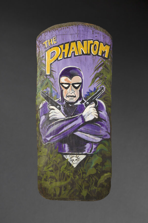 Ce bouclier des Hautes Terres figure le personnage de super-héros, the Phantom (le ‘Fantôme du Bengale’ en Français). Le télescopage des figurations (motifs abstraits représentatifs de l’art de la région et icône occidentale importée et replacée sur un objet lié aux conflits locaux) est une superbe illustration de l’évolution des cultures papoues dans la seconde moitié du XXème siècle. L’ornementation peinte avec le Phantom date vraisemblablement du dernier tiers du siècle dernier, mais le bouclier, lui, est antérieur ainsi qu’en attestent la surface à l’arrière du bouclier.