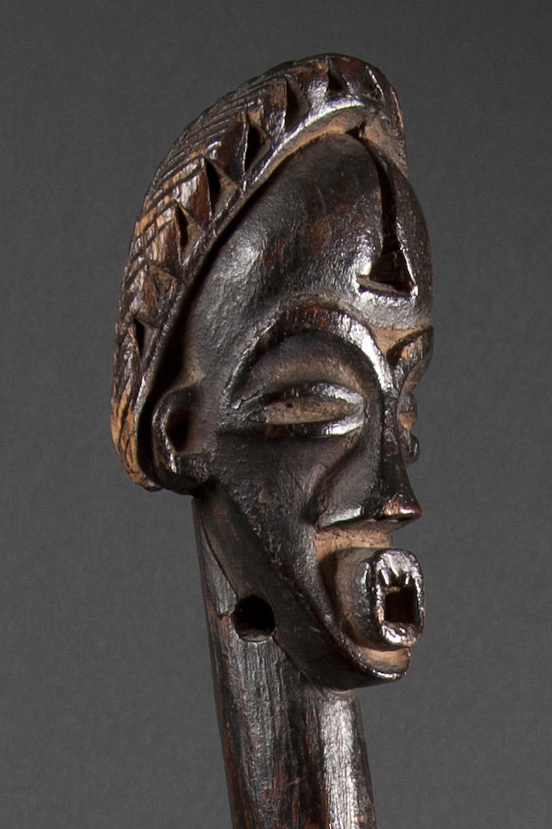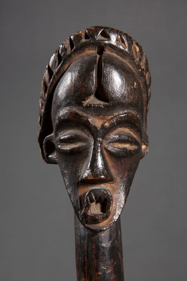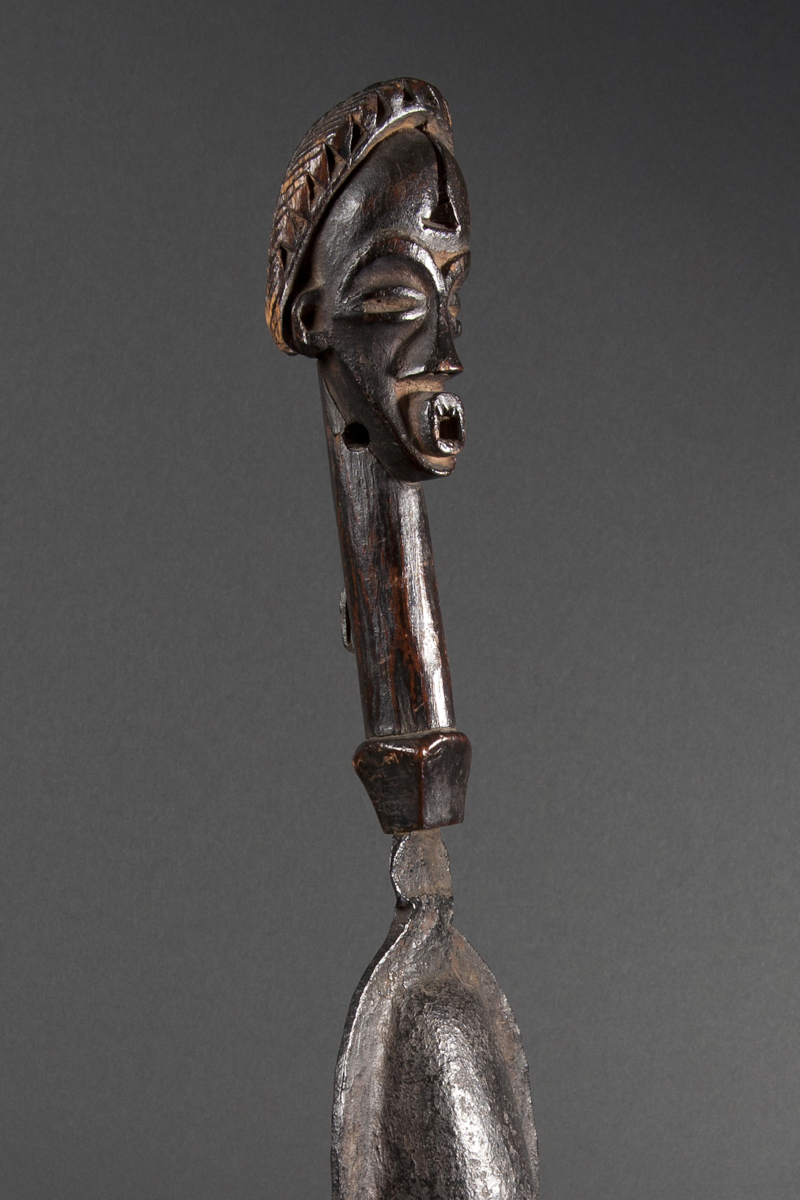 This finely carved Mikenge (or Mokengué) ritual gong is laden with an anthropomorphic symbolism. The human face on top represents Kombe (the sun), a male entity, source of life, and supreme judge of all humans. The sound of the gong was said to symbolize the beat of a man's heart.