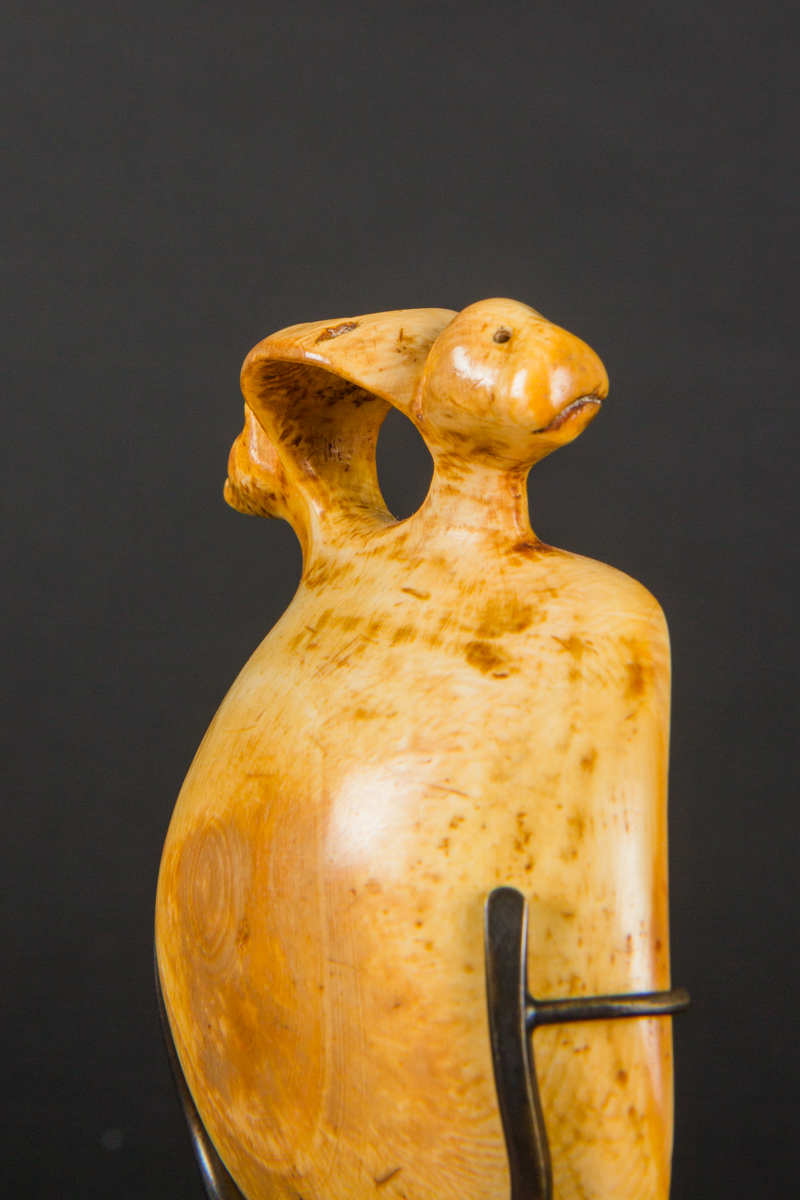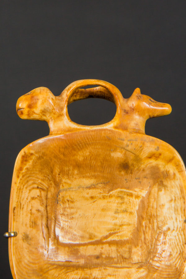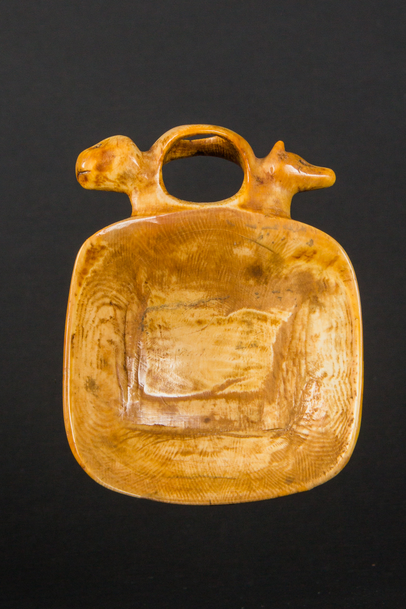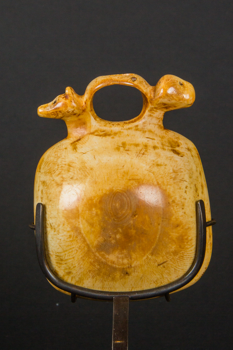 A functional tool used to scrape and clean hides prior to processing for waterproof clothing and bags. This sculpture is remarkable for the refinement of its handle depicting two animal heads.