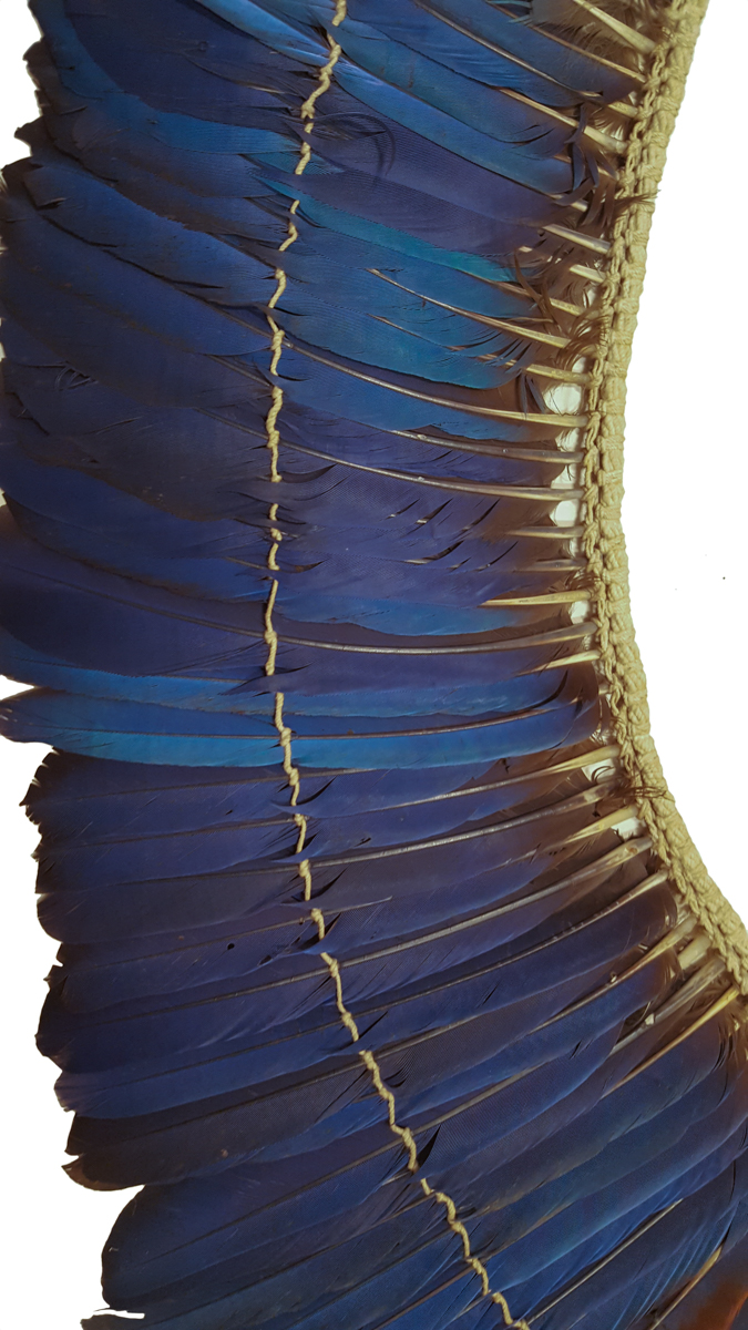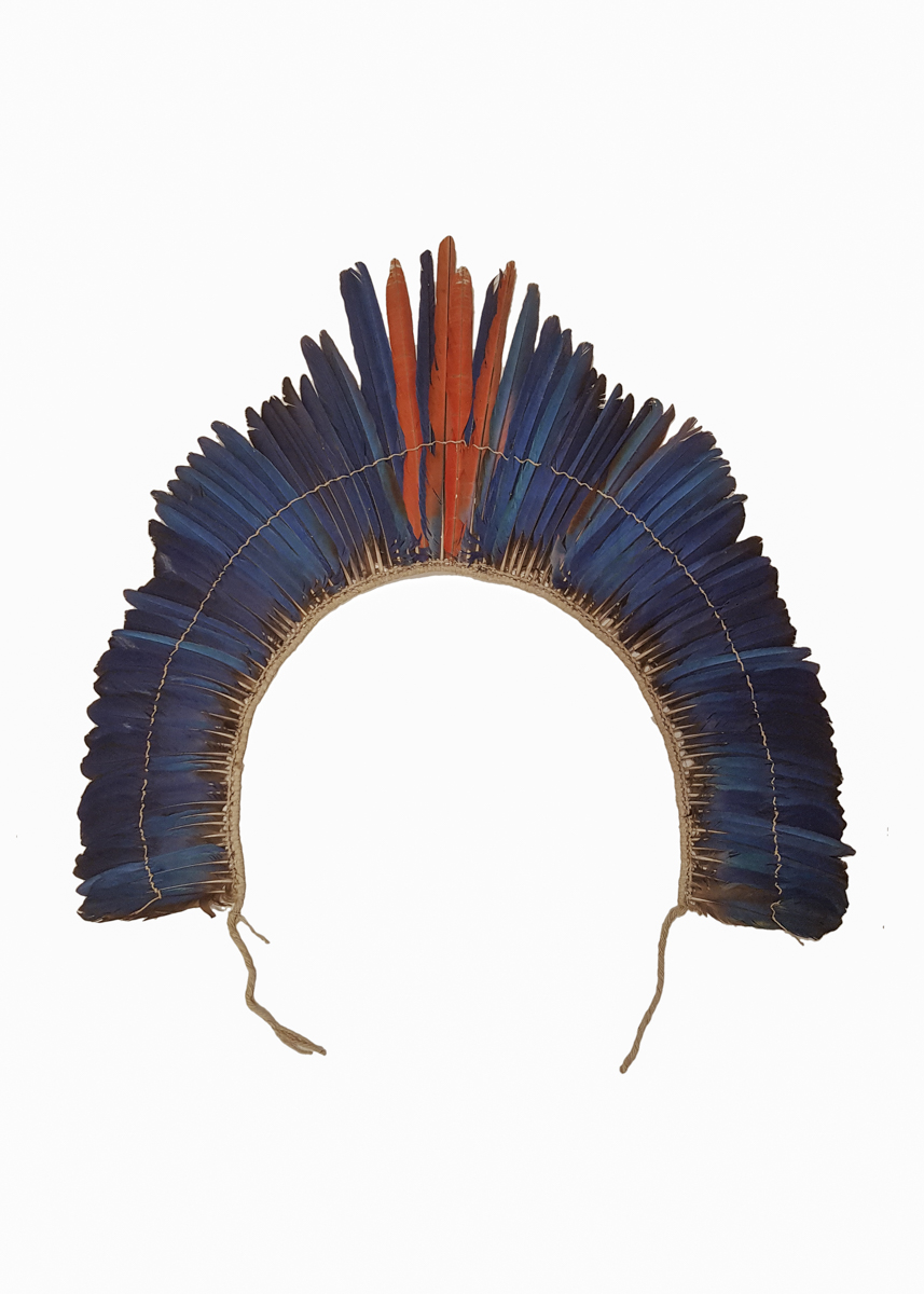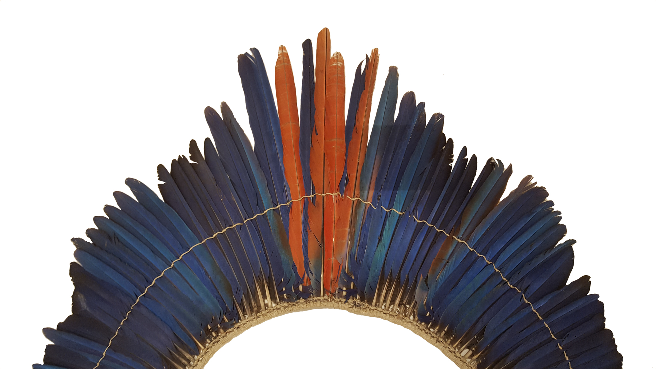 Les coiffes en plumes multicolores représentent l'élément de parure le plus prestigieux des hauts dignitaires chez les Indiens Kayapo. Dans les conceptions religieuses et les cosmogonies kayapo, l'univers est de forme arrondie. C'est la raison pour laquelle les villages et les champs, organisés selon sur un plan circulaire, sont considérés comme des représentation en miniature de l'univers. De la même manière, les grandes coiffes flamboyantes en plumes reprennent symboliquement et structurellement la forme ronde ou ovale. L'utilisation du coton qui ceint les éléments d'armature de la coiffe rappelle un mythe fondateur kayapo selon lequel les premiers hommes seraient descendus du ciel en s'accrochant à une longue corde de coton.