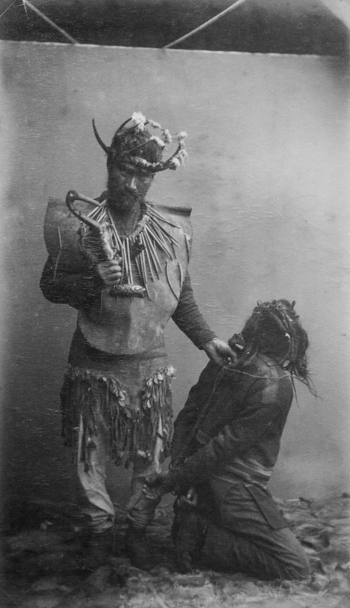 Un chamane avec un hochet se tenant devant un Indien agenouillé