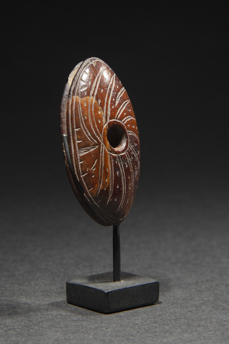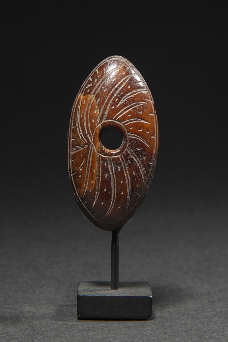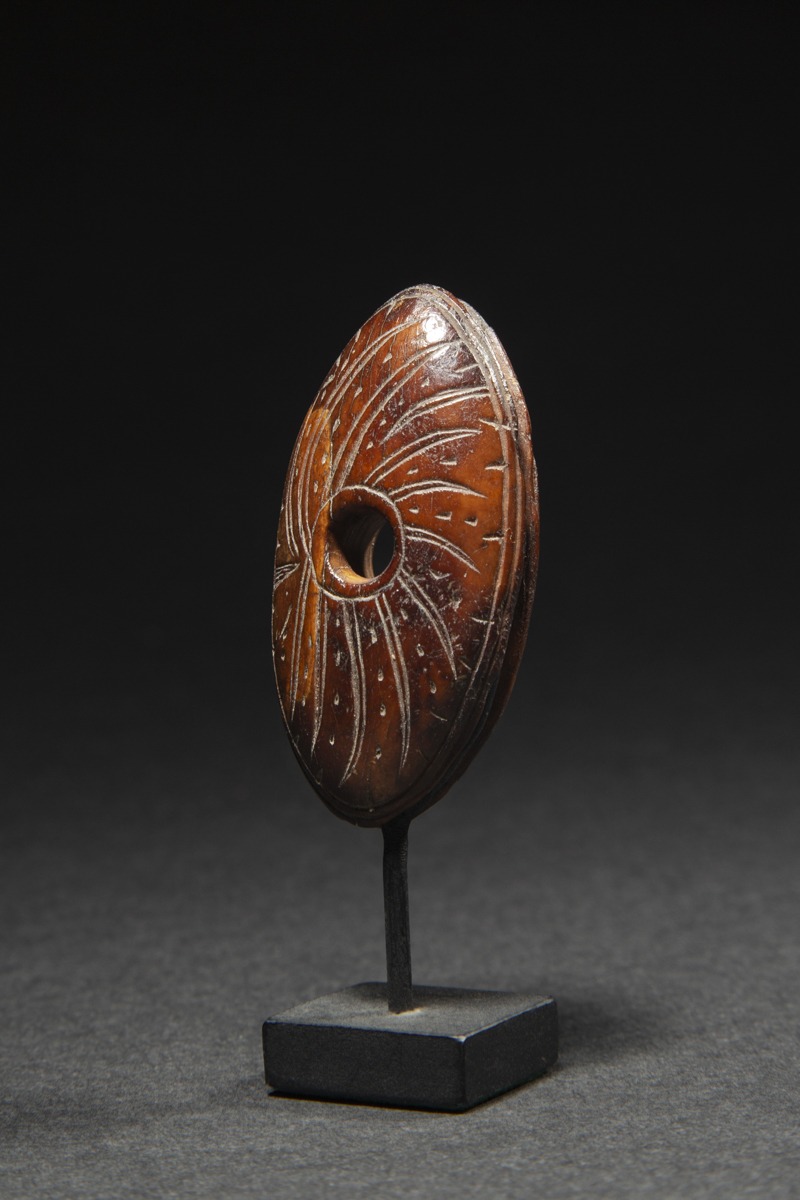 Throughout history, Eskimo cultures have shared the belief that all things in the physical world are imbued with a living spirit, or inua. In order to gain favor with the spirits controlling the animals, a hunter had to approach his prey in a respectful manner. It was believed that decorated objects, through their beauty, attracted the prey and at the same time honored its spirit. Carved depictions of great predators like polar bears or raptors on hunting equipment also helped it find its way to the prey. The harpoon was seen as a traveler between spirit worlds, a messenger between the humans and the creatures of the sea.