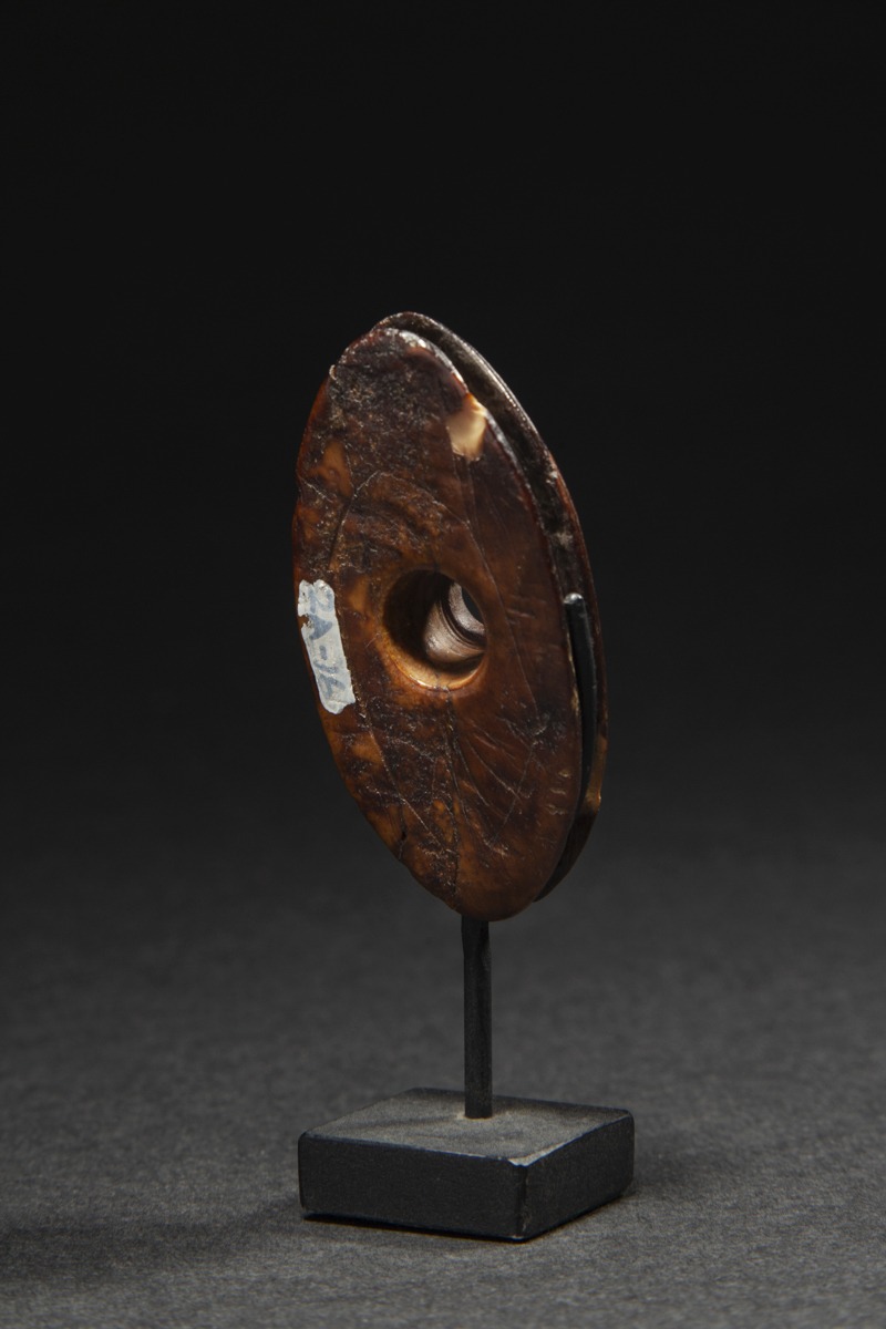 The implement presented here was affixed to a float. As noted by Ann Fiend-Riordan in "Yup'ik Elders at the Ethnologisches Museum Berlin, Fieldwork Turned on Its Head", pages 54-55, "this device is put into the leather edges of the hole with the help of strong seal straps, which are gathered and tied and therefore make the hole air-tight."