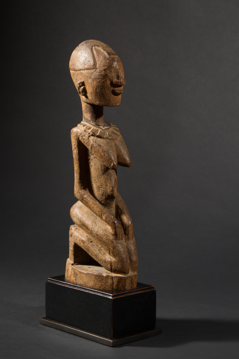 This fertility doll is a "Biga" figure from the Mossi people of Burkina Faso. As stated by the Smithsonian National Museum of African Art, wood dolls in the form of stylized female figures are carved by Mossi blacksmiths. Parents give them to their daughters, who use them as playthings and to learn child care skills. Later the figures may play a role in initiation and childbirth. If a woman is having trouble conceiving she may commission a new, larger version of her childhood doll.