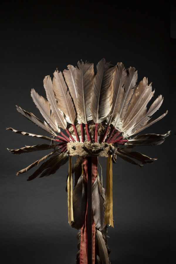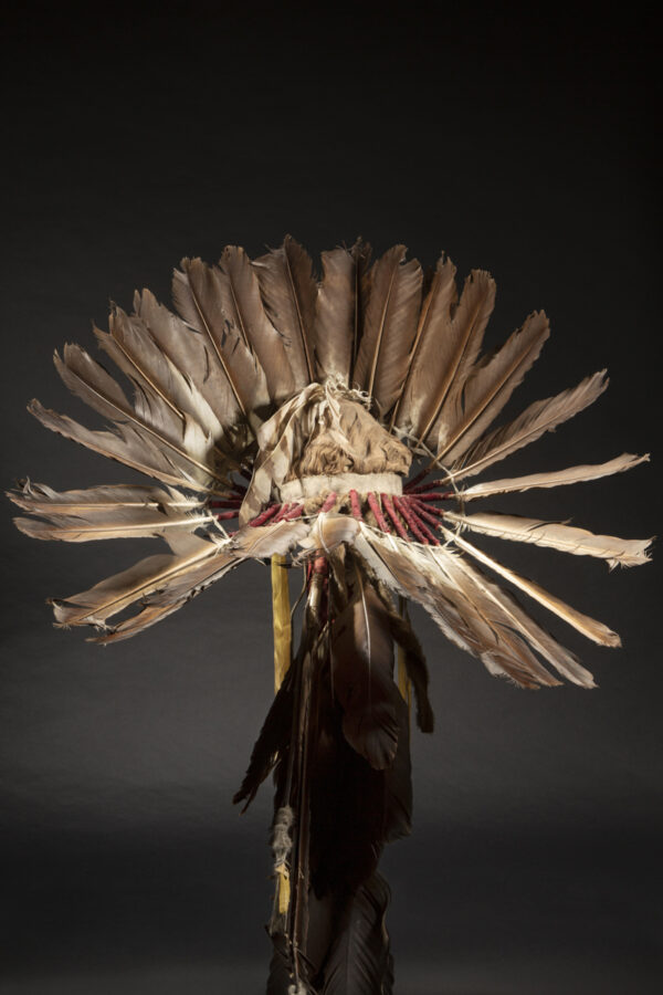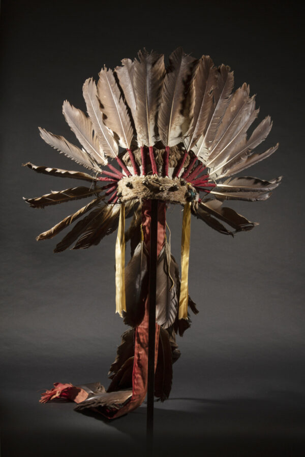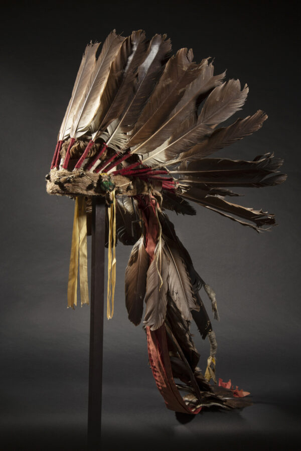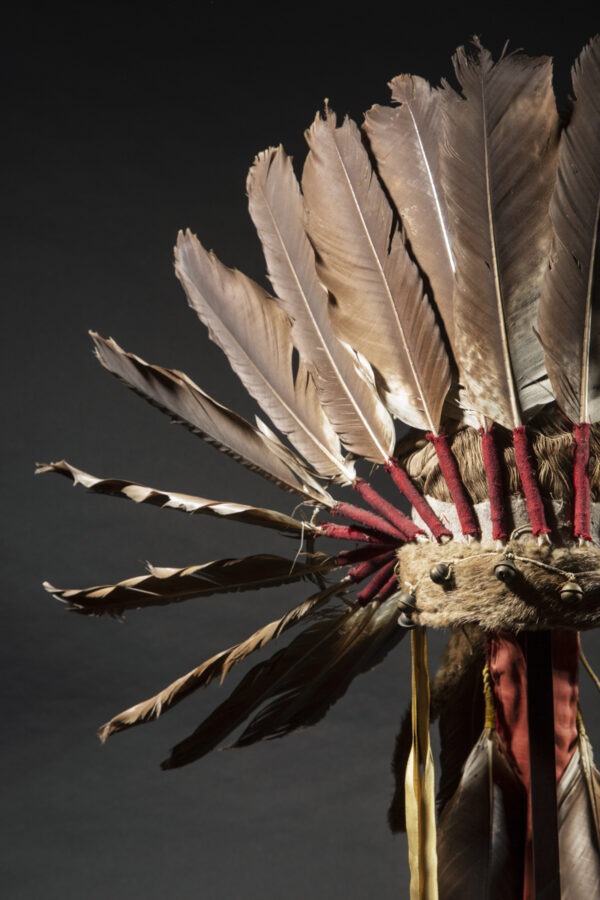 This type of long eagle feather headdress was the most important and spectacular symbol of prestige and honor for warriors of the Plains and neighboring regions. The iconic "war bonnets" were rarely seen before the 1830s and were primarily worn by warriors and chiefs of certain groups in the Eastern Prairies region. It was during the 19th century that they became widespread throughout the entire area.