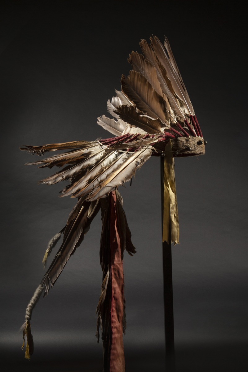 Eagle feathers, otter fur, hanging fabric strips, cloth, metal bells