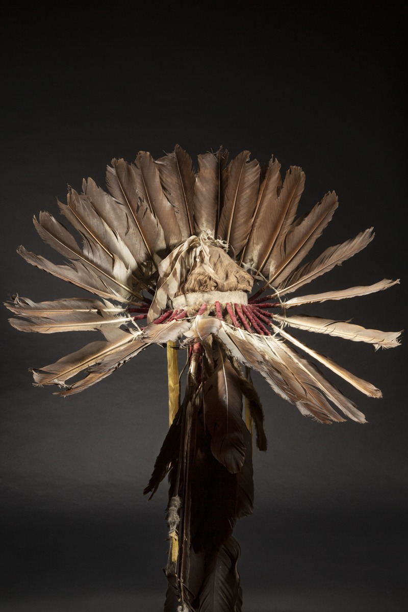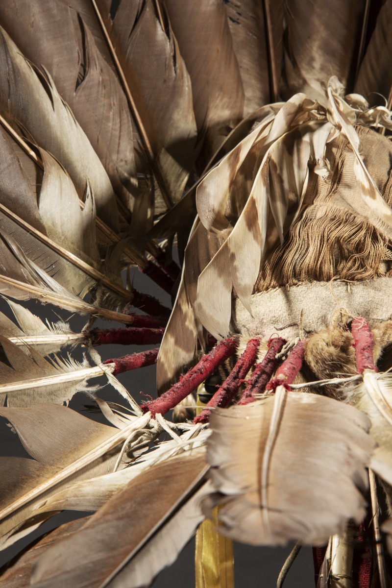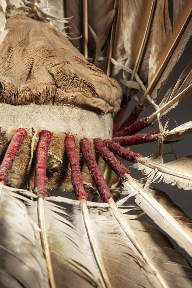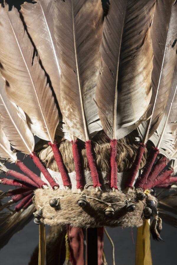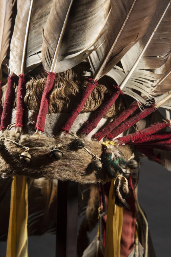 The example showcased here stands out for its archaic character and imposing size, highlighted by its long tail adorned with golden eagle feathers and a rare otter fur frontlet.