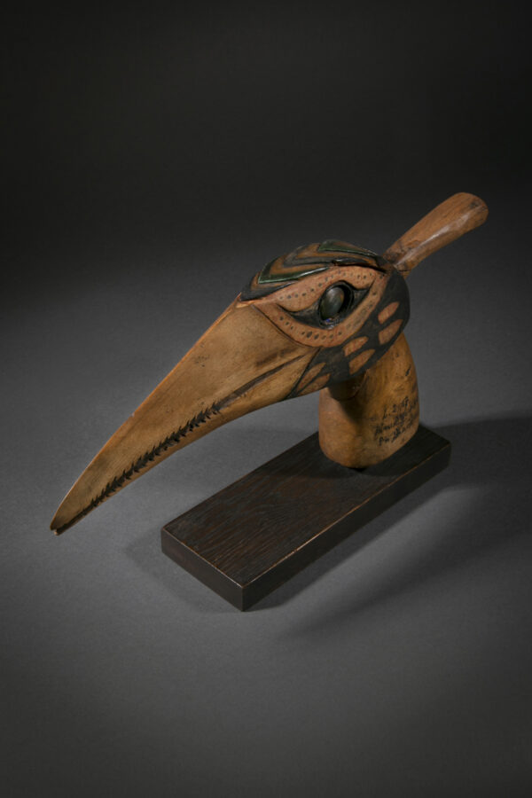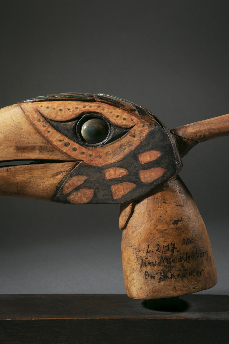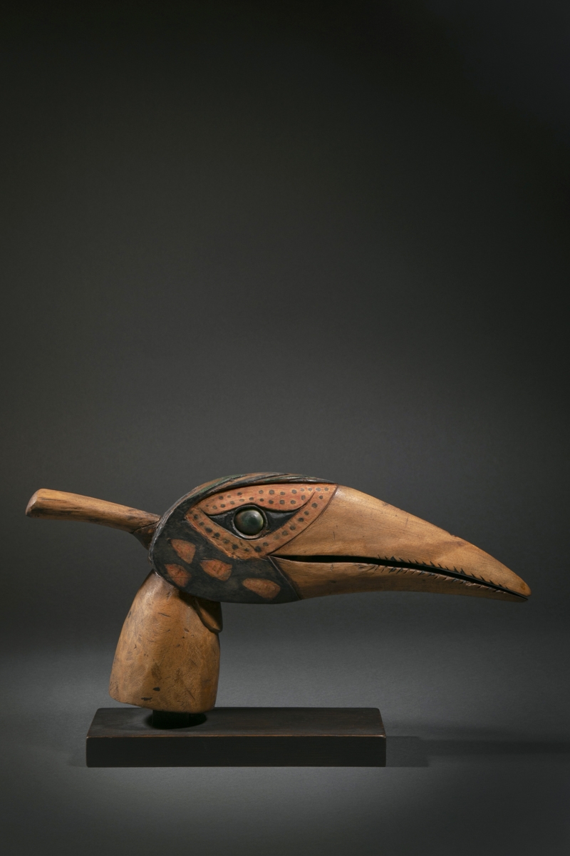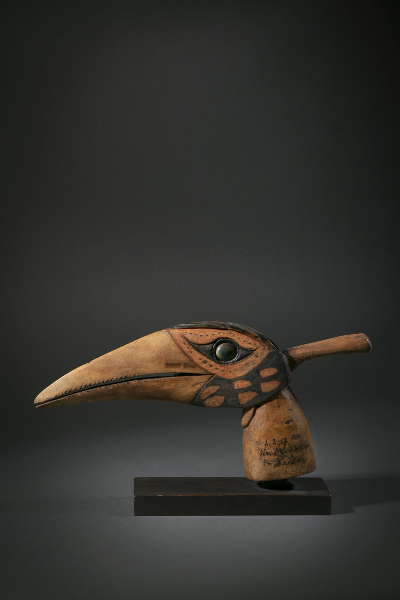 This bird figure (hornbill) is a dance ornament that was held between the teeth by a dancer or sometimes placed in the mouth of a mask during the ritual ceremonies of the Malangan (Malagan).