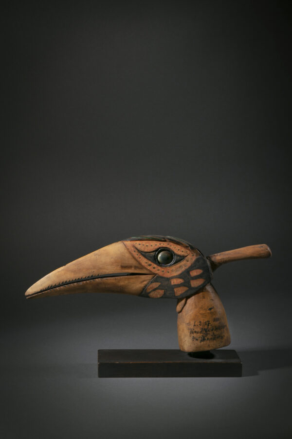 This hornbill mouthpiece is one of the seven ornaments collected in central New Ireland, Lambusso village in the spring 1909 by Augustin Krämer from the German Marine Expedition. It later entered the collections of the Linden Museum in Stuttgart (reference L.2/17 S/16 in Krämer’s notes, and accessioned as 84375 by the Museum). It was eventually sold to Serge Brignoni on 6 November 1957 and was later part of prominent North American collections.