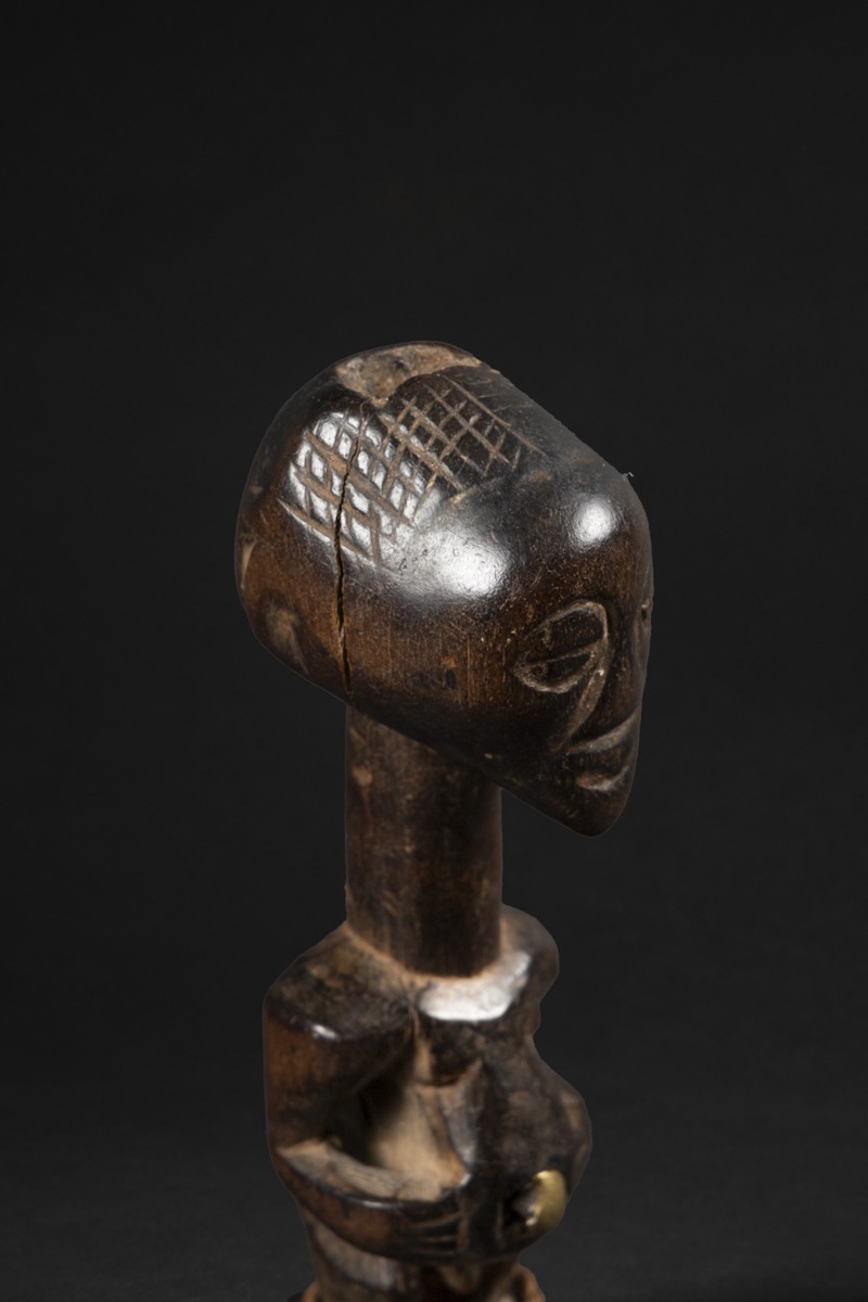 Fetishes, amulets (boanga or nganga) and power figures (nkishi) are omnipresent among the Songye. These ritual figures are said to bring wealth, fertility and success. They also serve as a form of protection against hostile forces, such as lightning or diseases. The antelope horn at the top of the head of the carved figure was the receptacle for the « medicine », transmitting strength and magical power to its owner.