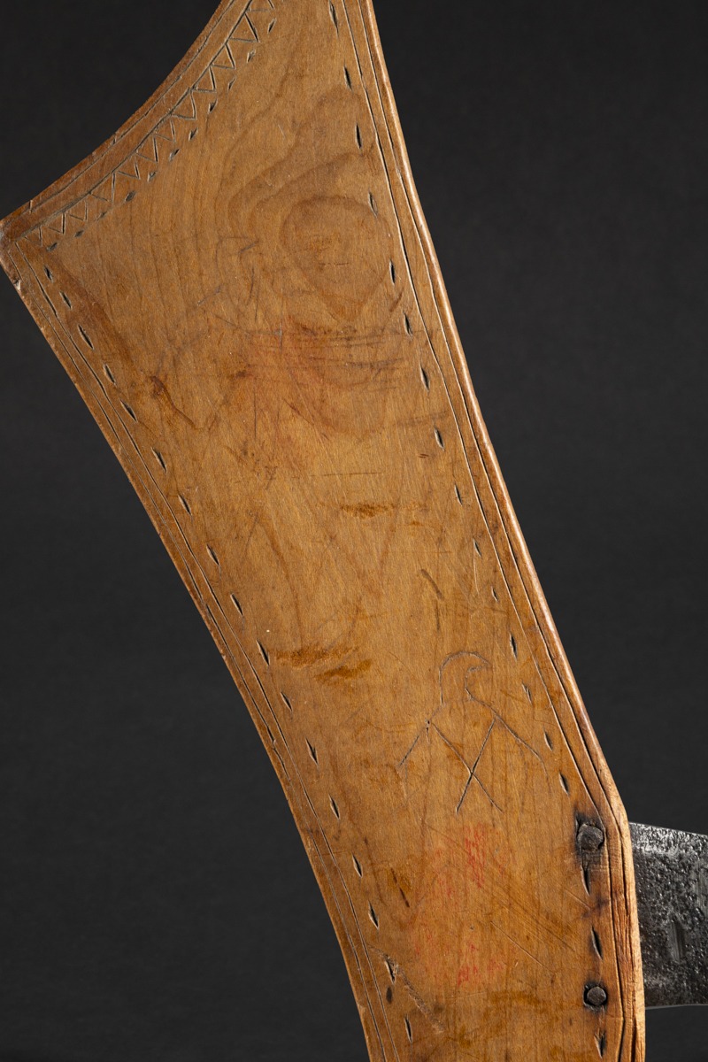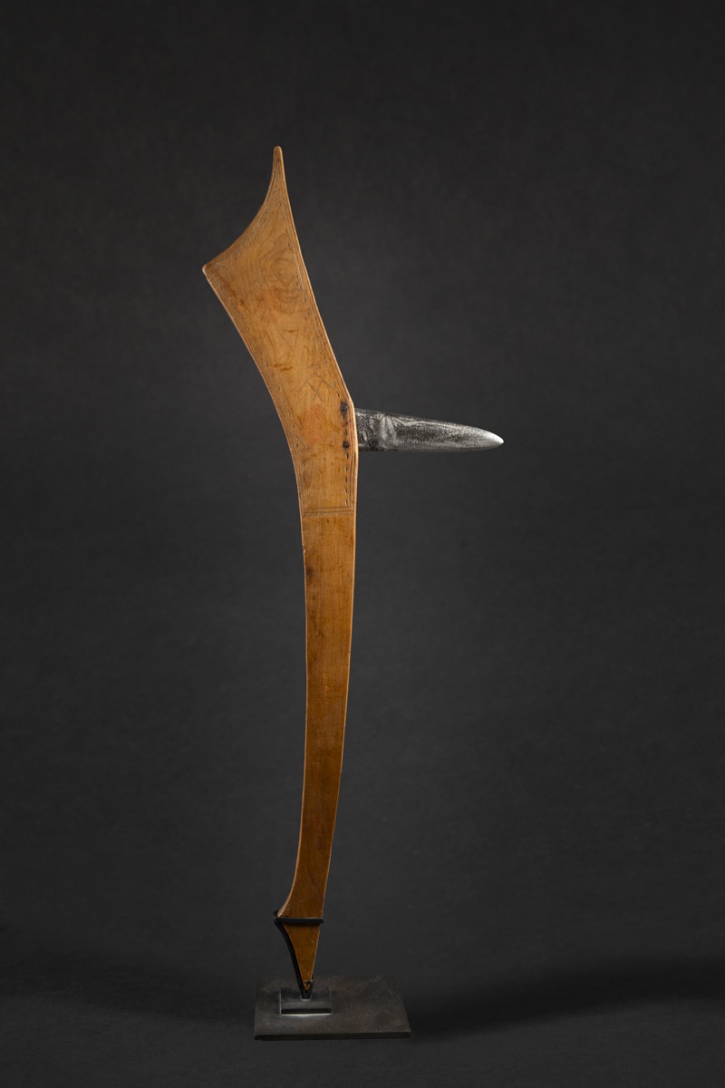 The gunstock war club, so named for its resemblance to the wooden butt of a rifle, occupies a distinctive place in the combat traditions of the Plains. Its precise origin remains debated: some scholars interpret the form as a conscious response to the introduction of European firearms in the 17th century, while others suggest that its angular silhouette was primarily developed for balance, reach, and striking power.