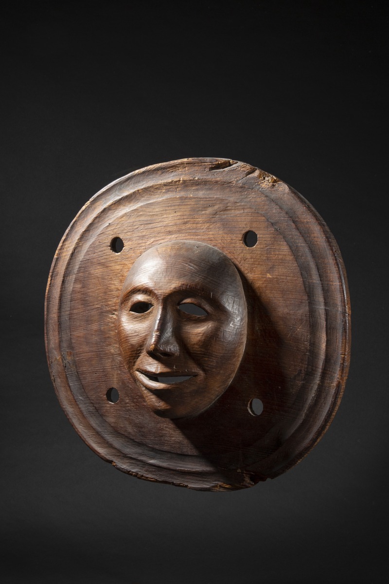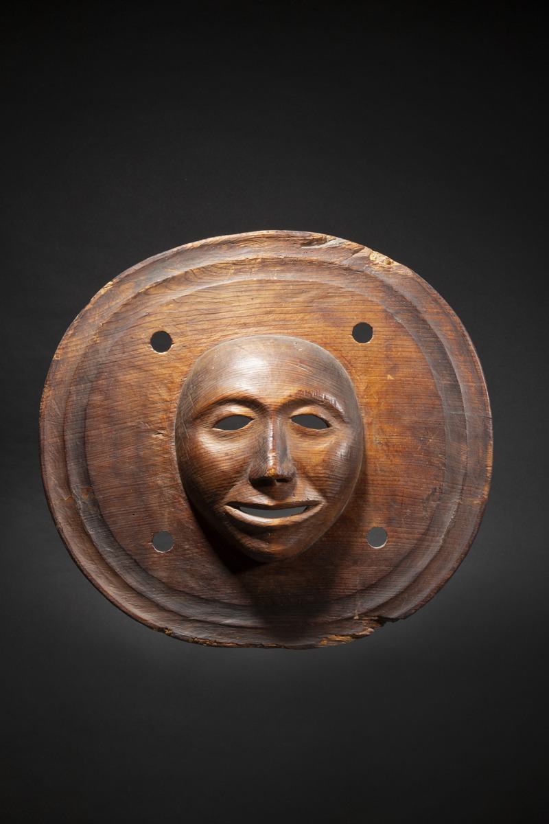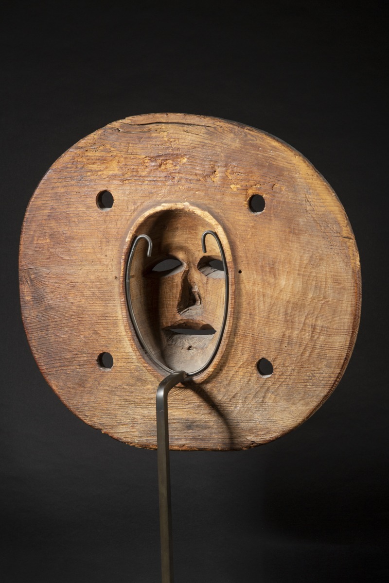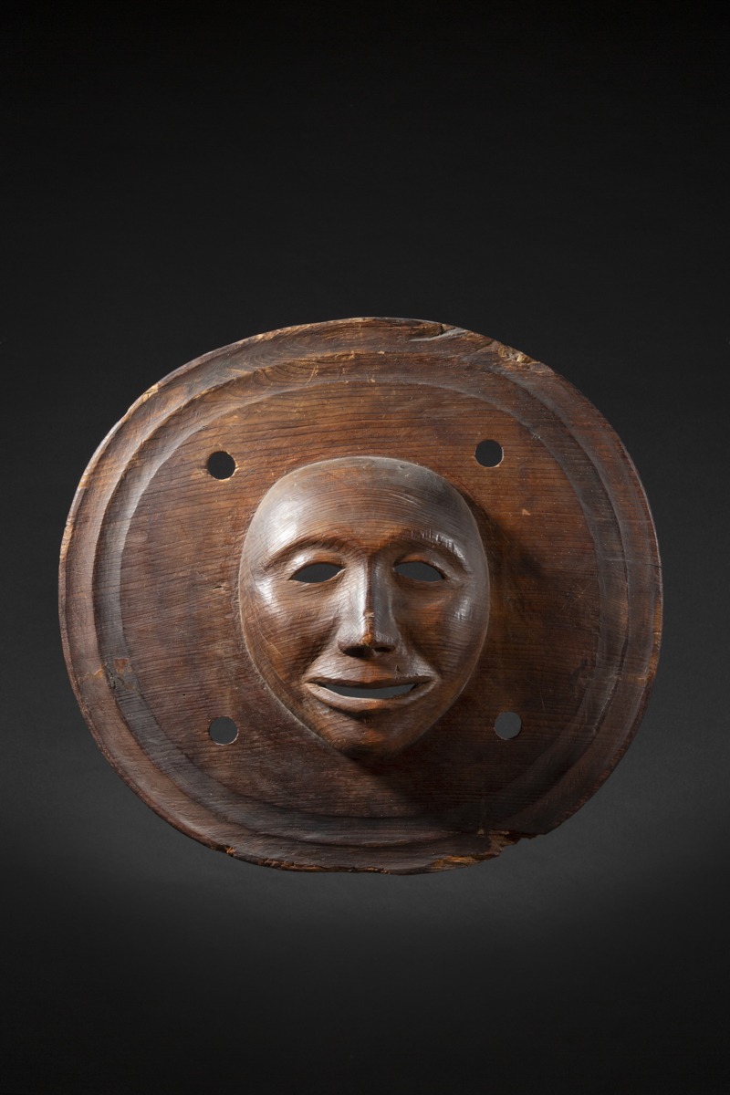 Large plaque masks of this type are found in the Yukon-Kuskokwim delta, from Anvik to St. Michael’s to Cape Vancouver, and on Saint Lawrence Island. They are known as Nepcetaq meaning "the ones that stick (or cling) to the face". As Ann Fienup-Riordan notes in The Living tradition of Yu’ik maks, (University of Washington Press page 78) “a shaman or angalkug would use his power to draw a mask to his face and dance with it without using his hands, any strings, or other means to hold the mask in place. (…) The four holes in the large backboard represent the passages that the animal spirits would take on their journey to the world. The shaman used such a mask to demonstrate his power and to draw animals near to the hunters.”