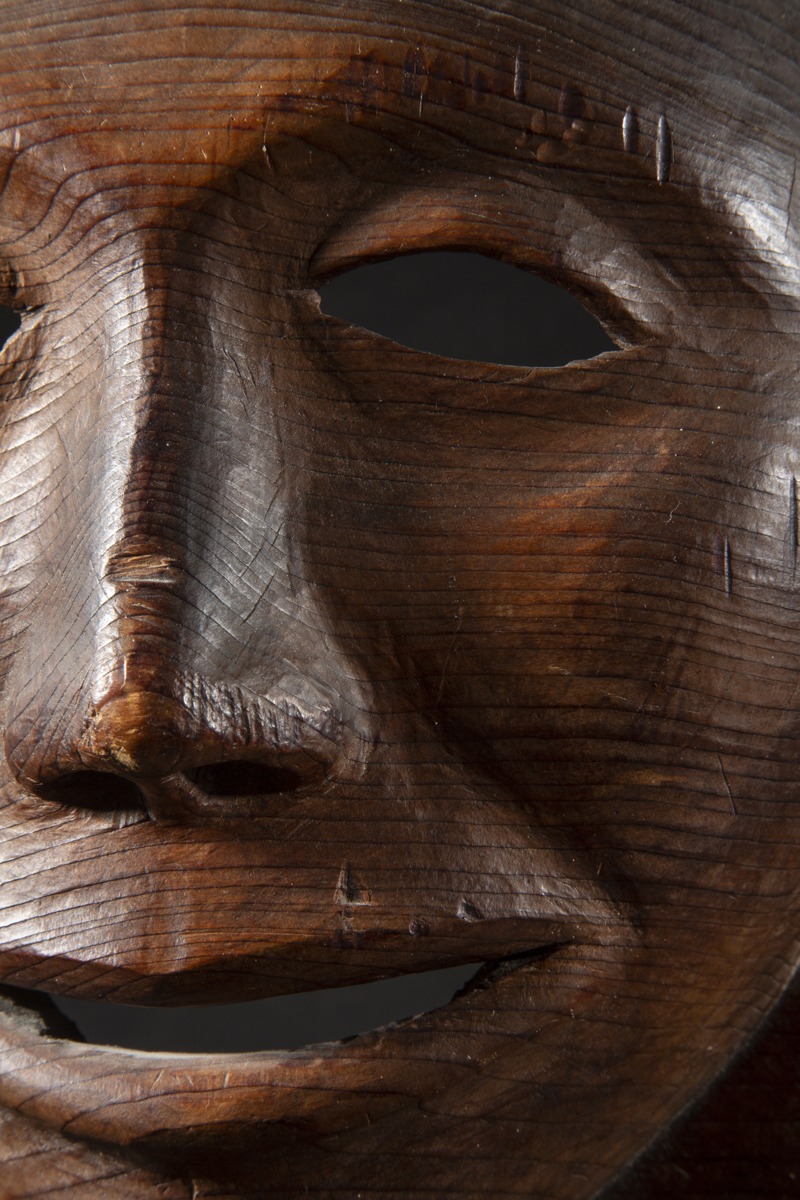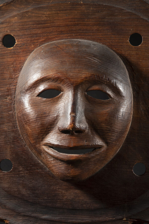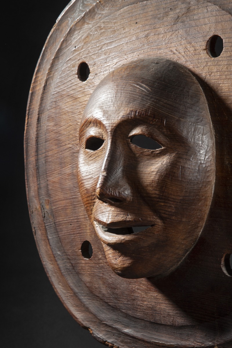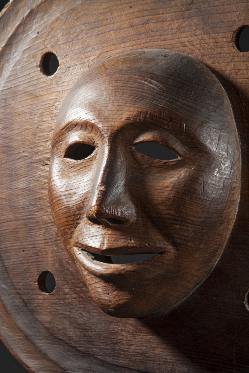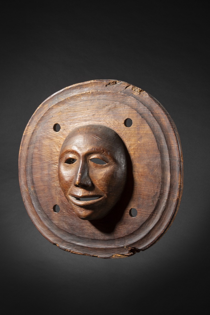Large plaque masks of this type are found in the Yukon-Kuskokwim delta, from Anvik to St. Michael’s to Cape Vancouver, and on Saint Lawrence Island. They are known as Nepcetaq meaning "the ones that stick (or cling) to the face". As Ann Fienup-Riordan notes in The Living tradition of Yu’ik maks, (University of Washington Press page 78) “a shaman or angalkug would use his power to draw a mask to his face and dance with it without using his hands, any strings, or other means to hold the mask in place. (…) The four holes in the large backboard represent the passages that the animal spirits would take on their journey to the world. The shaman used such a mask to demonstrate his power and to draw animals near to the hunters.”