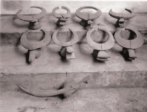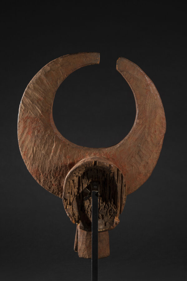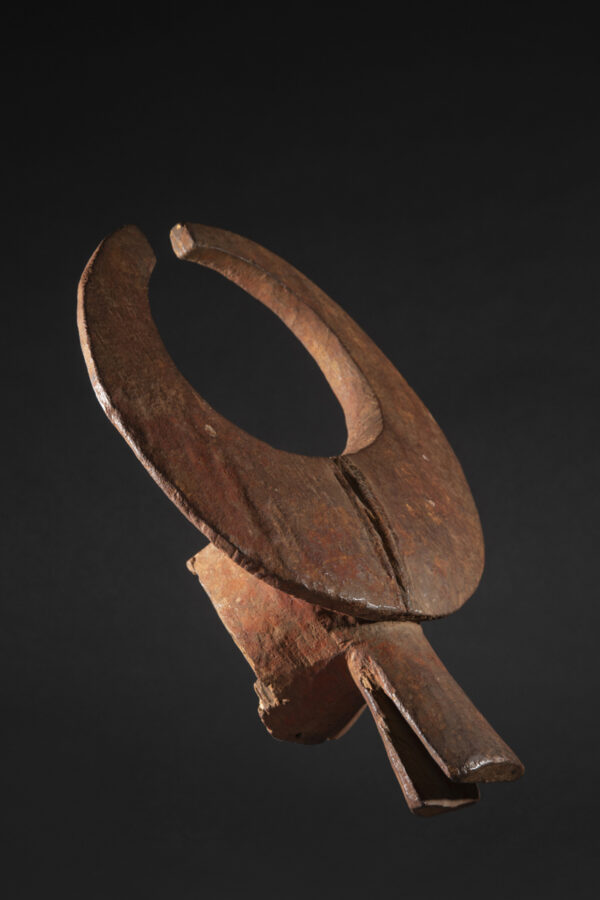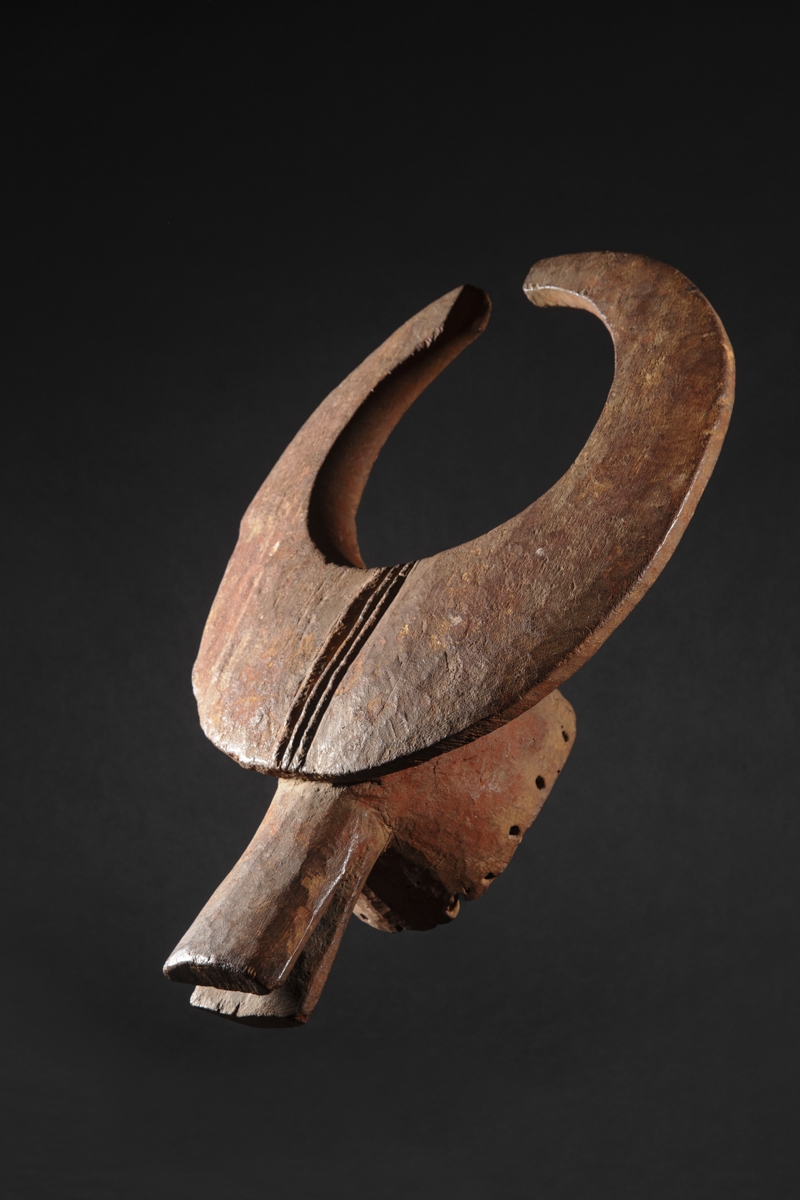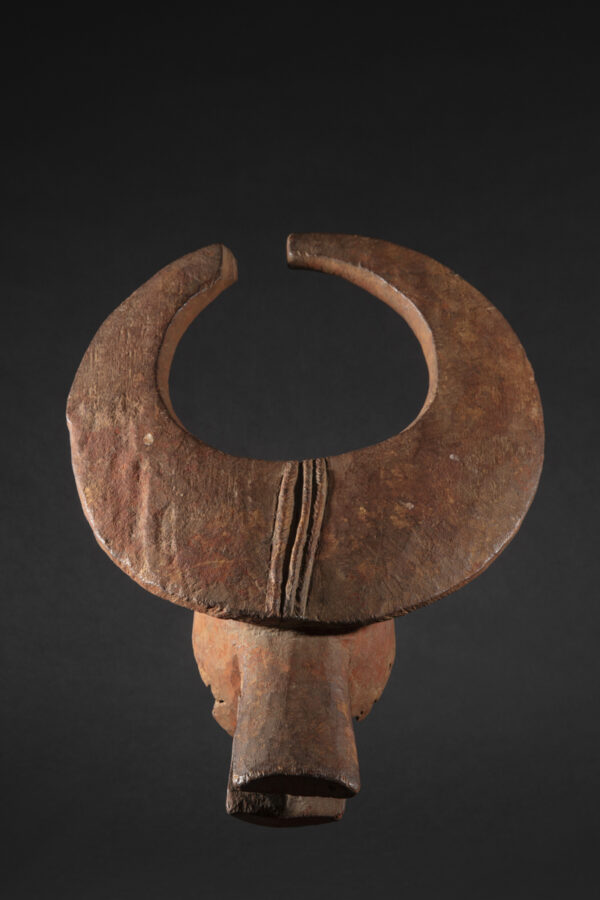 Marla Berns, director of the Fowler Museum (UCLA, Los Angeles) and a reference author on the arts of the Benue, notes that the Kantana (one of the five peoples of the Mama group in Nigeria) carve dance crests out of wood. The crests are presented as highly stylized bush buffaloes that appear in an ancestral masquerade called Mangam. This masquerade, one of the many manifestations of the Mangam cult, is intended to gain the participation of ancestral spirits in order to obtain a generous harvest.