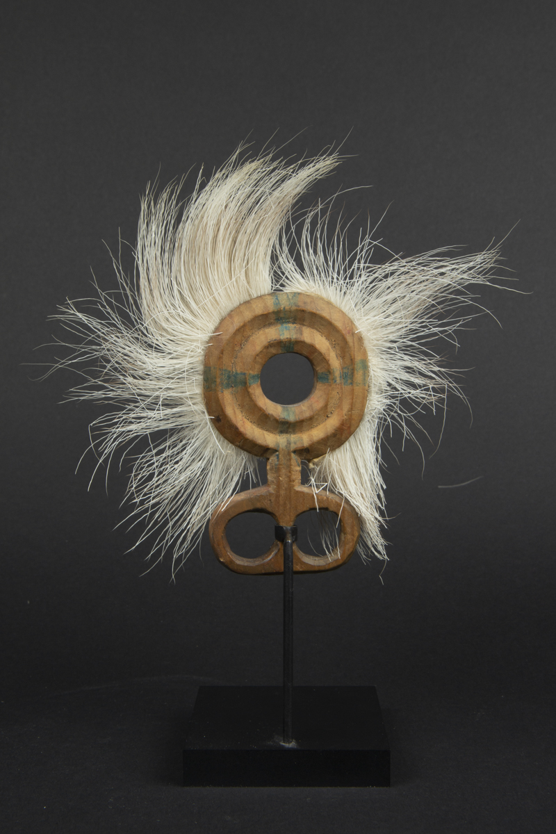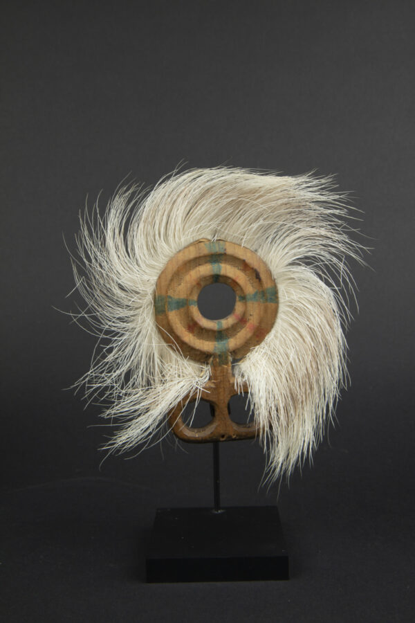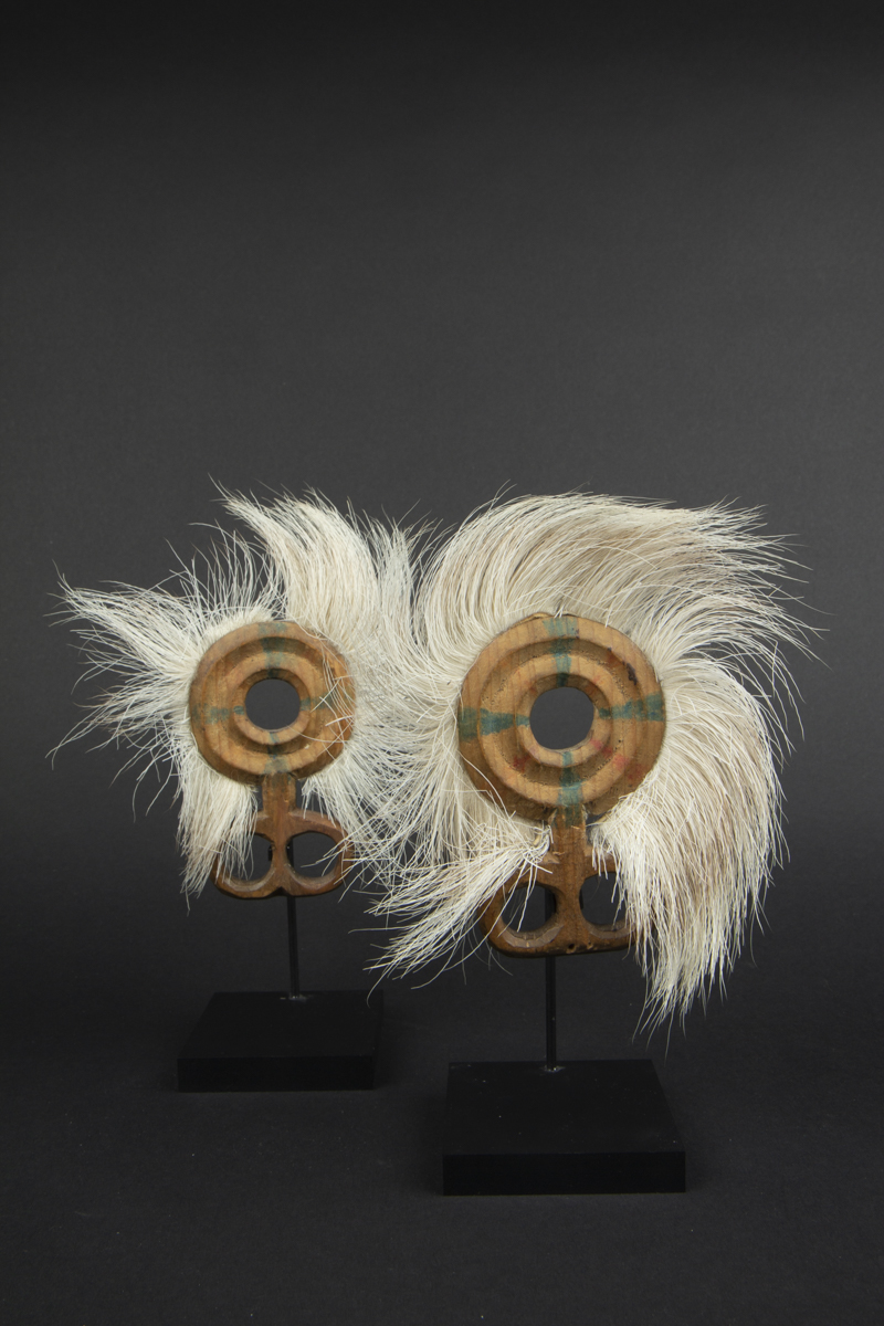 This rare pair of dance fans (finger masks) in carved wood rimmed with caribou fur feature a geometric décor of concentric circles with traces of green and red pigments.