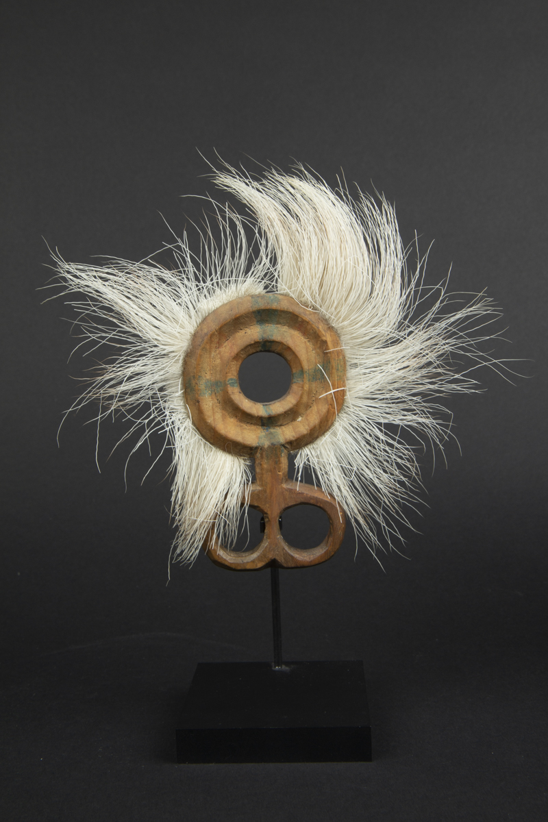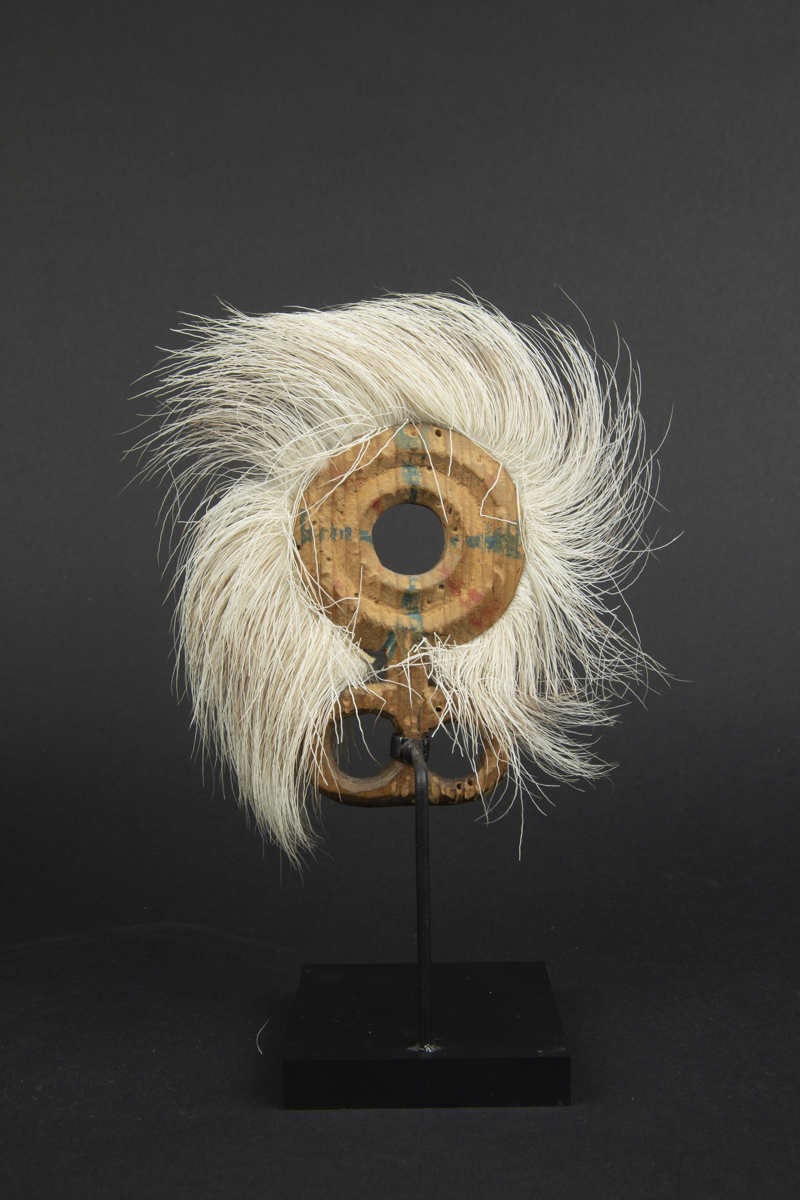 The concentric circles surrounding the mask illustrate the parallel worlds that the shaman is able to visit while in a trance. The motif of concentric circles is known as “ellam iinga” in Yup’ik language menaing the “eye of the universe” or the “eye of awareness”.