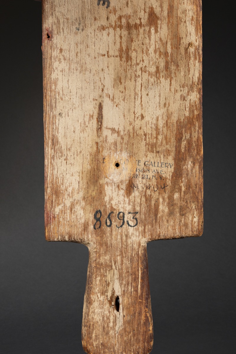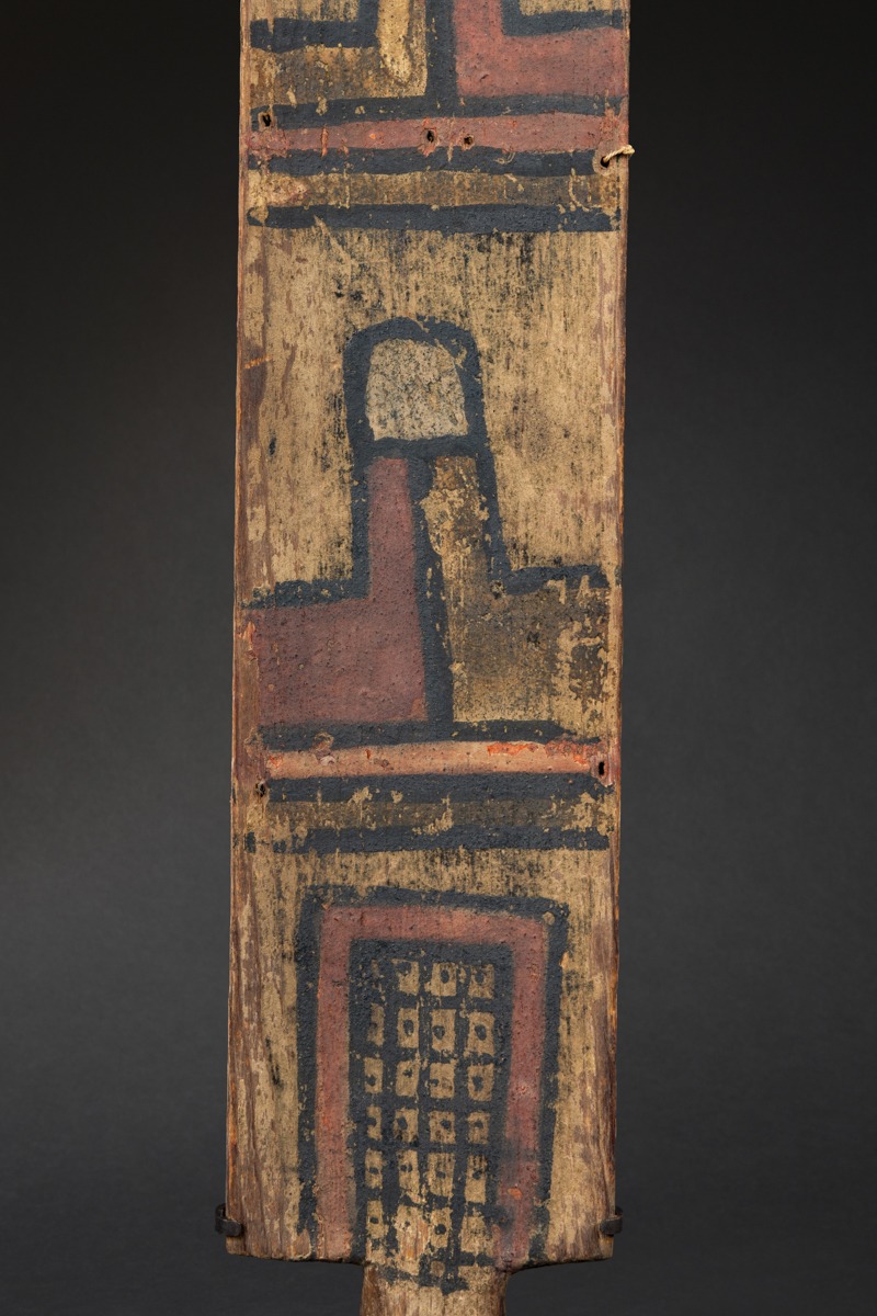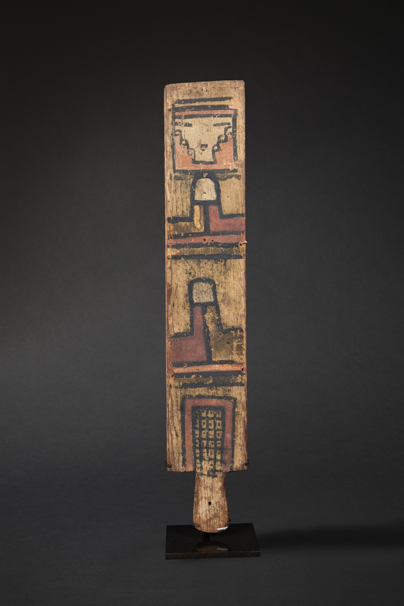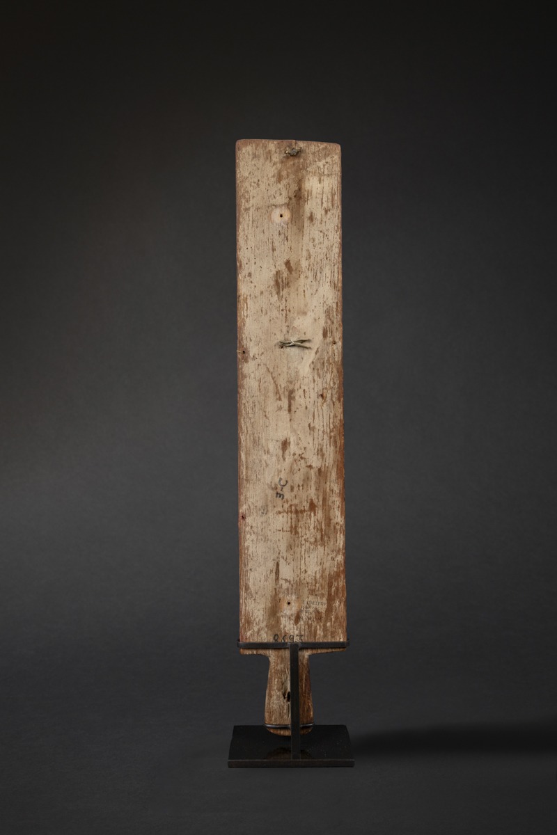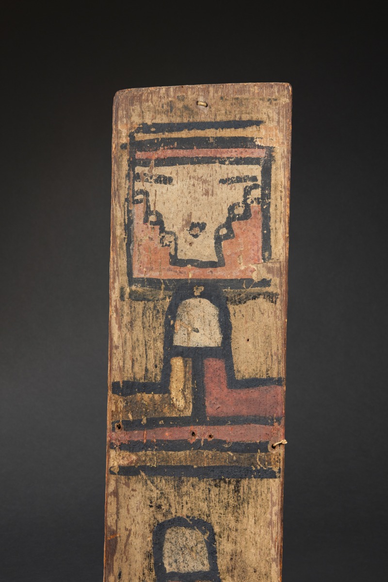 Rare and early Hopi ceremonial dance wand, featuring notably the mask of Pooshum (Seed) Katsina Spirit, associated with germination, and, on the lower part, motifs linked to maize. Beautiful mineral pigments, naturally oxidized over time.