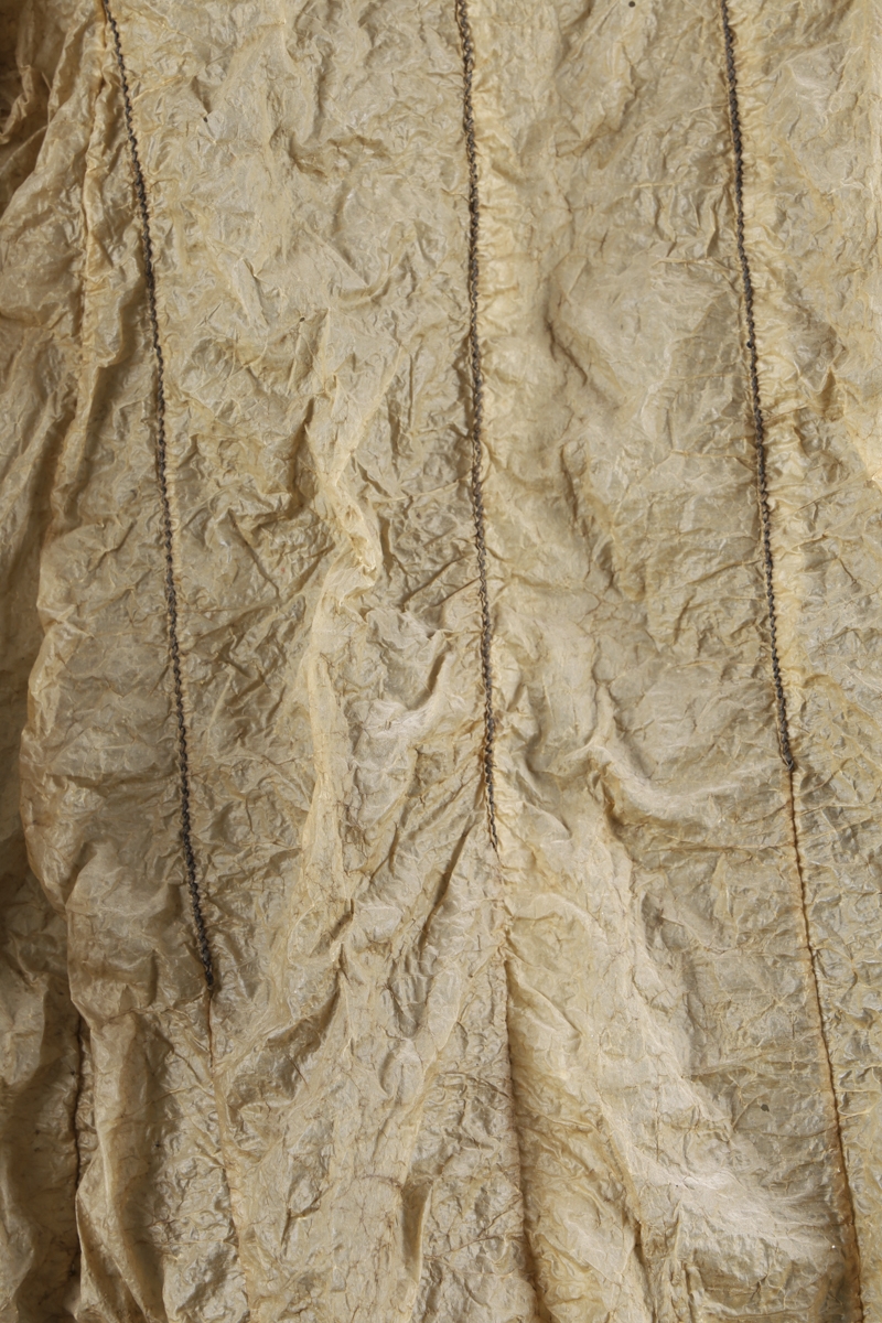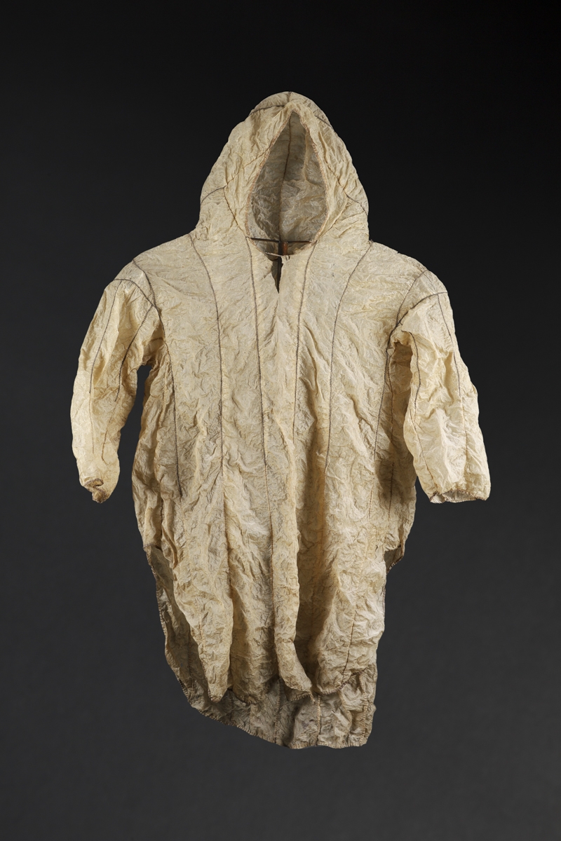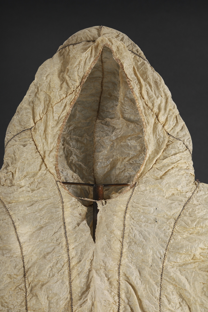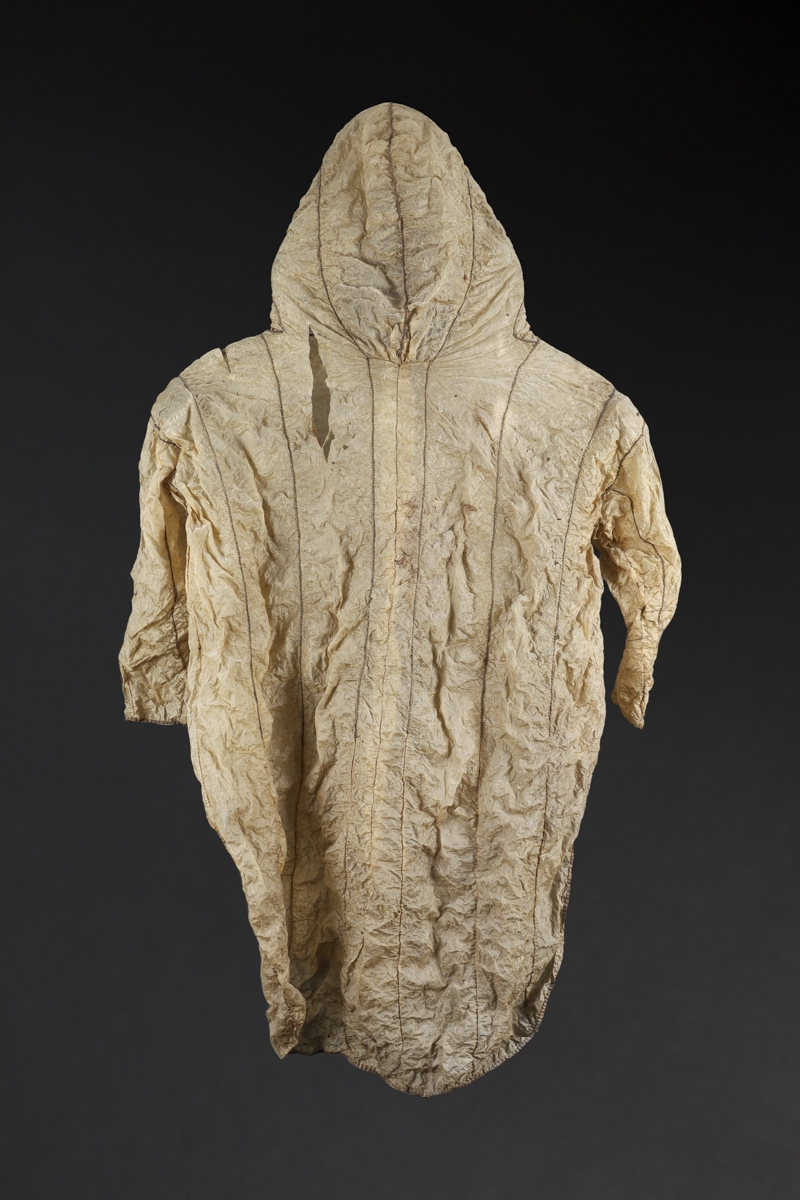 This is an eminently poetic gutskin parka. It combines technical prowess with an artistry evolved from an ancient heritage. As stated by the McCord Museum in Canada, hooded pullover parka made of creamy opaque gutskin (sea mammal intestines) was worn by Inuit men and women over other clothes for protection against sea-spray or sleet, and for ceremonial purposes. Sea mammal intestines and other membranes undergo complex processing, including several washings, peeling inside and out, and scraping with a blunt scraper. With intestines, one end is tied, the tube inflated, the other end tied and the sausage-like coils hung to dry.