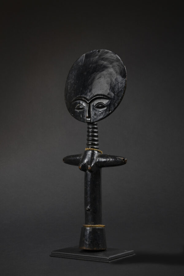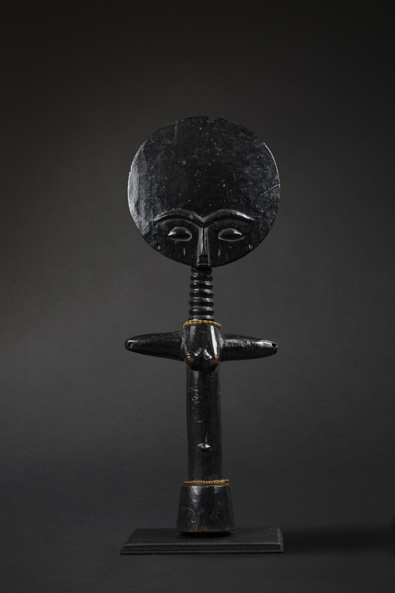 This type of Ashanti figure is called akuaba. It represents youth and fertility. These carved figures were said to facilitate the conception of a child and ensure safe delivery at birth. Ashanti (Akan) women carried the dolls with them at all times. They treated them as if they were living babies, cuddling them, dressing them up, etc.