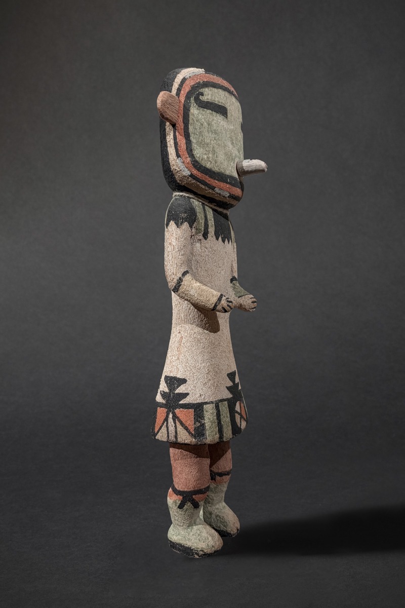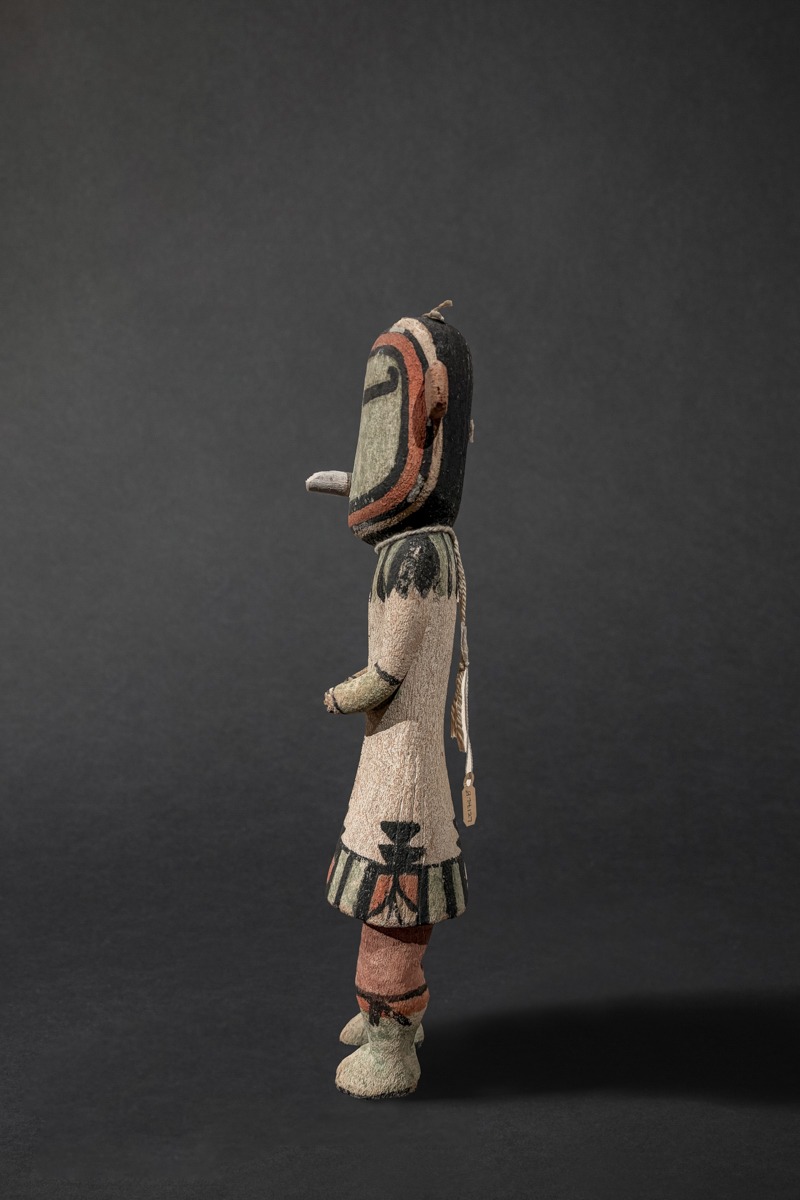 One of the most distinctive features of this Katsina doll is the beak or nose, which in some examples is formed from small cornhusk packets and in others—such as the present example—is rendered as a carved beak (a later addition). Painted lines encircling the face are understood to evoke rainbow colors. In ceremonial performances, the Koroasta Katsina traditionally carries a digging stick, as well as a bag of seeds distributed to spectators. These seeds are regarded as auspicious signs of forthcoming abundant harvests, and recipients are eager to plant them.