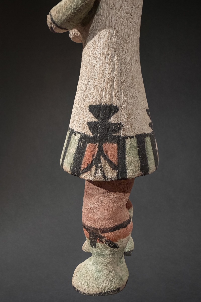 This Katsina doll is known as Koroasta, Korosoto, or Kwasaitaka, and is often referred to as the Dress Katsina doll. Among the Hopi, it corresponds to the Third Mesa sculptural form of the Zuni Koroasta (or Korosta) Katsina. The Hopi sometimes call it the Ota Katsina, named after the opening words of its song. The designation “Dress Katsina doll” derives from the fact that, although the Katsina spirit itself is considered male, it appears ceremonially dressed in a woman’s garment, typically without a belt.