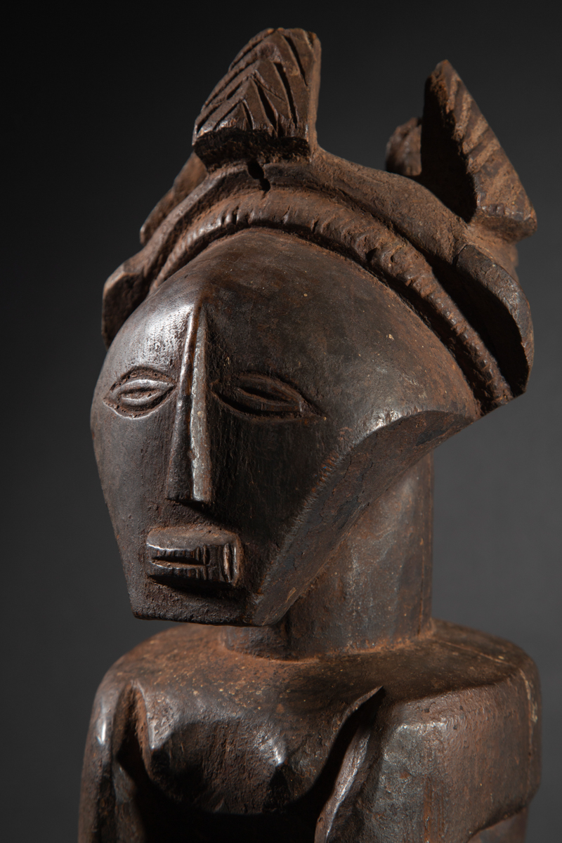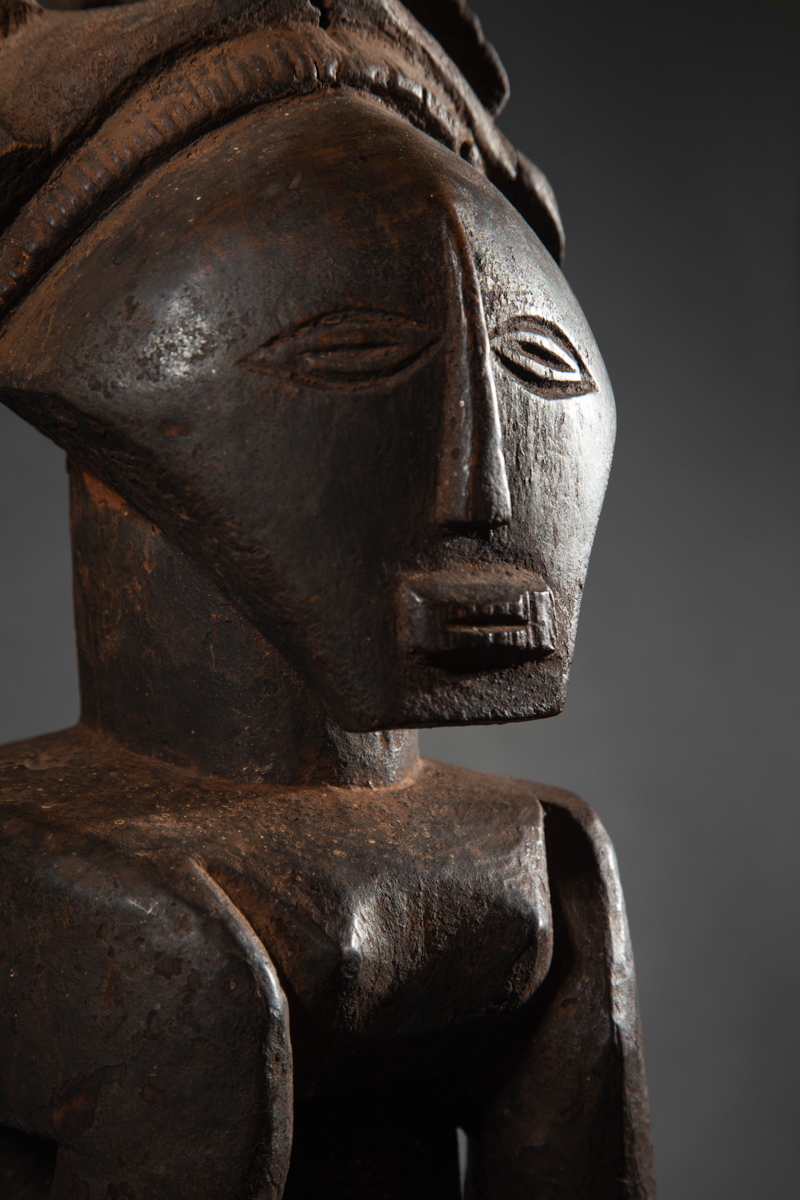 The ancestor figure presented here originates from the northern Hemba region, close to the Kusu and Bassikasingo. The Cubist stylization of the features is a notable Bassikasingo influence.