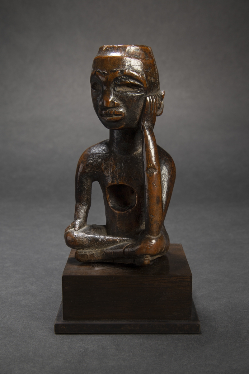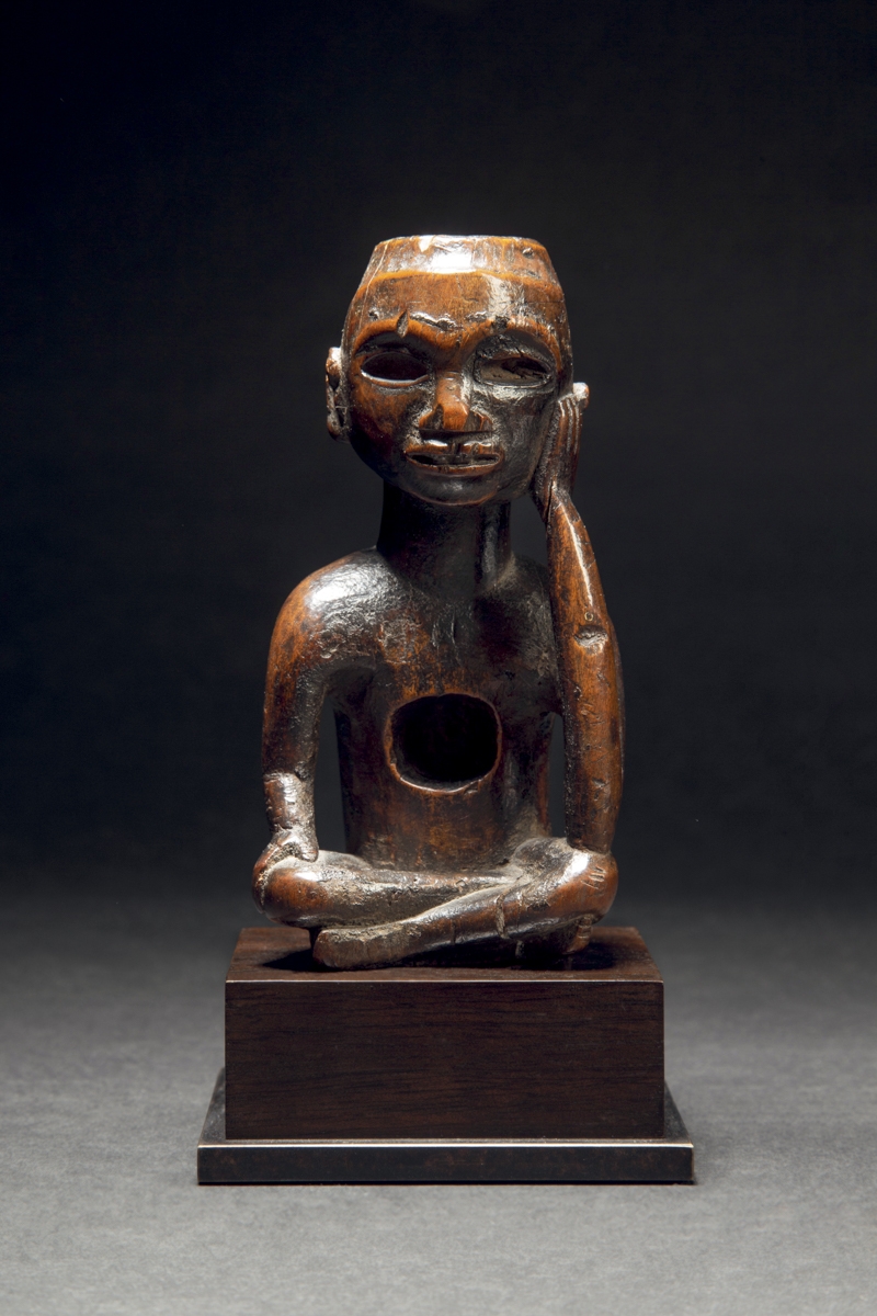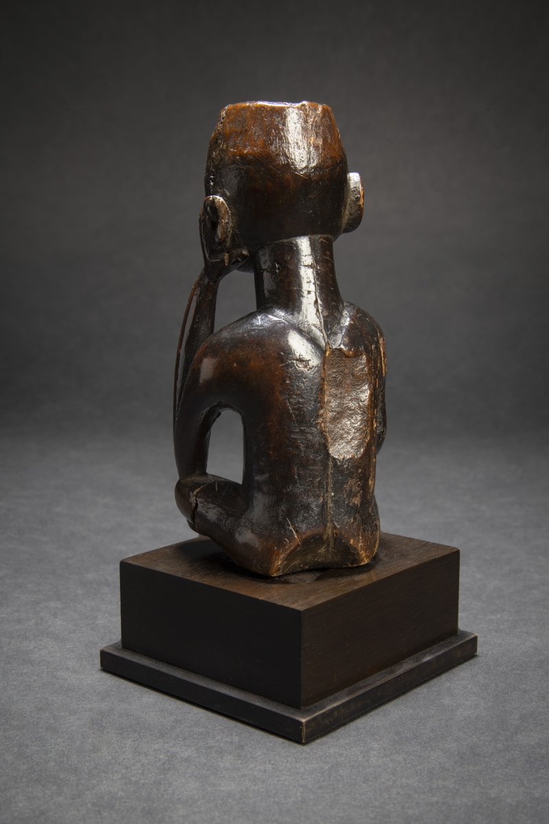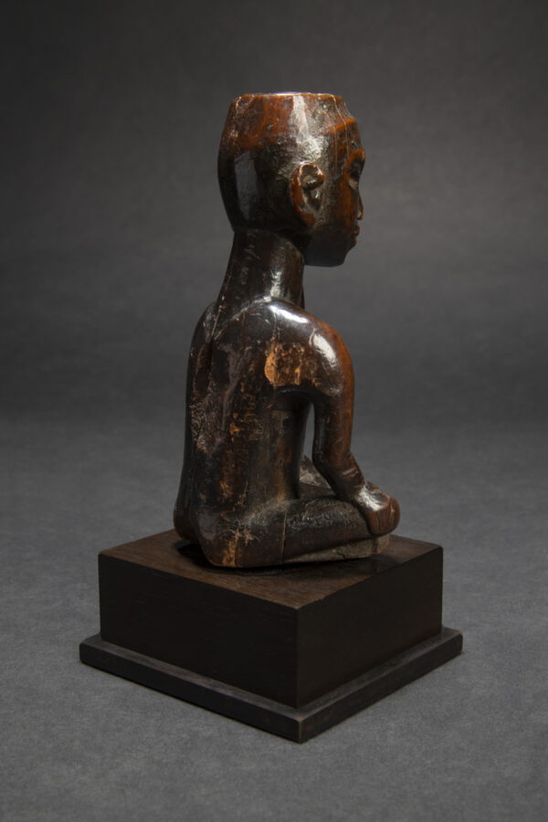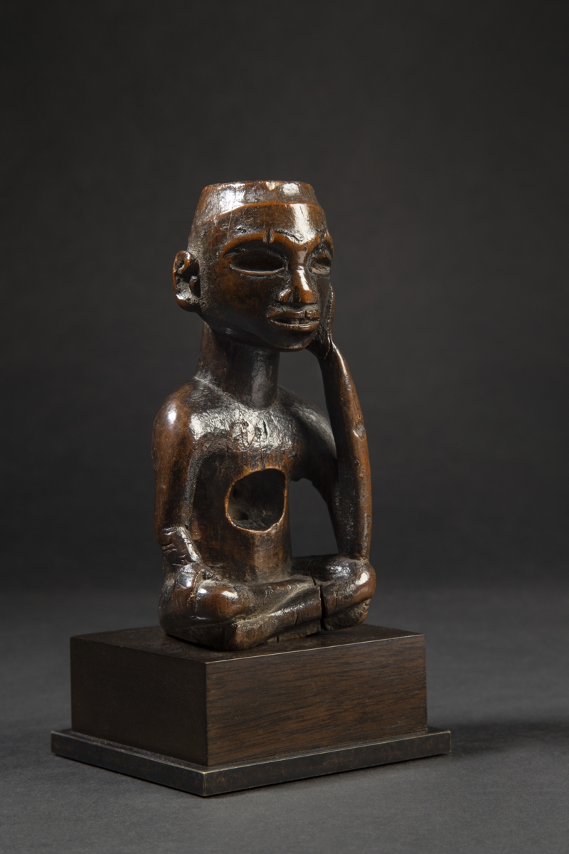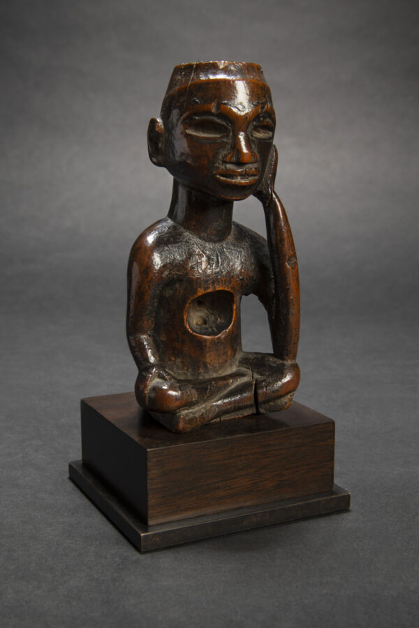 L'ancêtre ici se présente assis avec les jambes croisées, la tête reposant dans sa main droite.