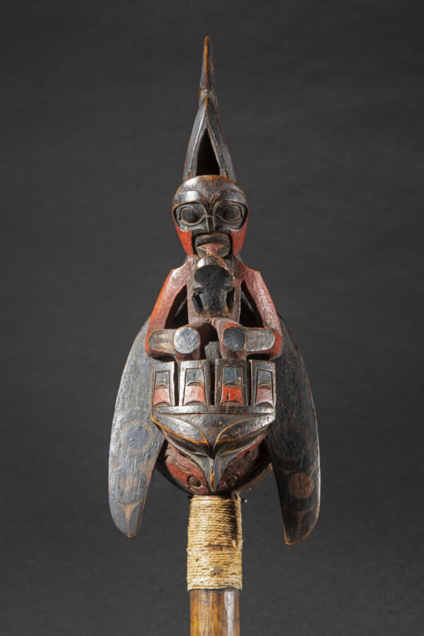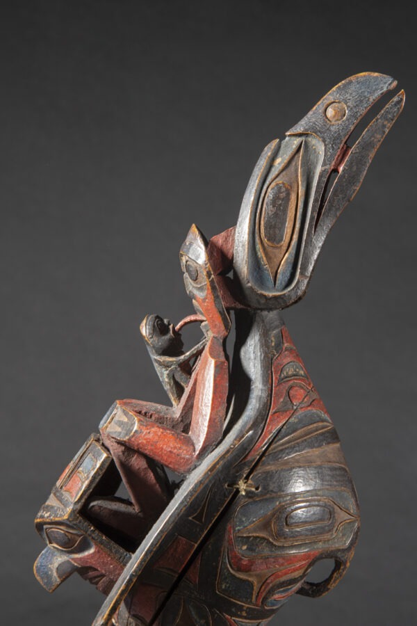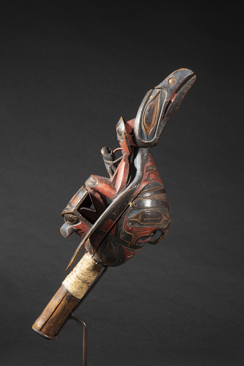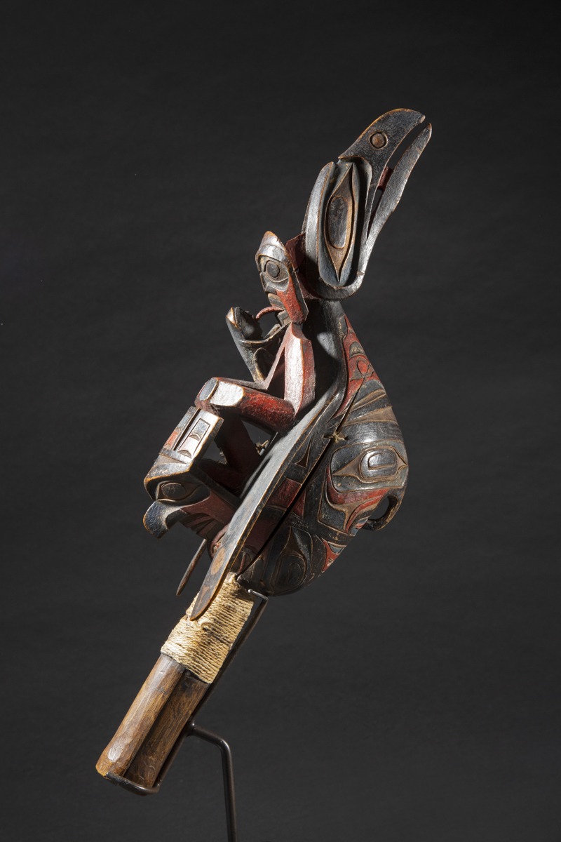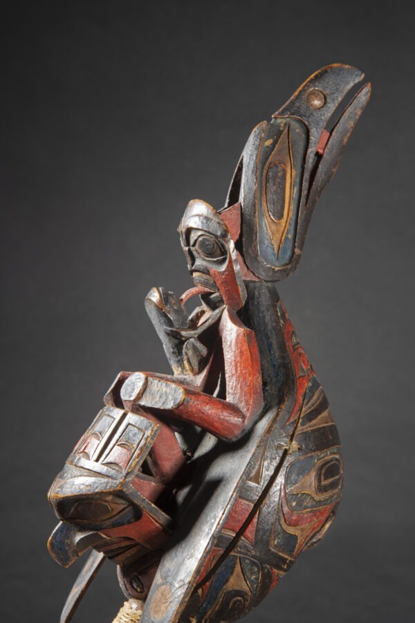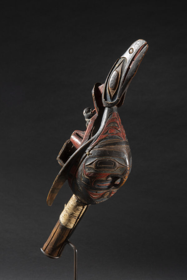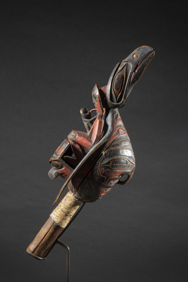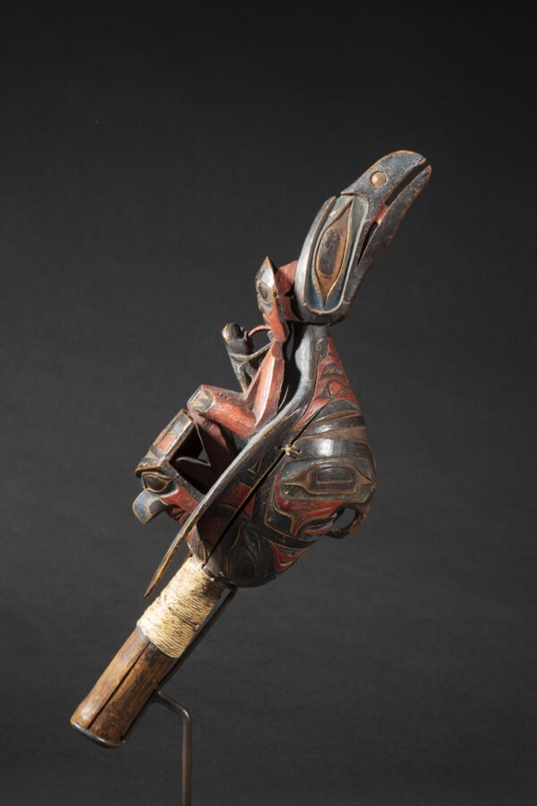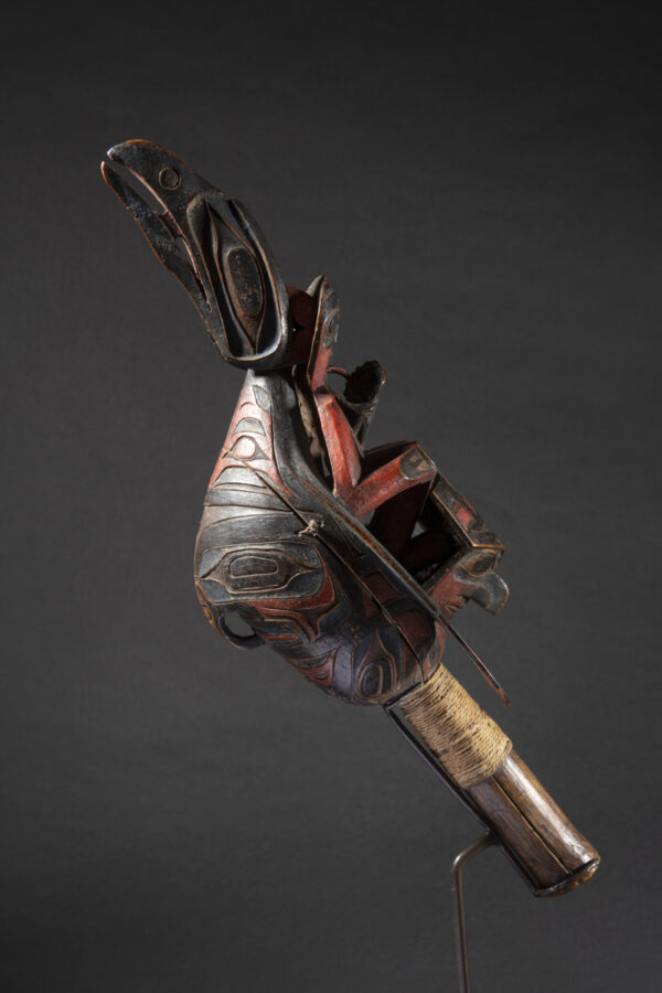 Raven rattles were used by wealthy families, chiefs and shamans. The use of a « chief’s rattle » proclaimed the shaman’s high social rank to his public.