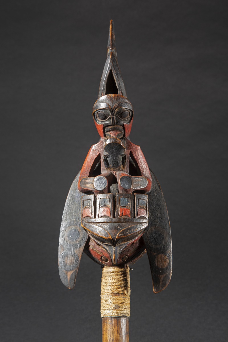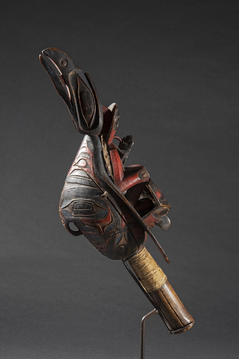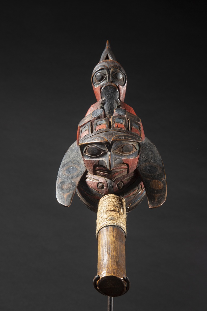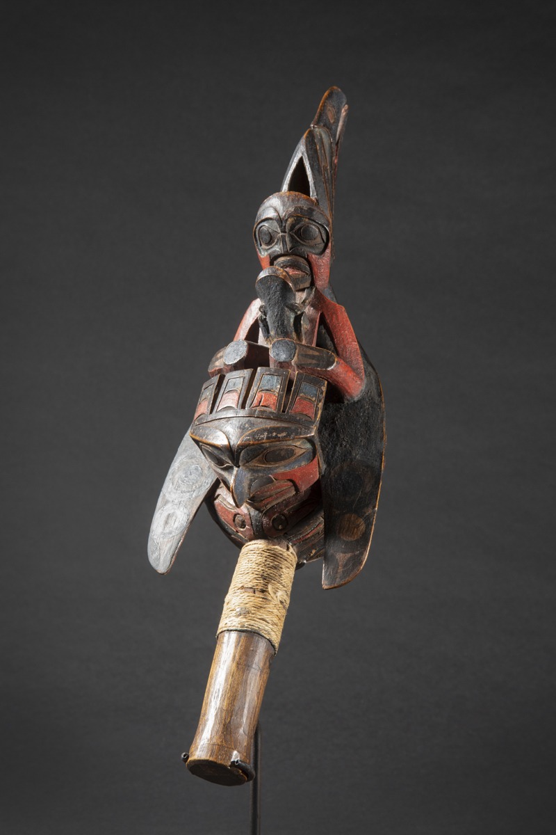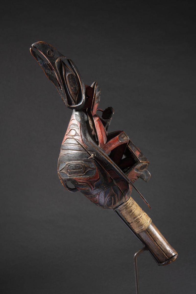 According to Allen Wardwell ("Tangible Visions", 1996 p. 239), the rattle was a highly important piece of shamanic equipment along the entire Northwest Coast. Its sound provided rhythm for songs, dances and chants, and attracted spirits to the séances. Wherever it was used, a supernatural presence was thought to be in attendance.