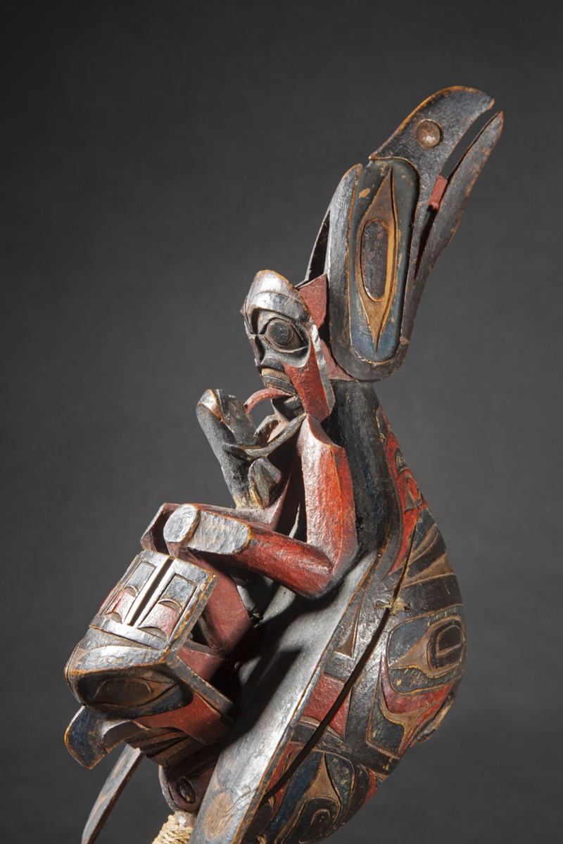 Raven rattles such as the present example are sheer icons of ancient Native American art. In Northwest Coast myths, a Raven spirit originally taught shamans the secrets of their crafts. On this rattle, the human figure reclining on the back of the raven represents a shaman in trance, forming alliance with animal helping spirits.