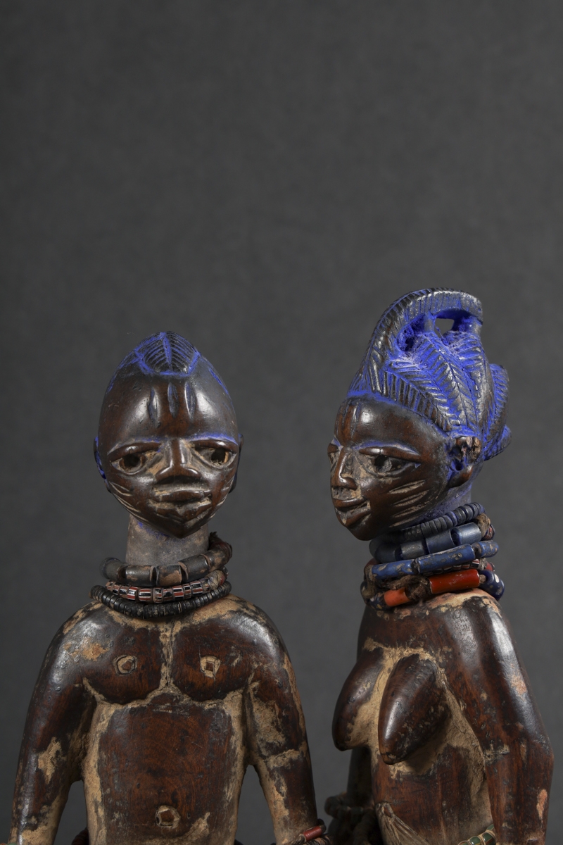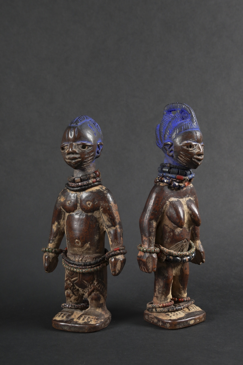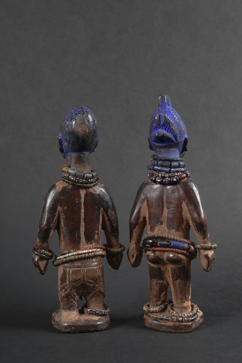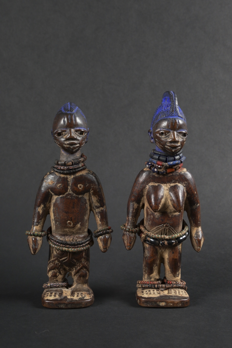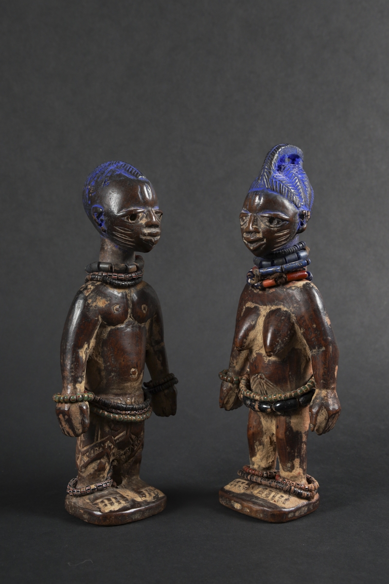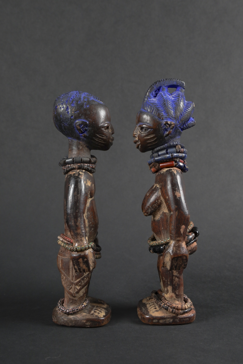 The statuettes linked to twin worship, are called ere ibeji in the Yoruba language: ere signifying a sacred image, ibi born and eji a double. Symbols of prestige, wealth and fecundity, ere ibeji figures also guaranteed the perpetuation of future generations. These