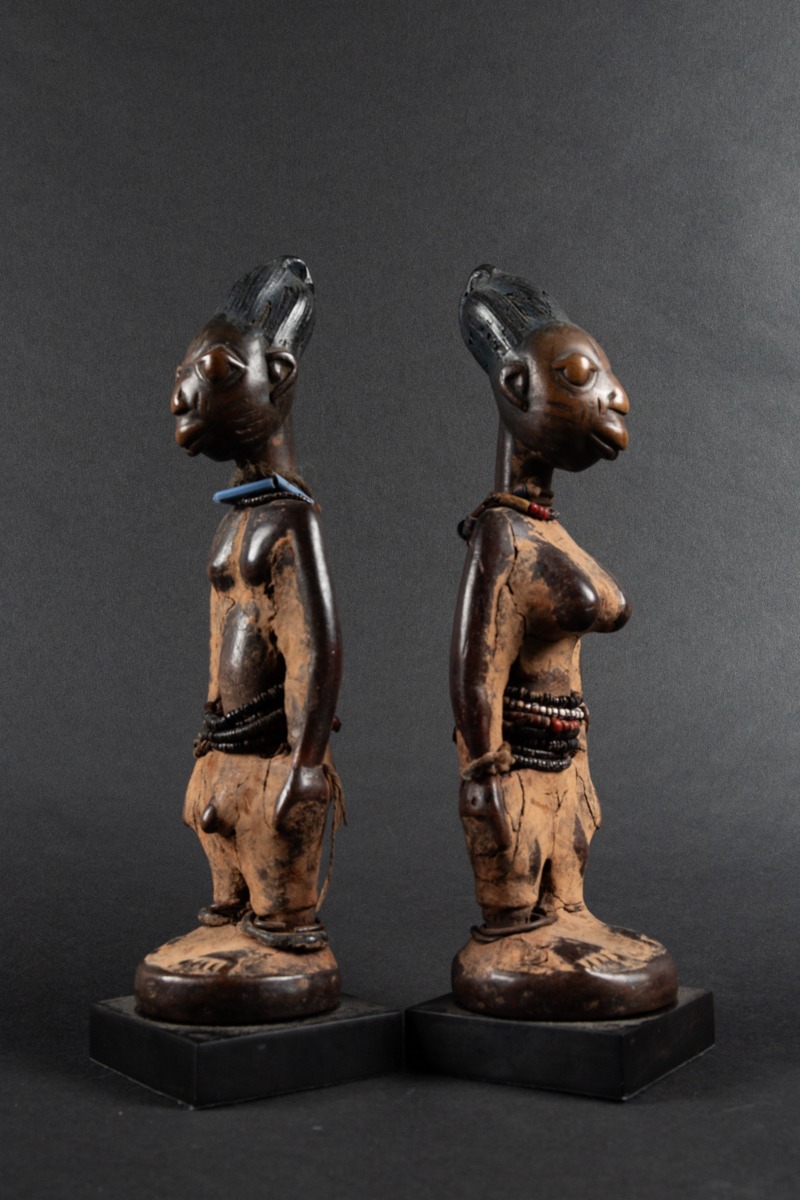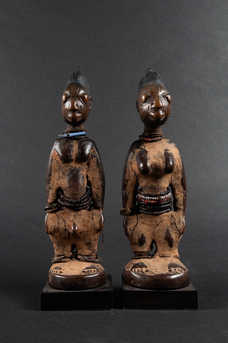 The statuettes linked to twin worship, are called ere ibeji in the Yoruba language: ere signifying a sacred image, ibi born and eji a double. Symbols of prestige, wealth and fecundity, ere ibeji figures also guaranteed the perpetuation of future generations. These effigies of ancestors were an integral part of everyday activities, punctuating the family life of the Yoruba. Subject to very codified rituals, ere ibeji figures were pampered, with their care including feeding, washing and oiling.