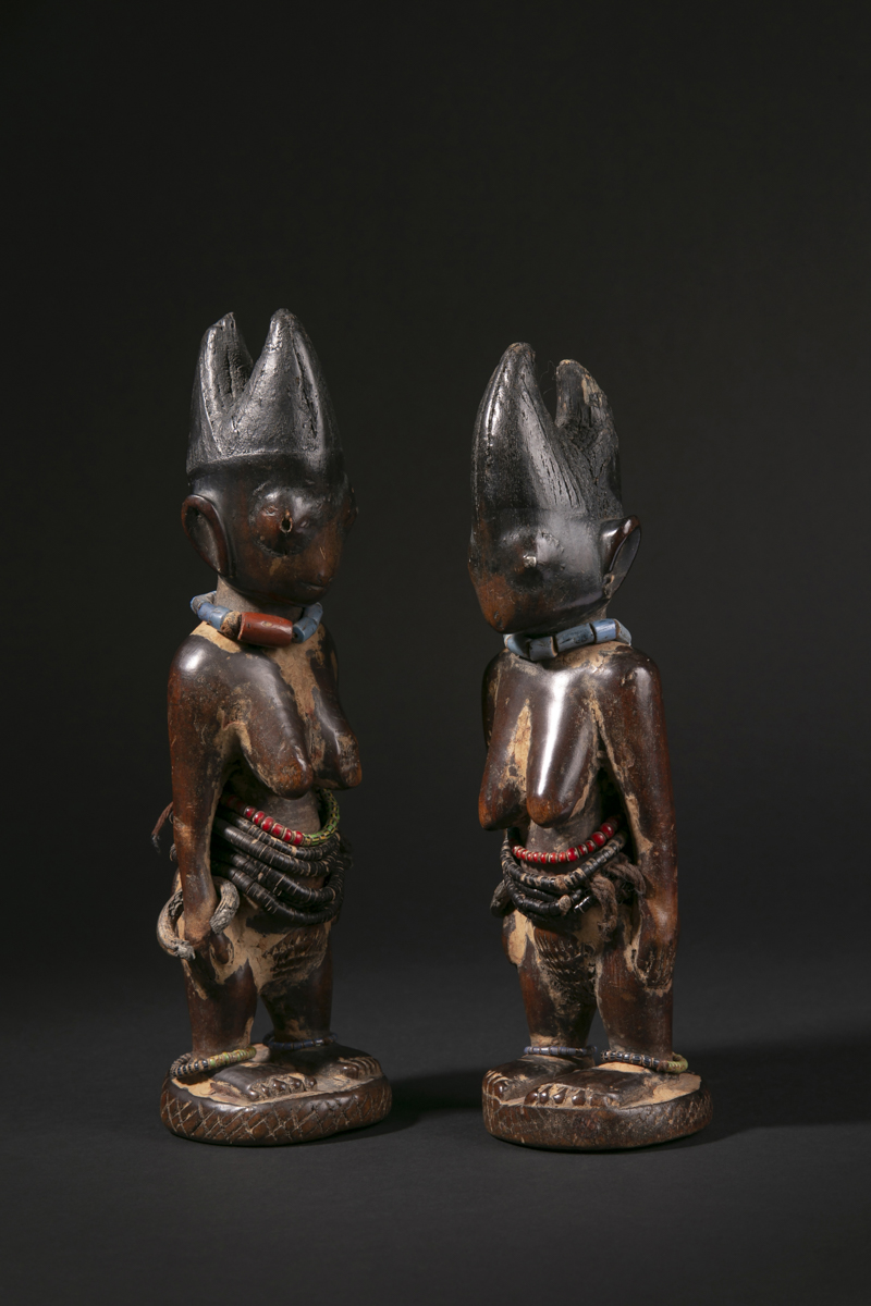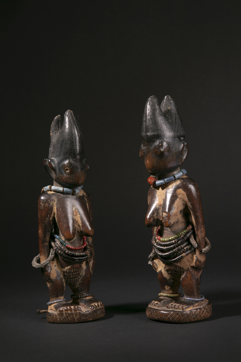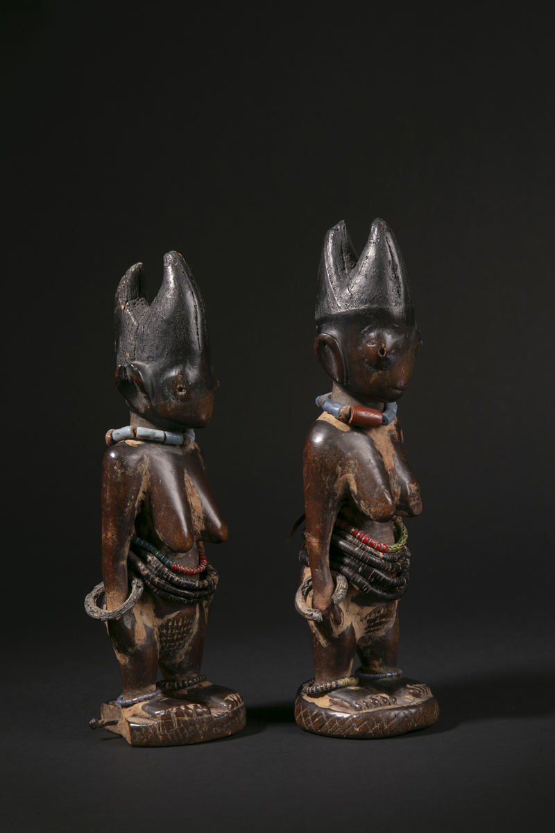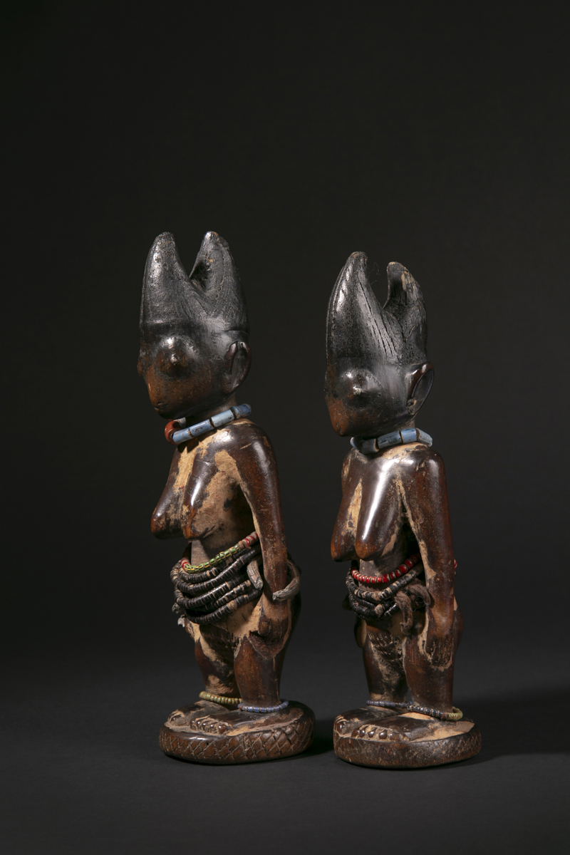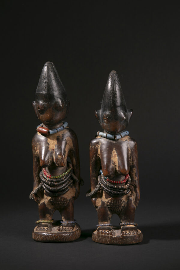 Symboles de prestige, de richesse et de fécondité, les ere ibeji garantissaient également la perpétuation des générations. Ces effigies d’ancêtres faisaient partie intégrante de la vie quotidienne et rythmaient la vie familiale chez les Yoruba. Soumis à des rites codifiés, les ere ibeji étaient choyés, nourris, soignés, huilés, lavés. Ils étaient considérés comme des êtres vivants, réincarnation des jumeaux-ancêtres. Ils étaient toujours représentés dans la force et la puissance de l’âge adulte.