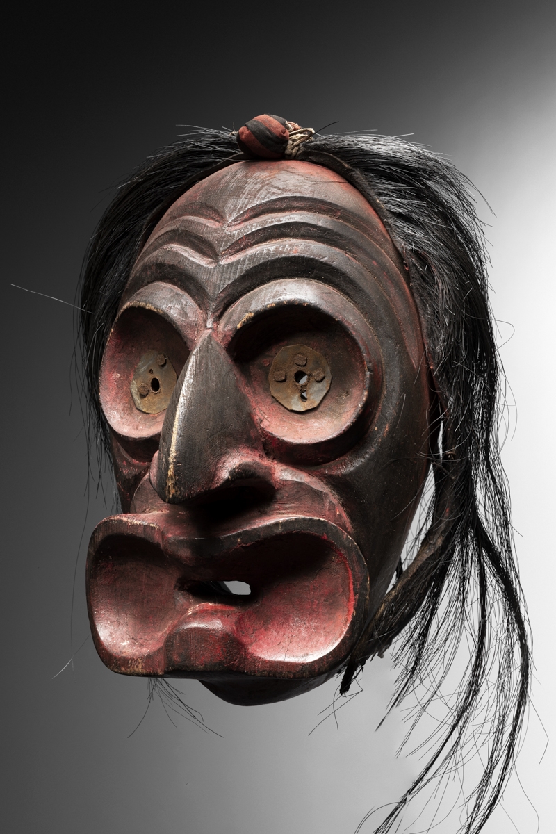 D’une extrême rareté dans les collections privées et muséales, les masques anciens de la Société des Faux Visages (False Faces Society) présentent un visage aux traits déformés, la bouche donnant l’impression de souffler de la fumée.