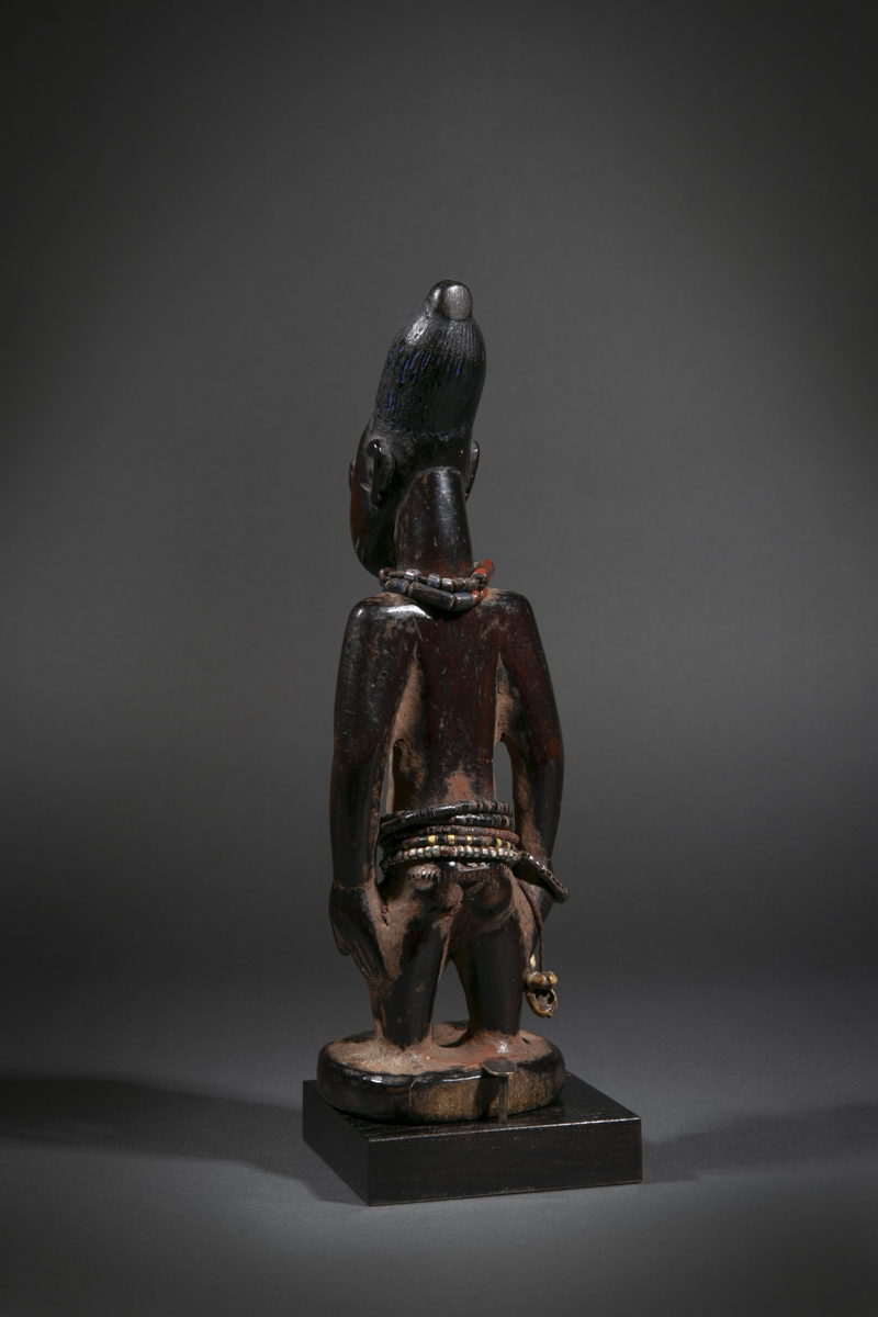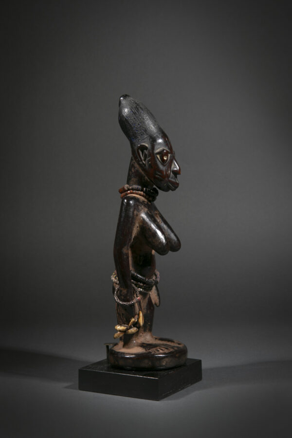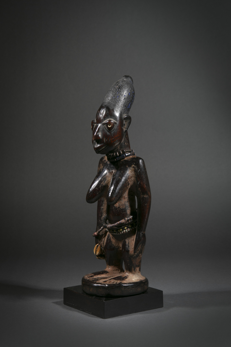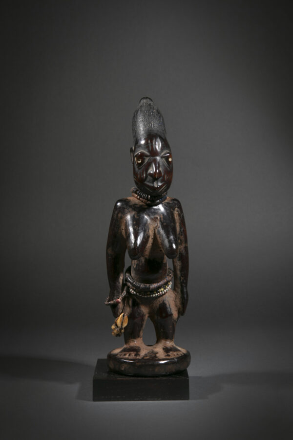 The statuettes linked to twin worship, are called ere ibeji in the Yoruba language: ere signifying a sacred image, ibi born and eji a double. Symbols of prestige, wealth and fecundity, ere ibeji figures also guaranteed the perpetuation of future generations. These