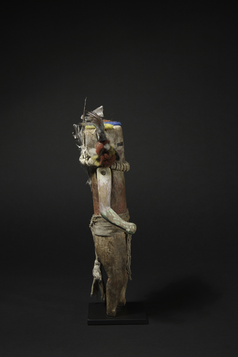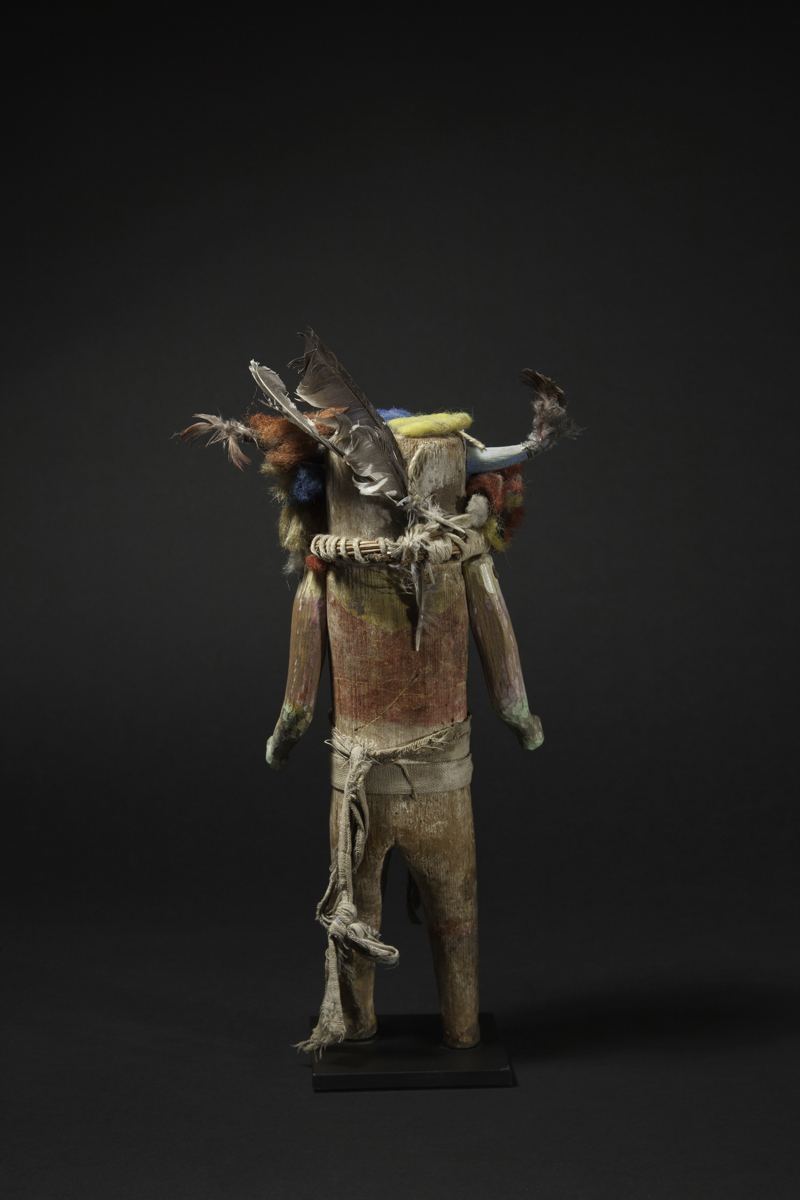 Carved wood, natural pigments, fiber and feathers