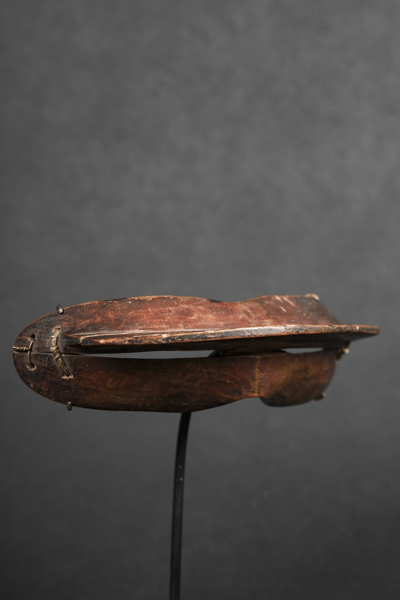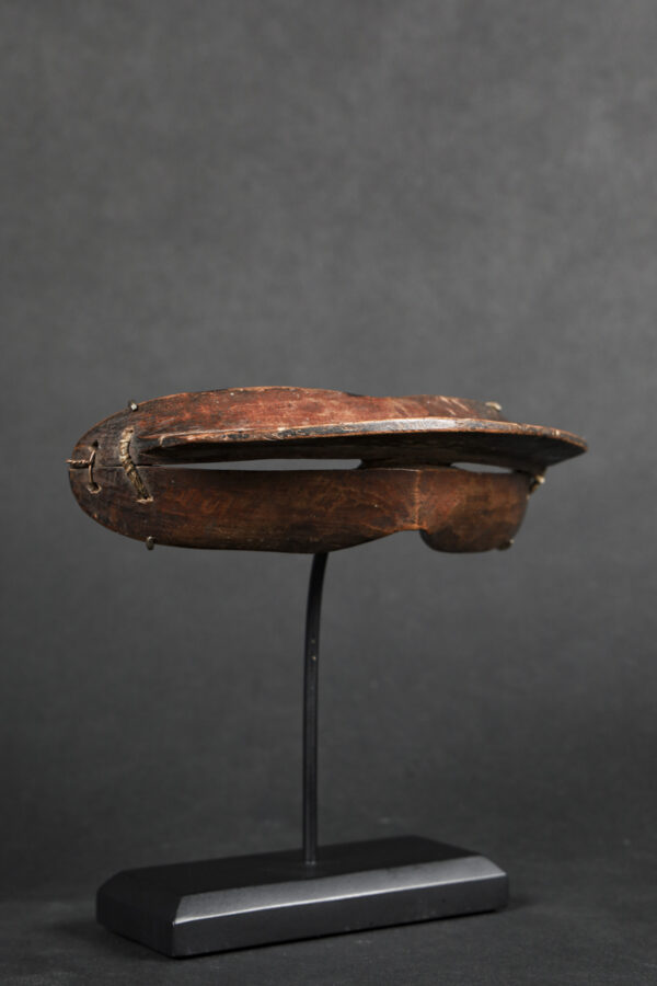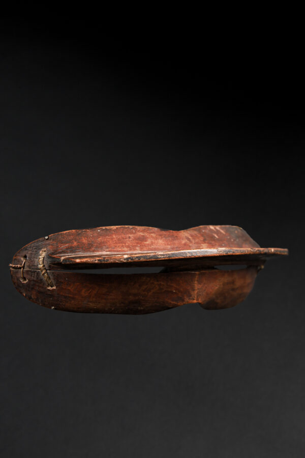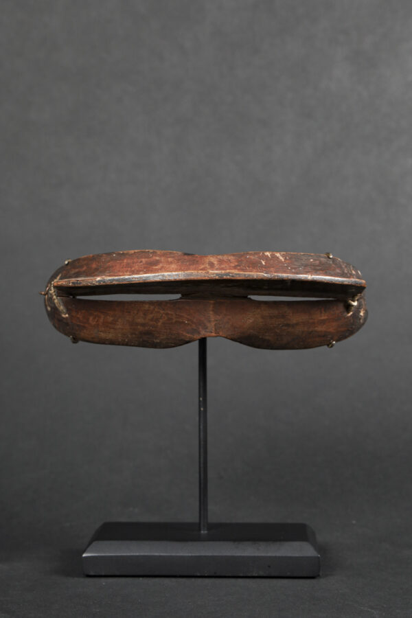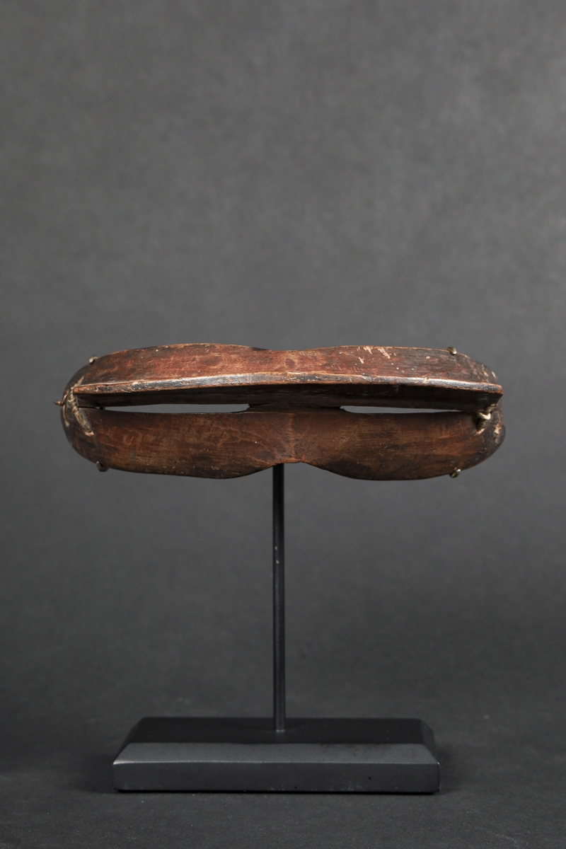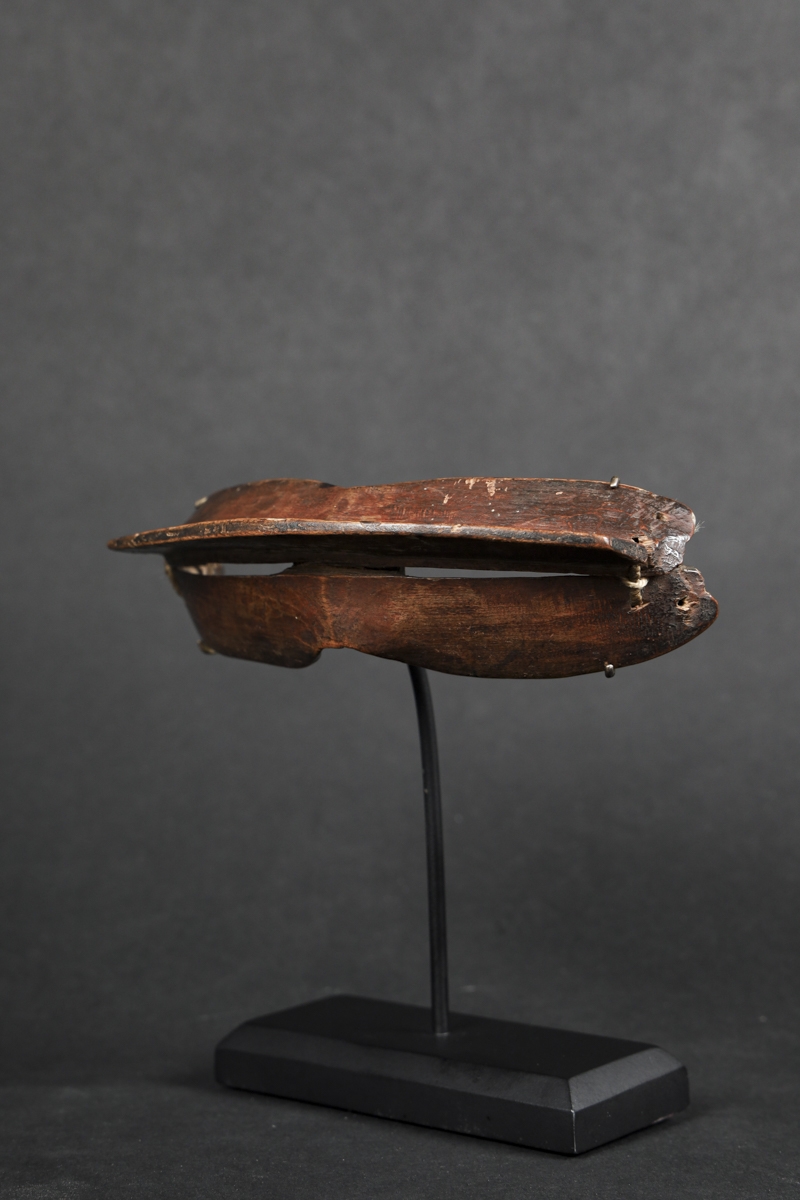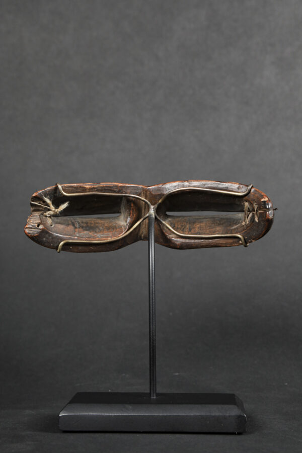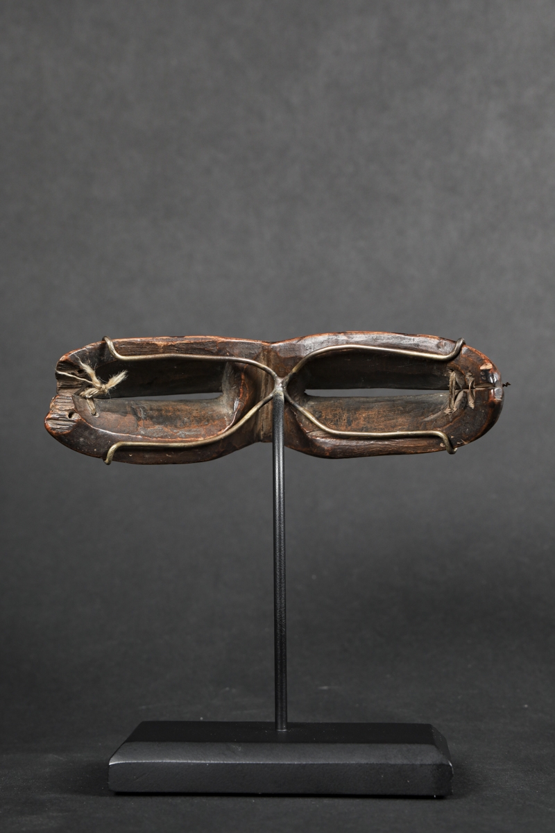Cet artefact, objet utilitaire ingénieux, est ici élevé au rang d'œuvre d'art. Ces lunettes, à la ligne épurée, ont été sculptées pour épouser les contours du visage du chasseur de façon remarquable.