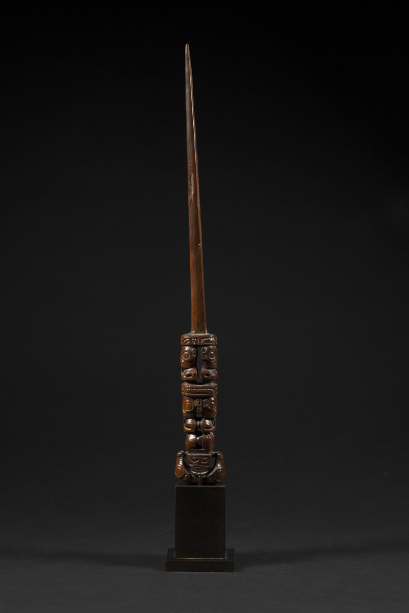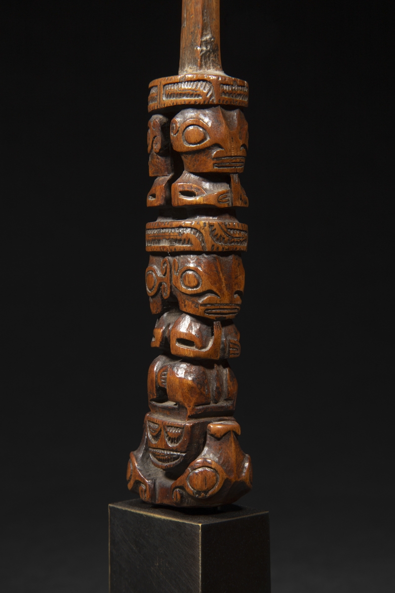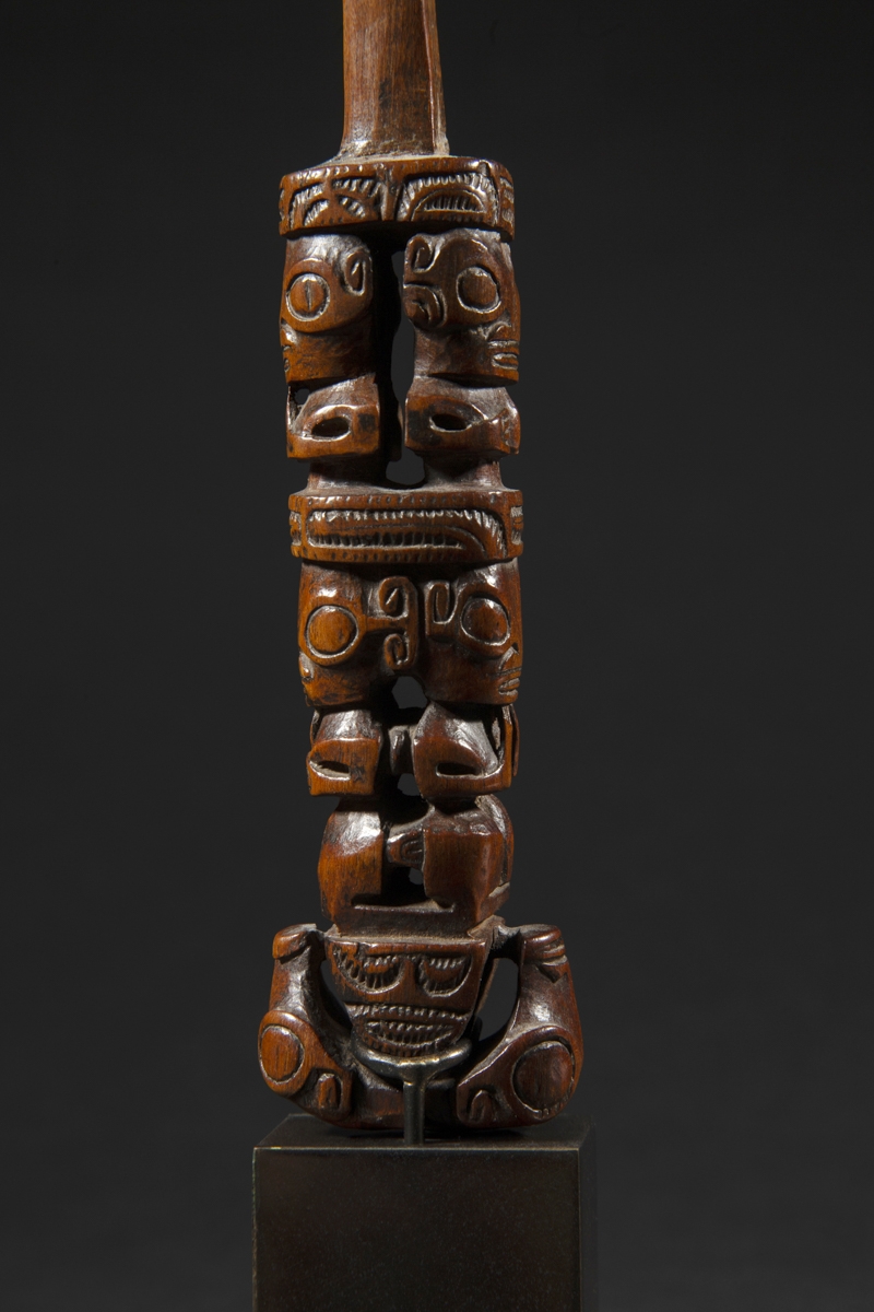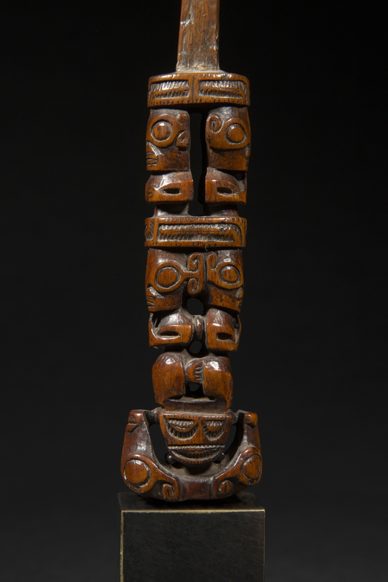 This fan handle with a historic pedigree is composed of two sets of tiki standing back to back, surmounting upside-down figures with elongated faces.