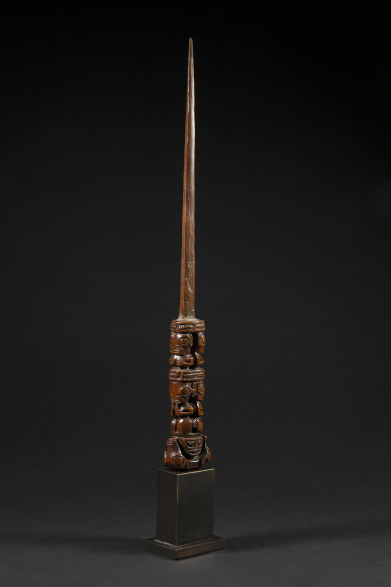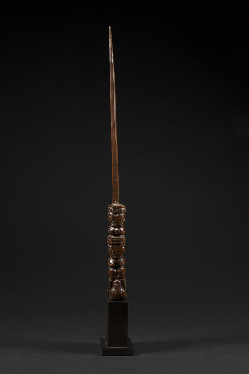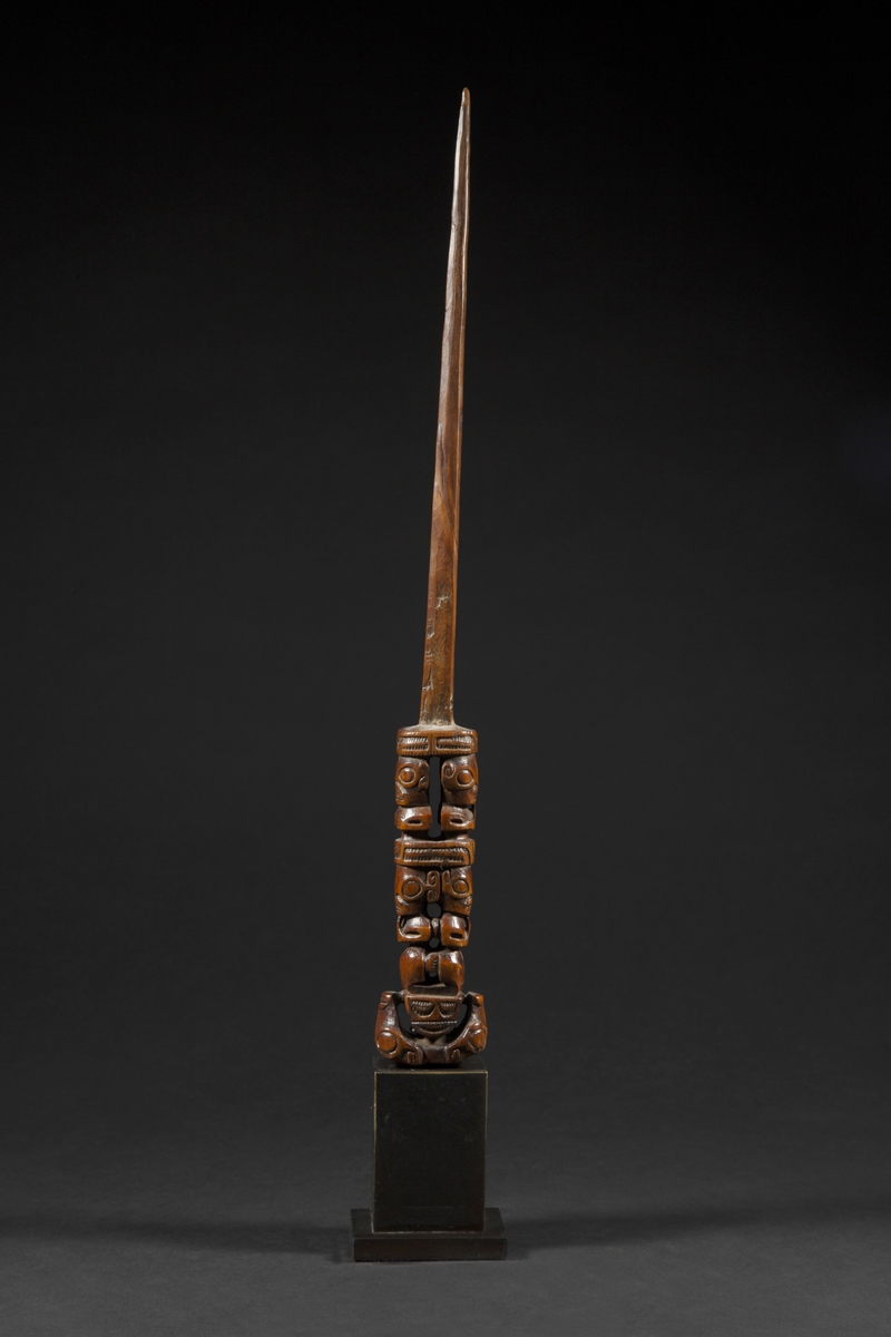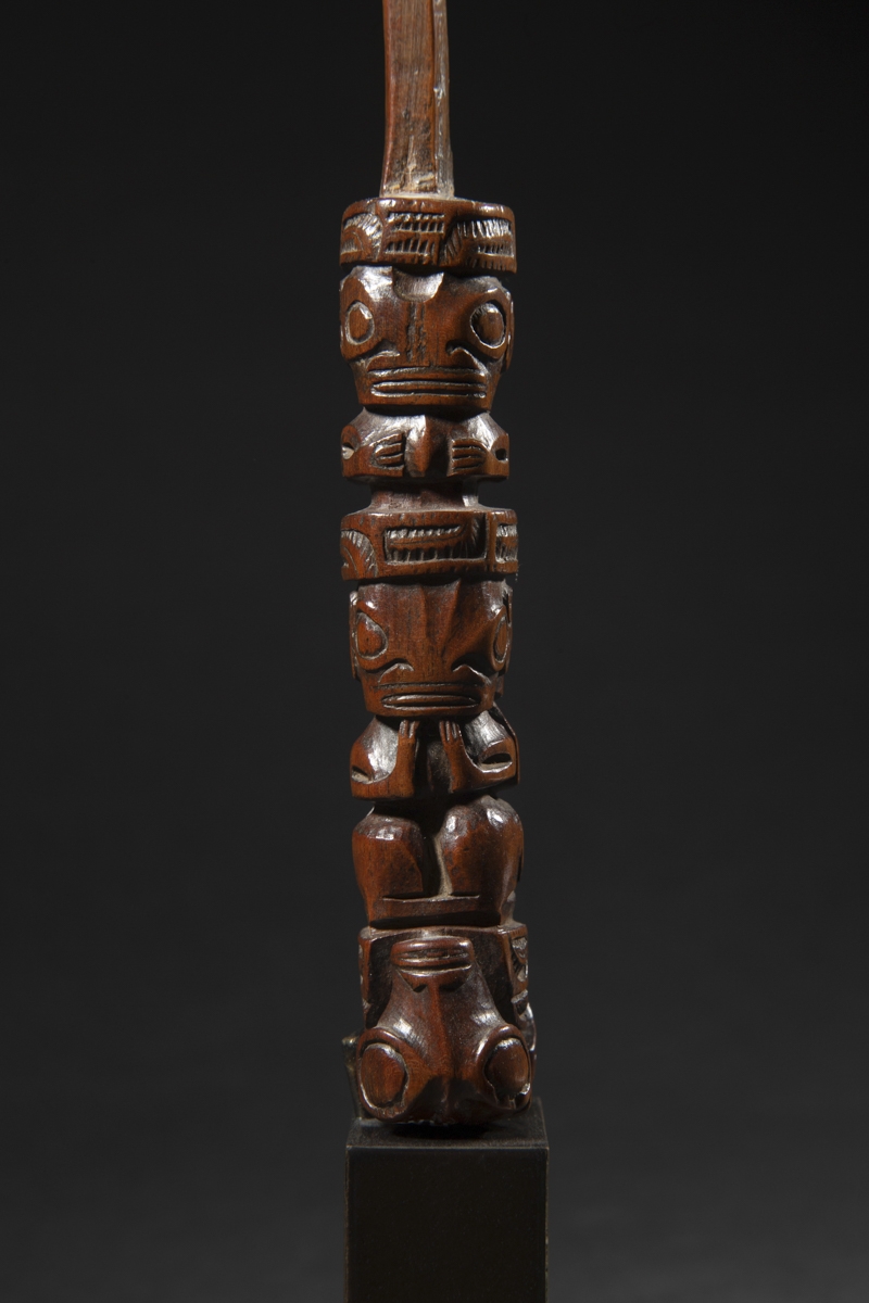 This fan handle with a historic pedigree is composed of two sets of tiki standing back to back, surmounting upside-down figures with elongated faces.