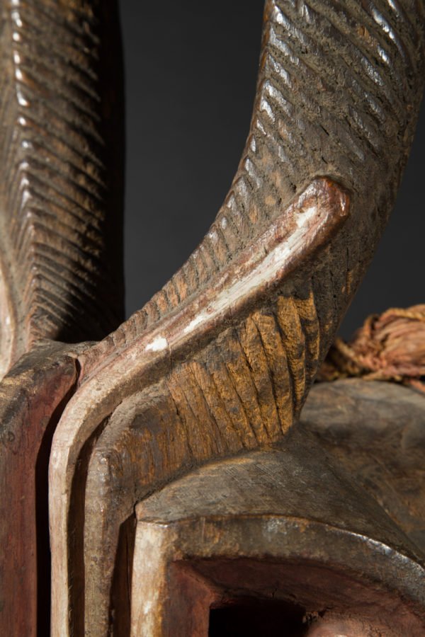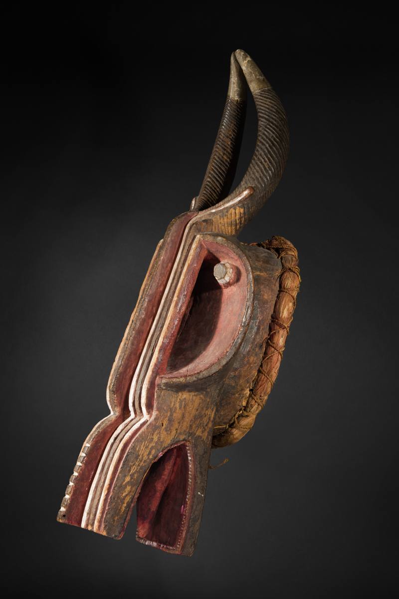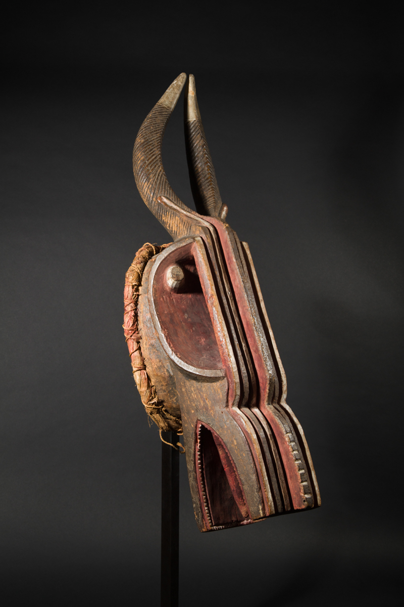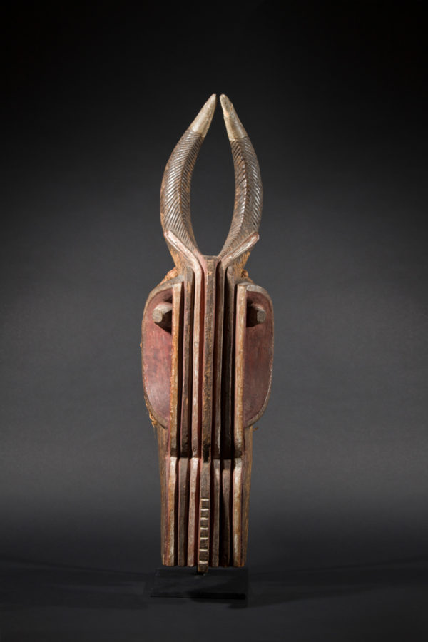 This spectacular mask is distinguished by its expressiveness and power of evocation. In terms of iconography, it combines the features of a bushcow, the horns of a gazelle / antelope and the snout of a crocodile. It is painted red, symbolizing blood, strength and power.
