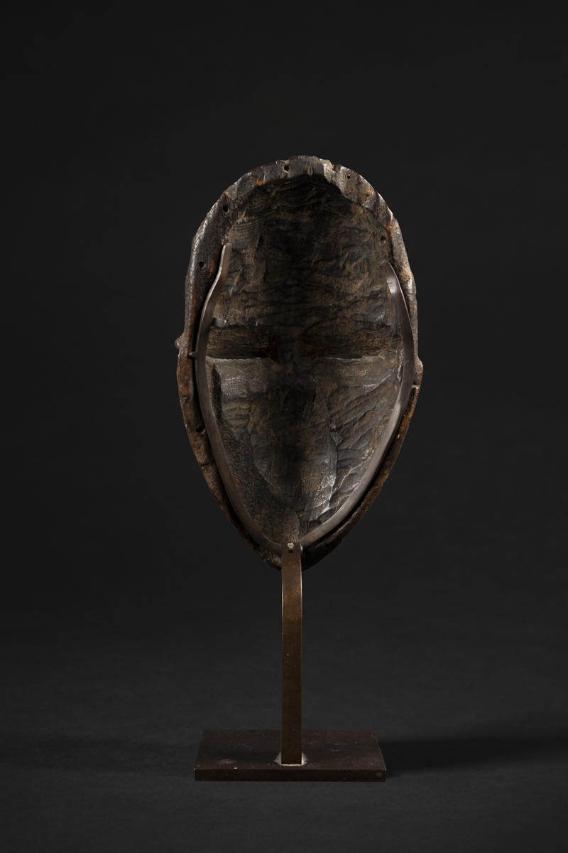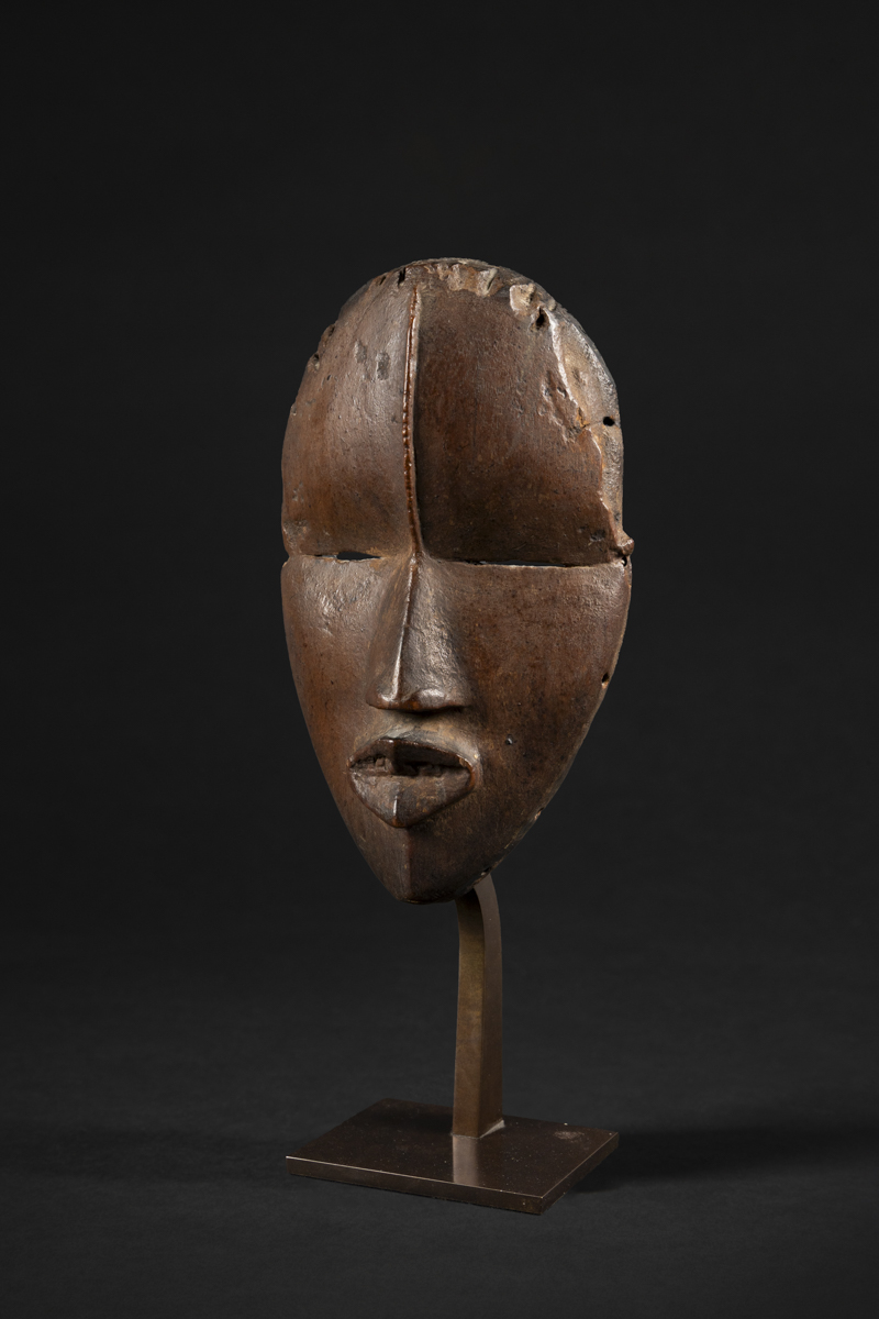 Ce fini remarquable témoigne d'une utilisation rituelle prolongée et renforce l'équilibre entre rigueur formelle et expressivité — le regard suggéré par de fines fentes et la bouche délicatement entrouverte, conférant à ce masque ancien une intensité à la fois sobre et pénétrante.