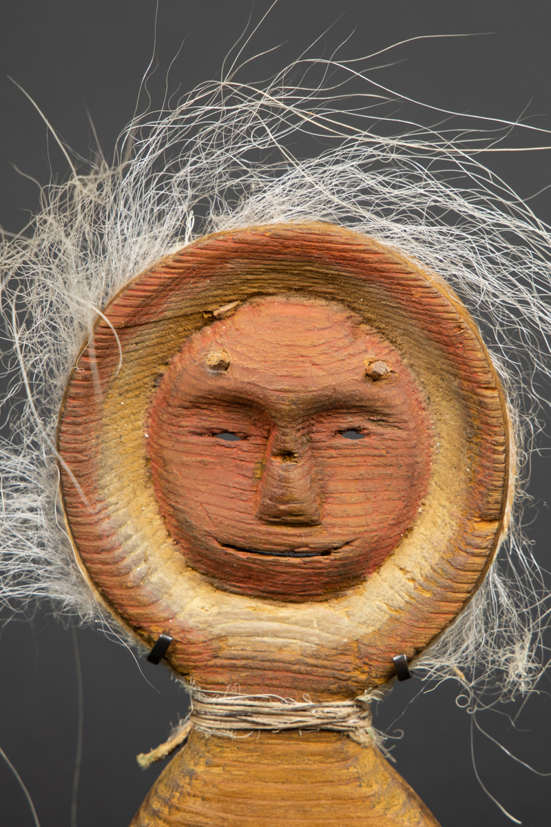 Ces masques de doigts étaient utilisés pour mieux articuler les mouvements importants des mains du chamane lors de ses danses . Dans notre cas, le personnage représenté est l’esprit, Inua.