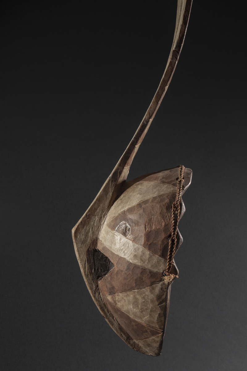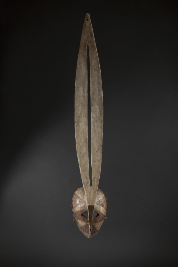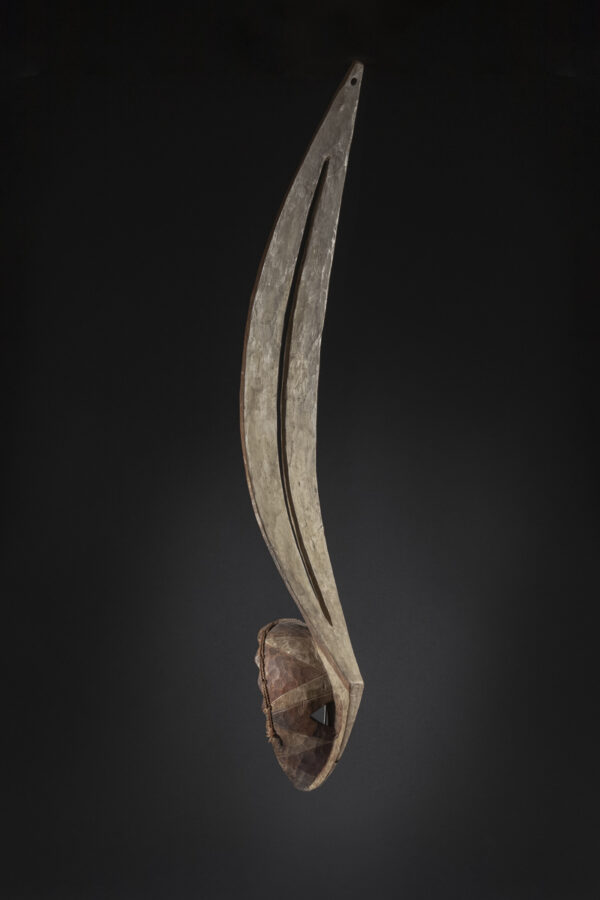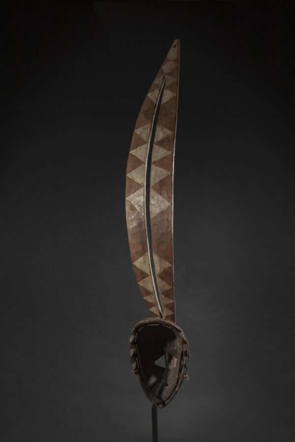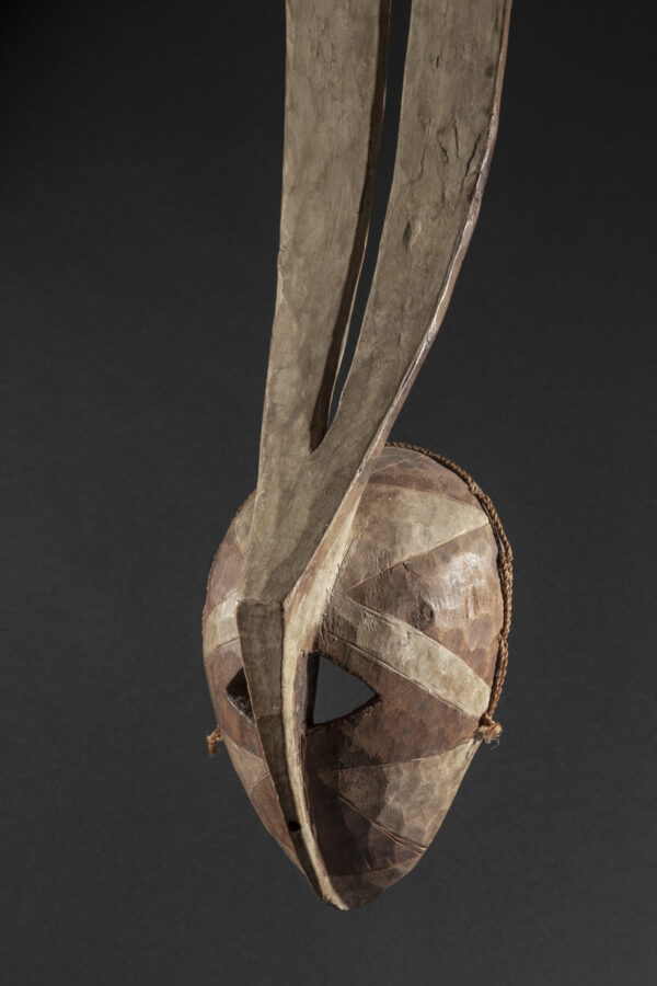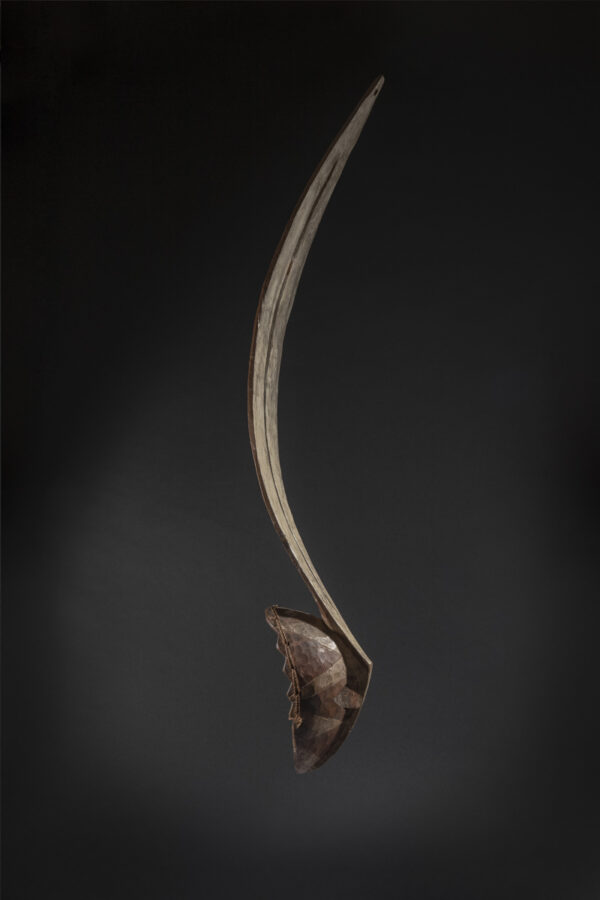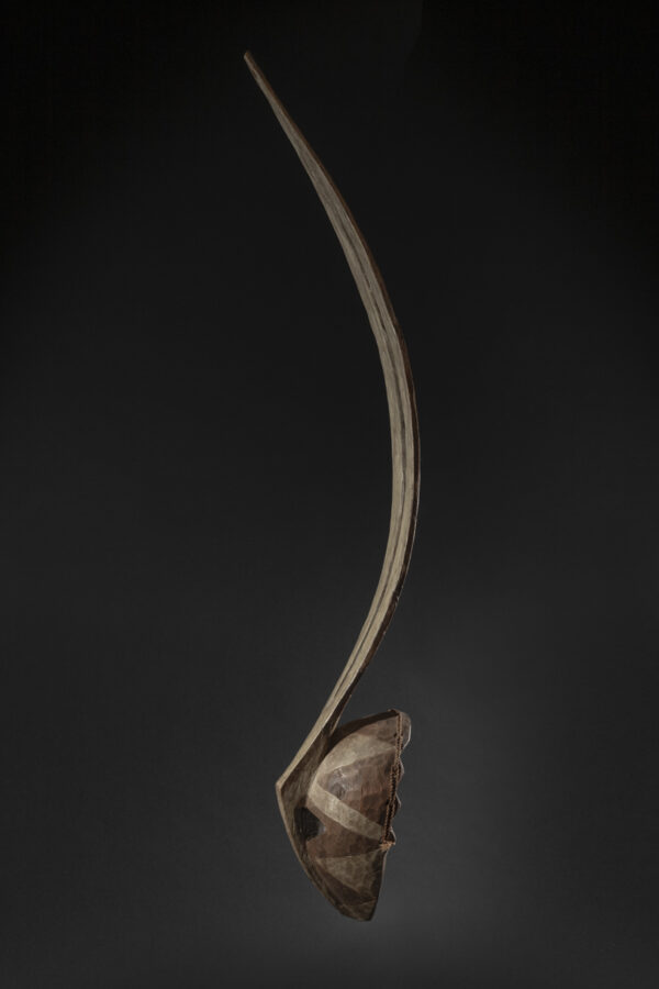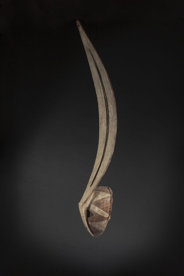 Ce masque se présente sous la forme d’un visage stylisé, peint de motifs géométriques blancs et rouges. Les yeux en triangle encadrent une arrête nasale prononcée se prolongeant en une magnifique courbe évoquant deux grandes cornes d’antilope. Il se dégage de ce masque à la construction saisissante une grande poésie.