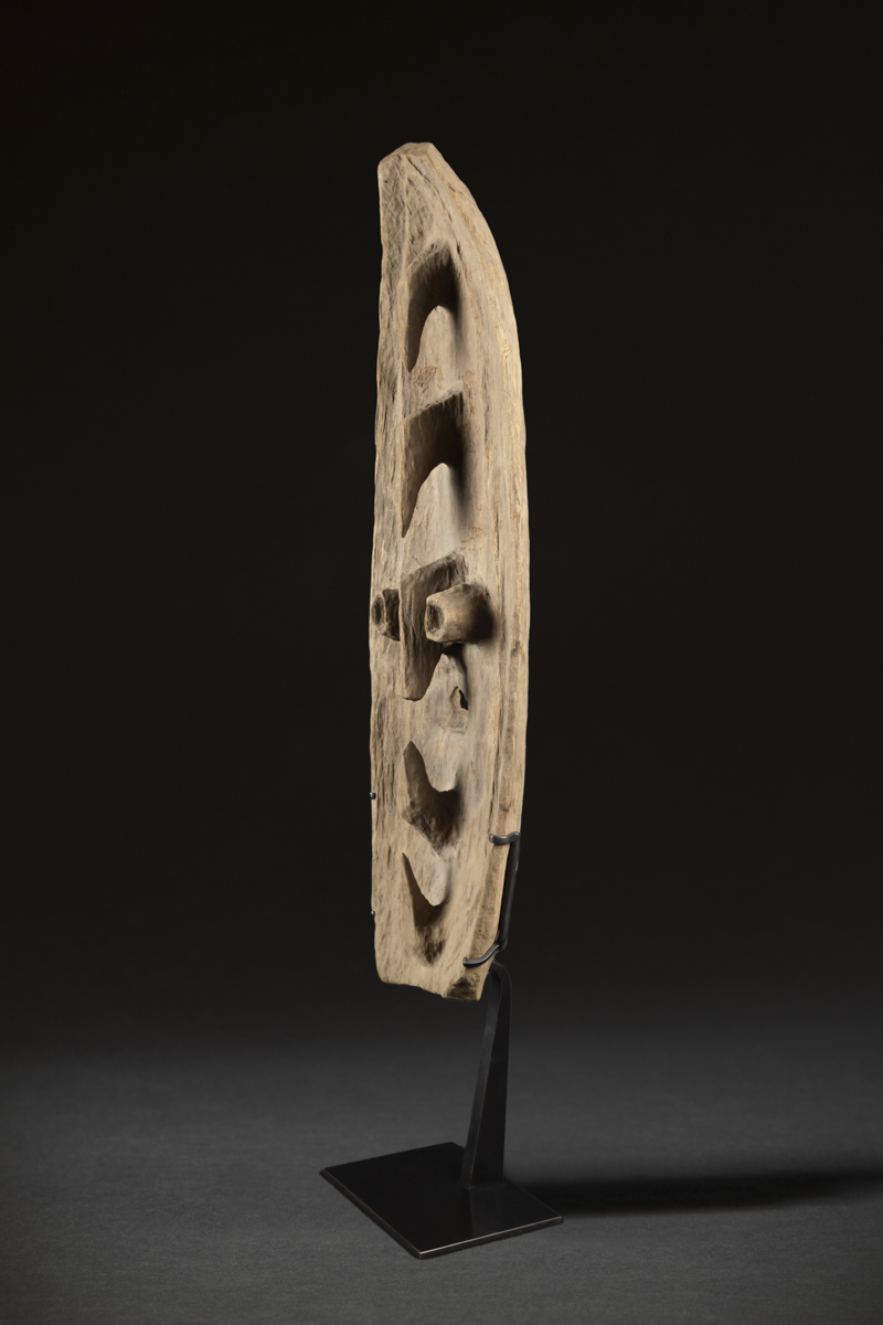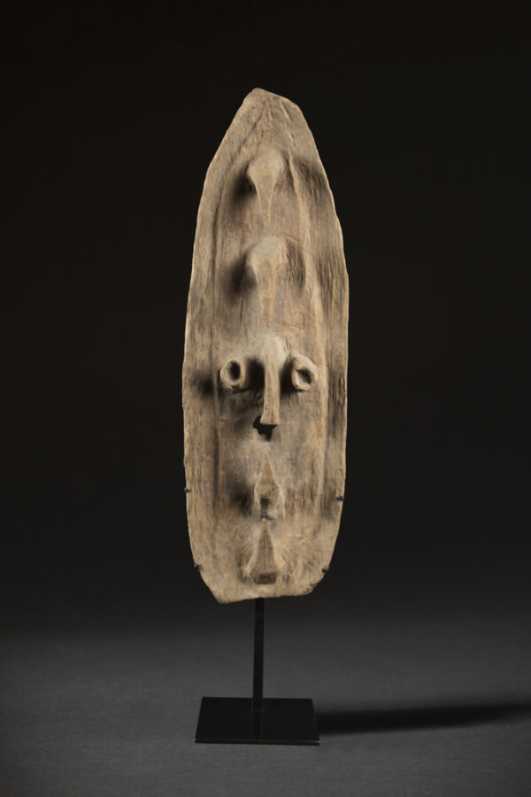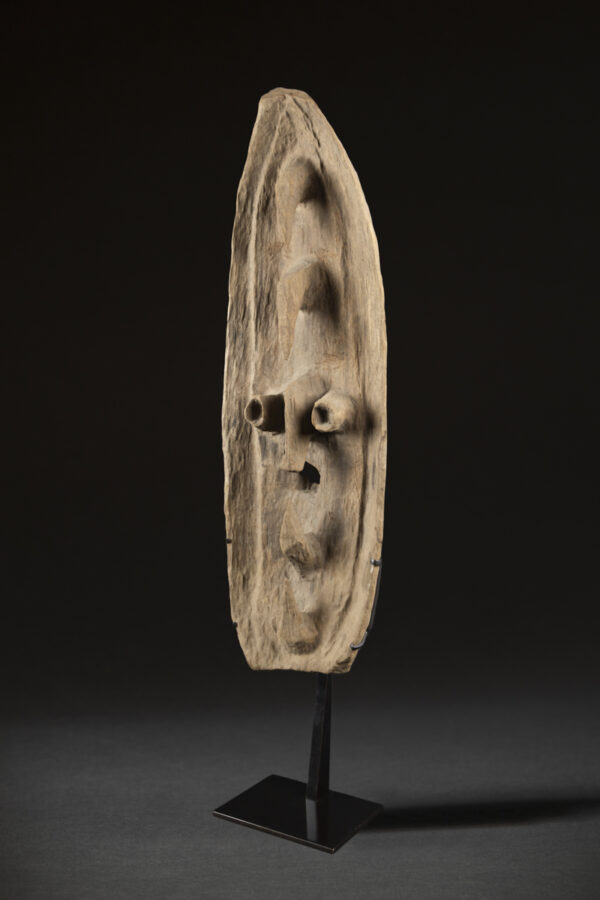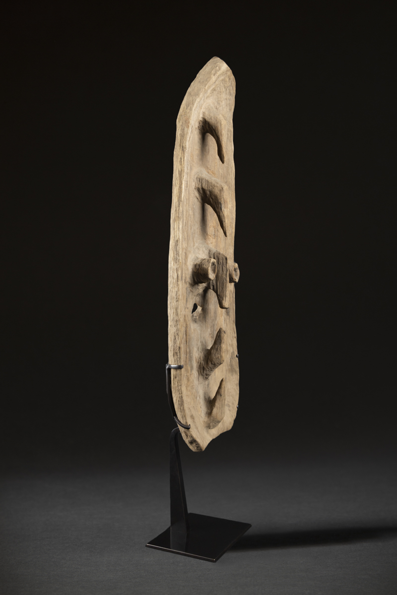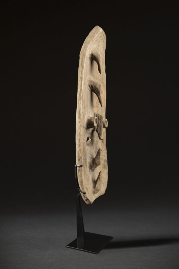 Each type of hook-mask figure is broadly associated with a different category of spirits. While interpretation of their imagery varies, the hook features of the flat mask panels are typically interpreted as hornbill’s beaks, while the longer, more extended images tend to be identified as stylized catfish, the hooks representing their curling whiskers. The flat, mask-like images were the focus of male initiation rites and hunting and were linked to senior men, elders of the clan and forest spirits. The association with hornbills derives from the fact that the birds nest in locations where bush spirits are known to dwell. Furthermore, the consumption of hornbills themselves, as well as the use of their spectacular feathers and beaks, were the reserve of initiated elders. When not in use, the images were stored in the men’s ceremonial house along with other sacred objects or suspended from the rafters, safely concealed from uninitiated eyes. The more slender hooklike figures tend to be associated with water spirits and were ideally immersed in swamps or other watery places. Although all garra figures fall into these two broad categories, each portrays a specific spirit whose name and powers were intimately known to the individual man who owned it.