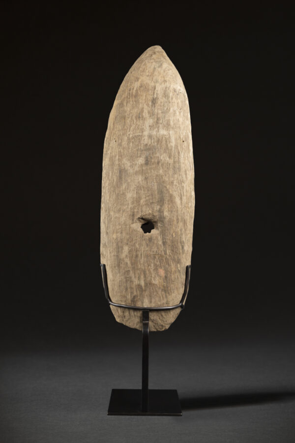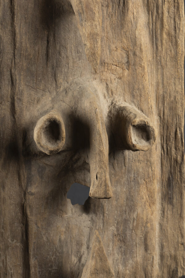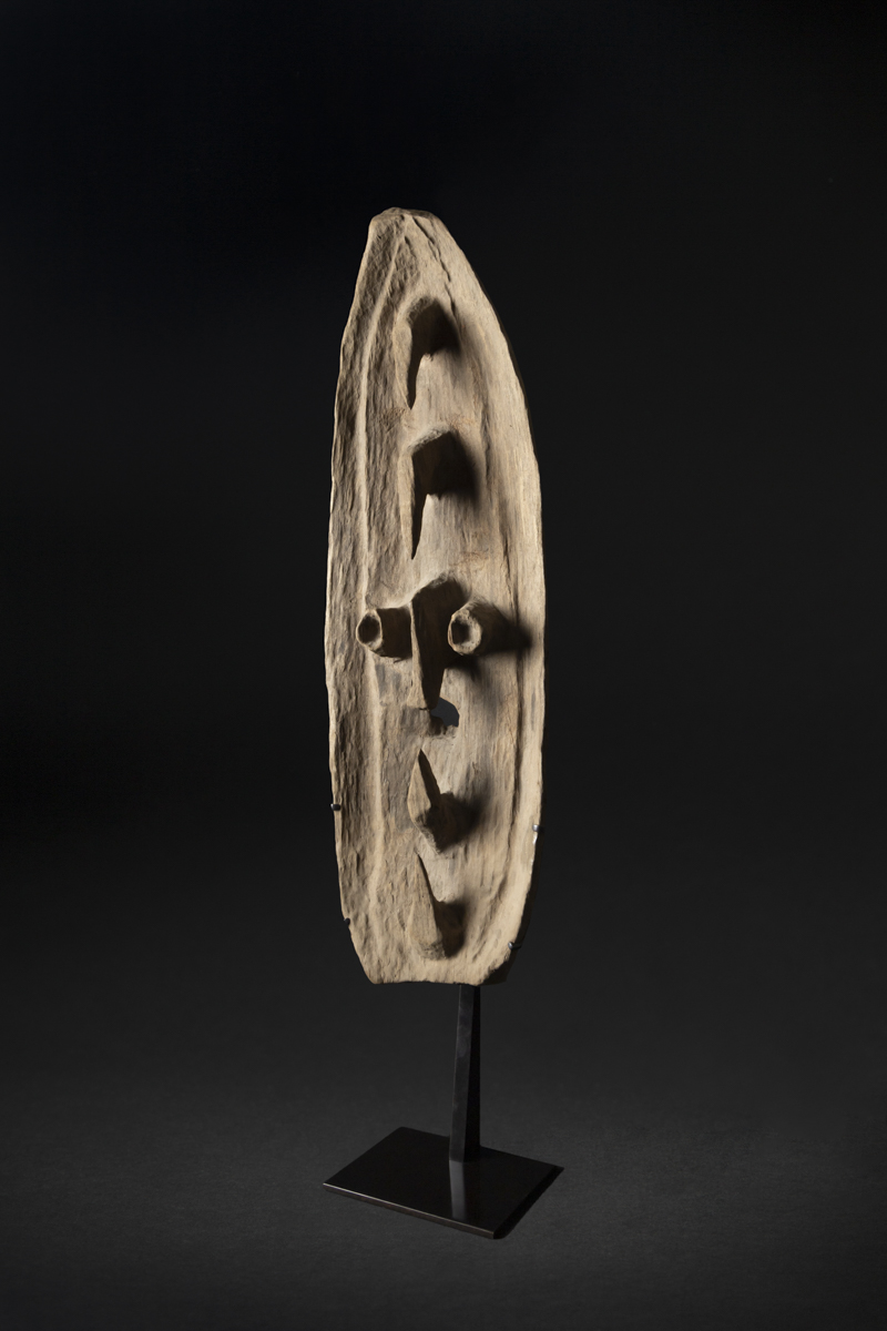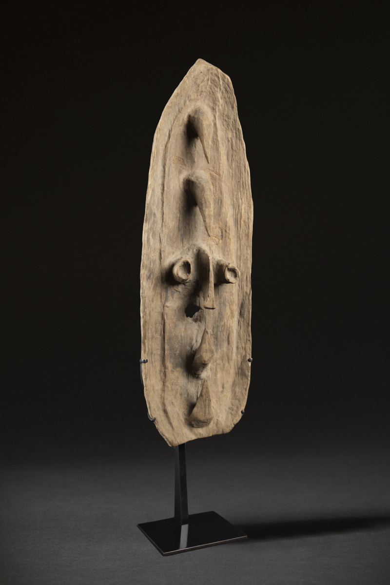 Each type of hook-mask figure is broadly associated with a different category of spirits. While interpretation of their imagery varies, the hook features of the flat mask panels are typically interpreted as hornbill’s beaks, while the longer, more extended images tend to be identified as stylized catfish, the hooks representing their curling whiskers. The flat, mask-like images were the focus of male initiation rites and hunting and were linked to senior men, elders of the clan and forest spirits. The association with hornbills derives from the fact that the birds nest in locations where bush spirits are known to dwell. Furthermore, the consumption of hornbills themselves, as well as the use of their spectacular feathers and beaks, were the reserve of initiated elders. When not in use, the images were stored in the men’s ceremonial house along with other sacred objects or suspended from the rafters, safely concealed from uninitiated eyes. The more slender hooklike figures tend to be associated with water spirits and were ideally immersed in swamps or other watery places. Although all garra figures fall into these two broad categories, each portrays a specific spirit whose name and powers were intimately known to the individual man who owned it.